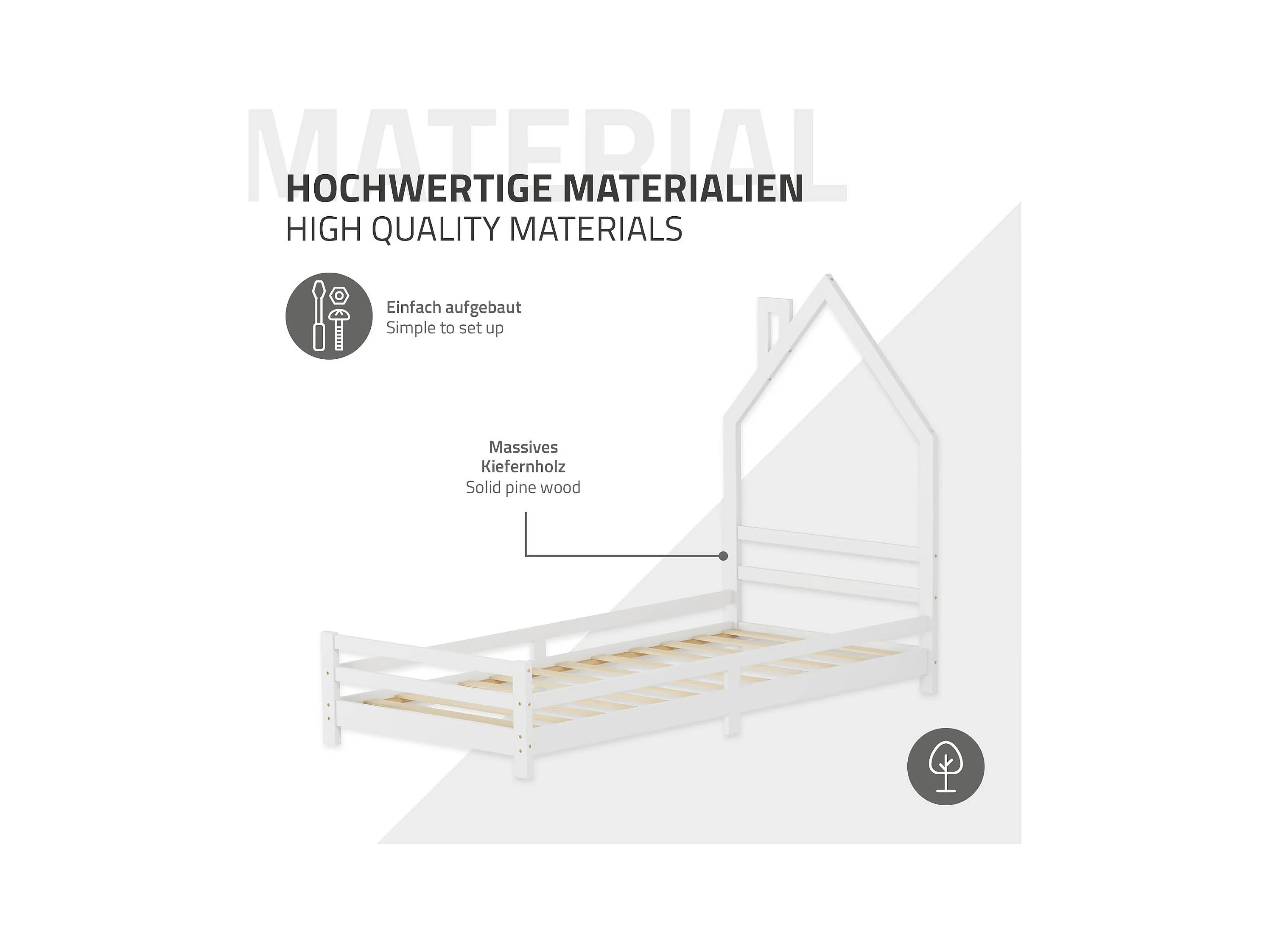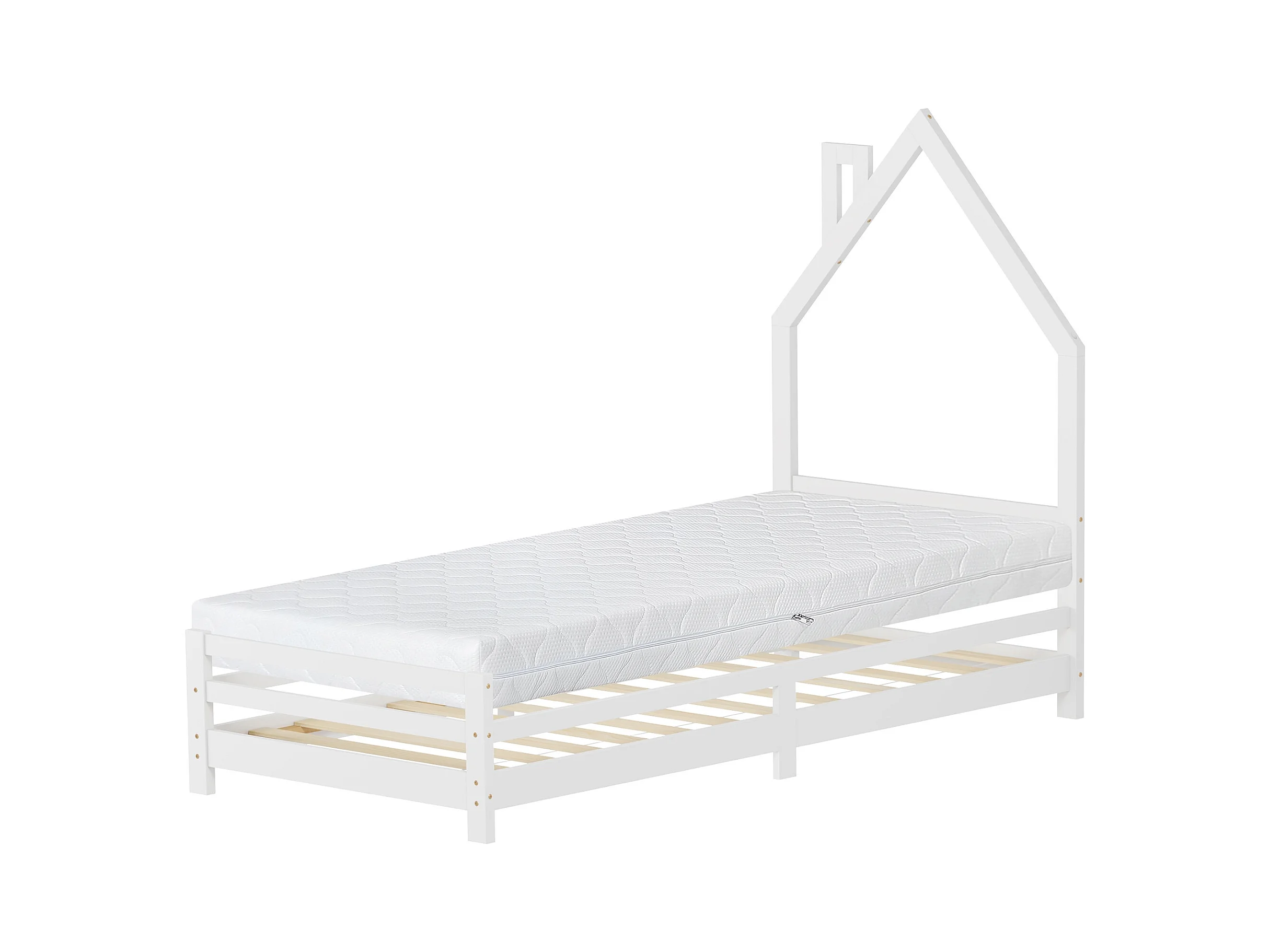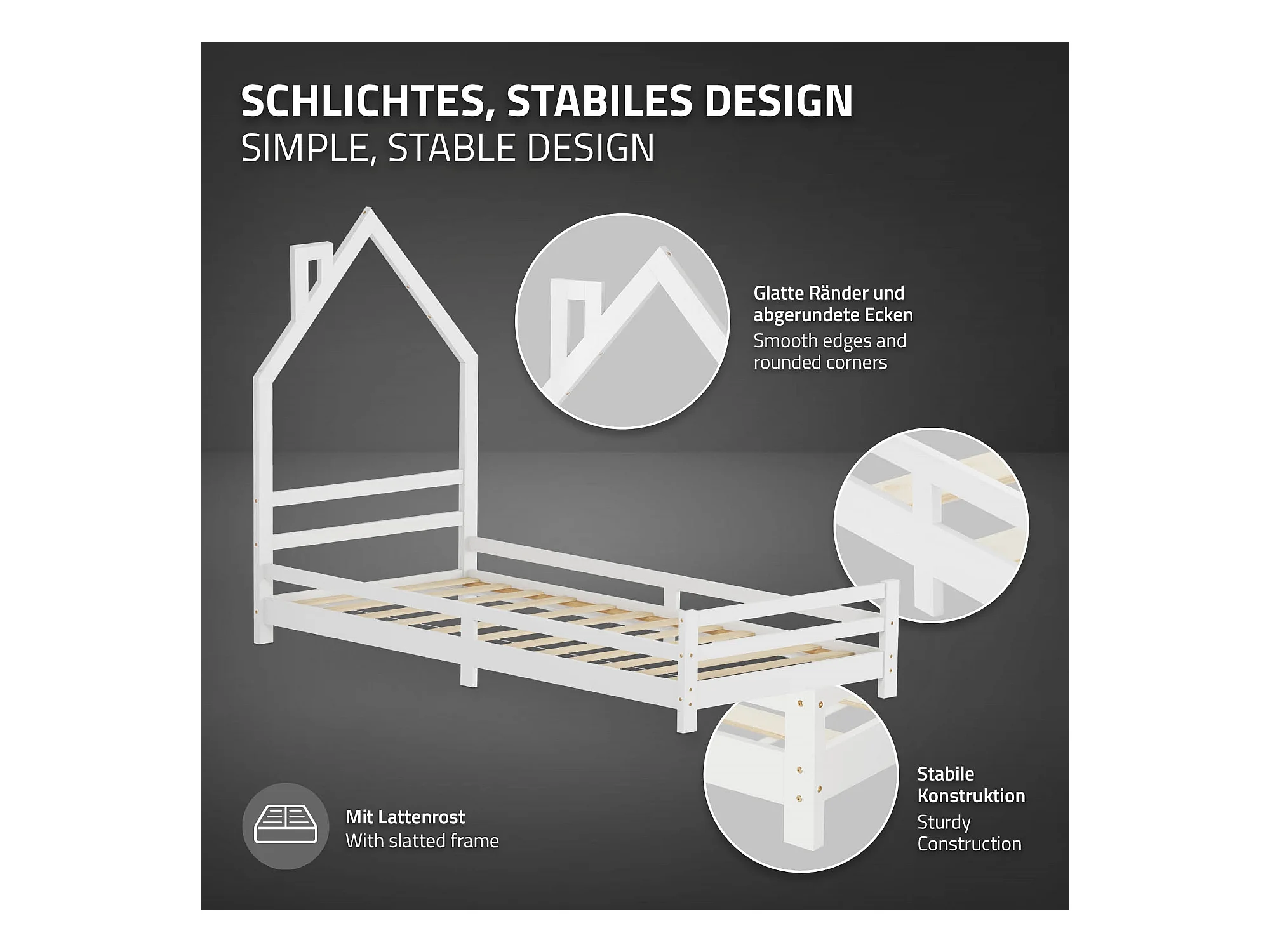 Lit d'enfant 90x200 cm avec matelas H16 cm en mousse cadre blanc en bois design de maison pin massif robuste avec sommier à lattes et filet de but