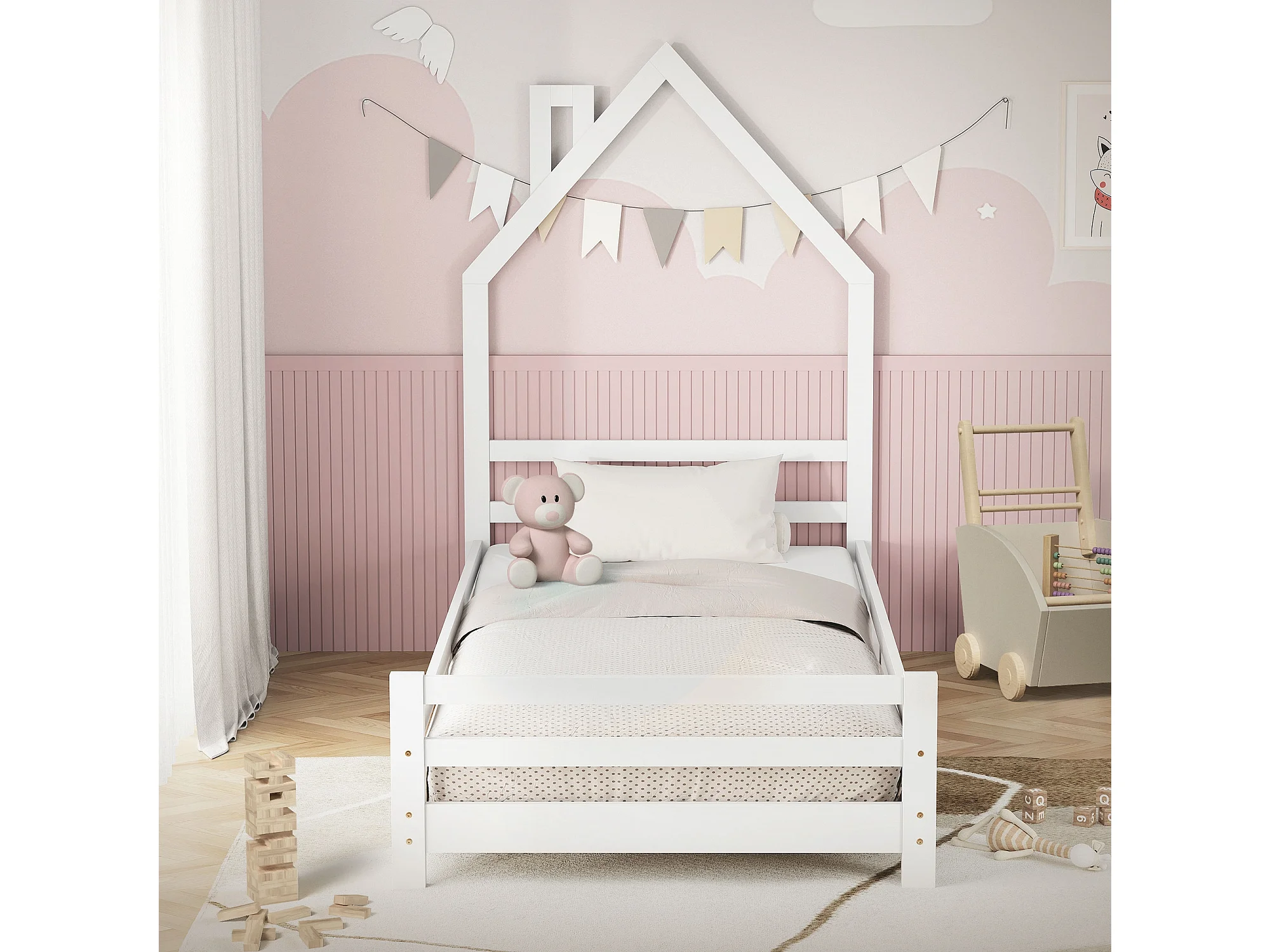 Lit cabane lit enfant 90x200cm en bois massif avec protection antichute et sommier à lattes - Blanc
