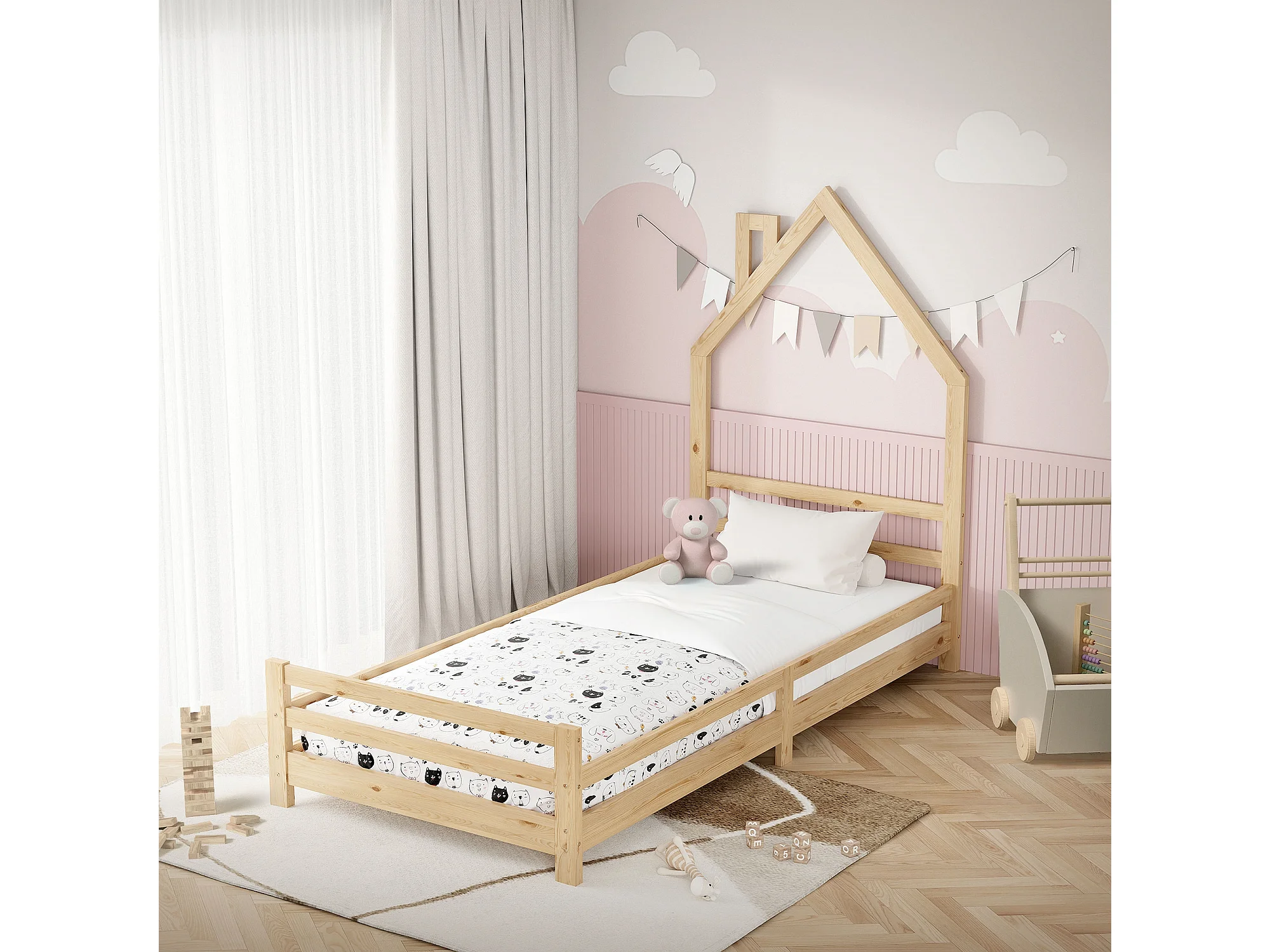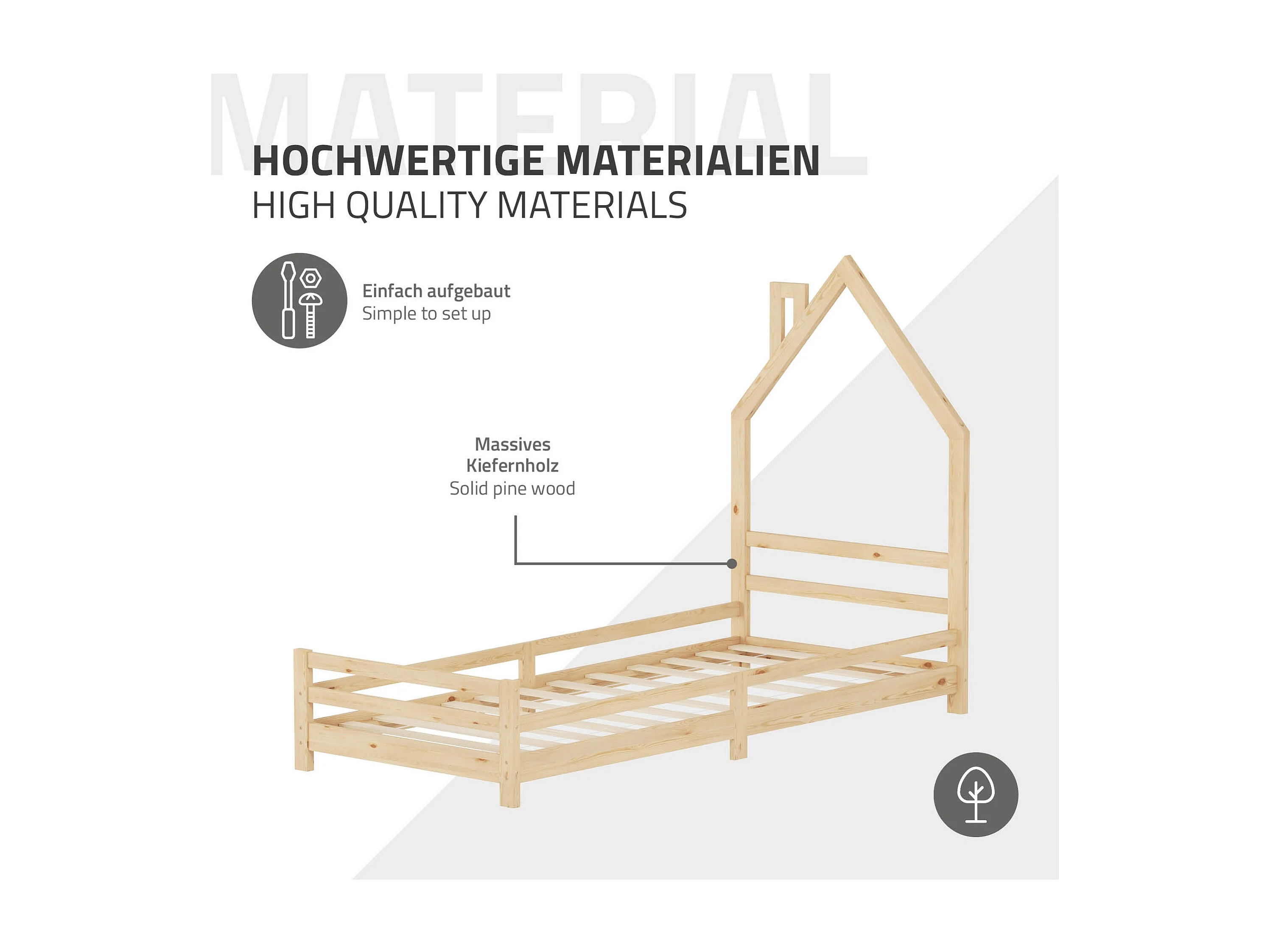 Lit cabane enfant 90x200 cm naturel, lit simple, en forme de maison en bois, sans matelas