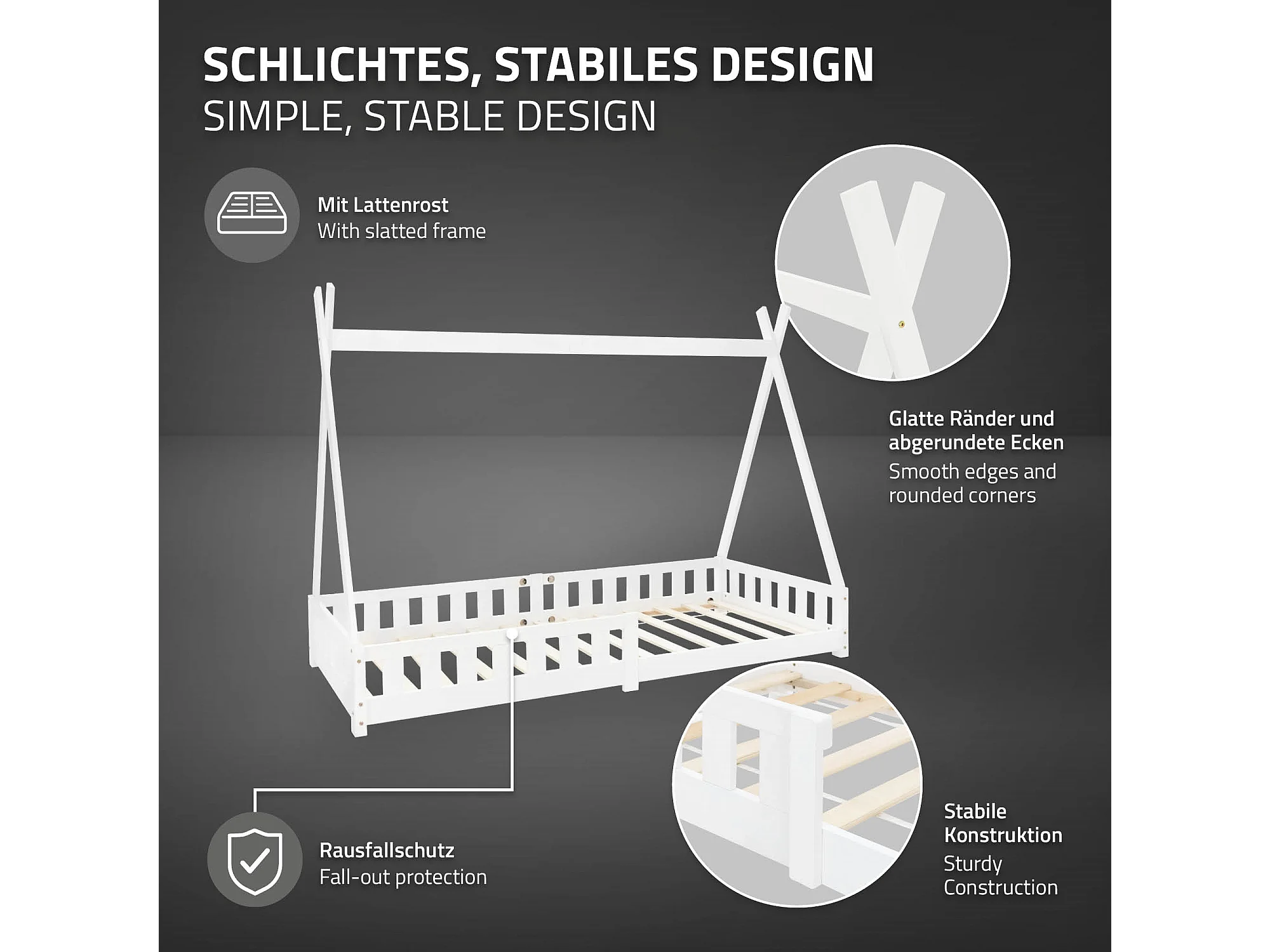 Lit d'enfants Tipi 90x200 cm blanc style indien cadre en bois de pin massif avec matelas H:10 cm hypoallergénique housse amovible et sommier à lattes
