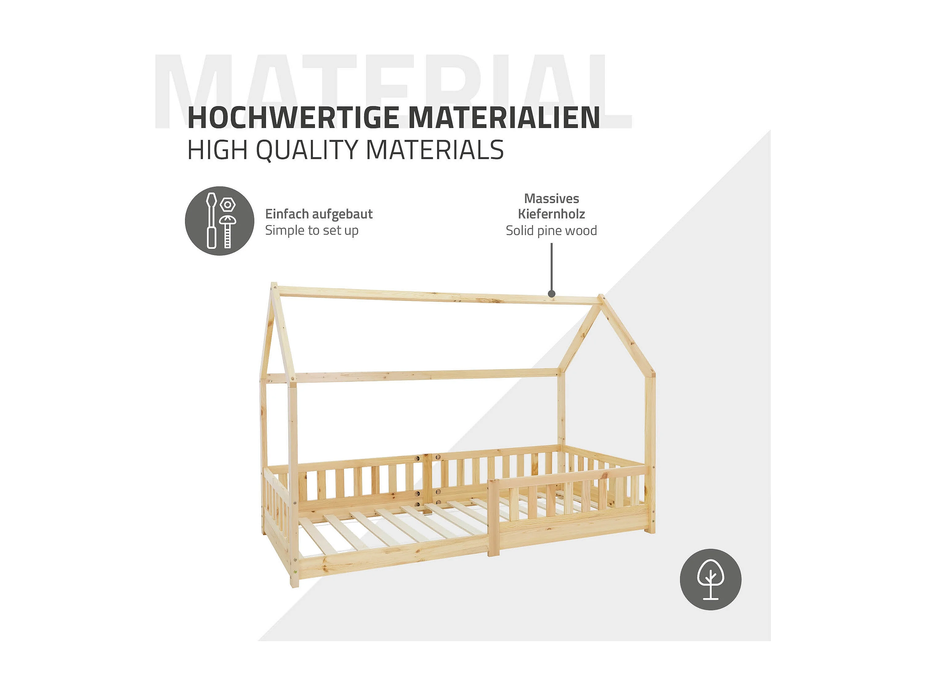 Lit d'enfants 90x200 cm style maison naturel bois de pin massif avec matelas H:10 cm housse amovible sommier protection anti-chute pour filles garçons