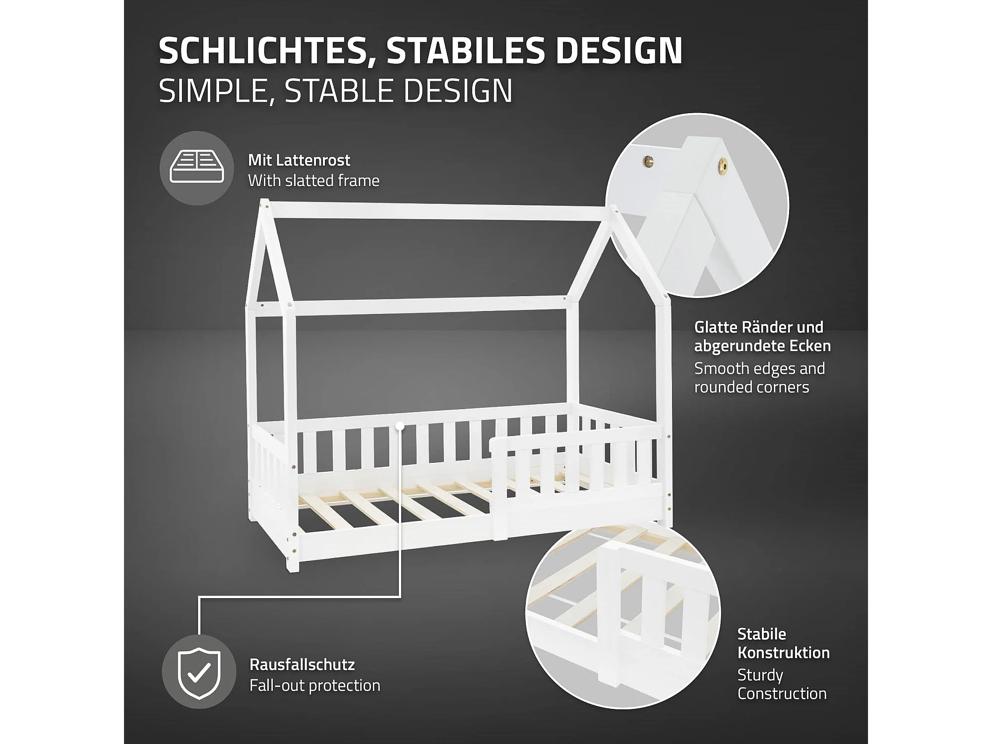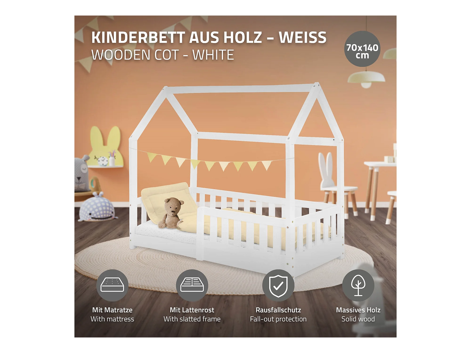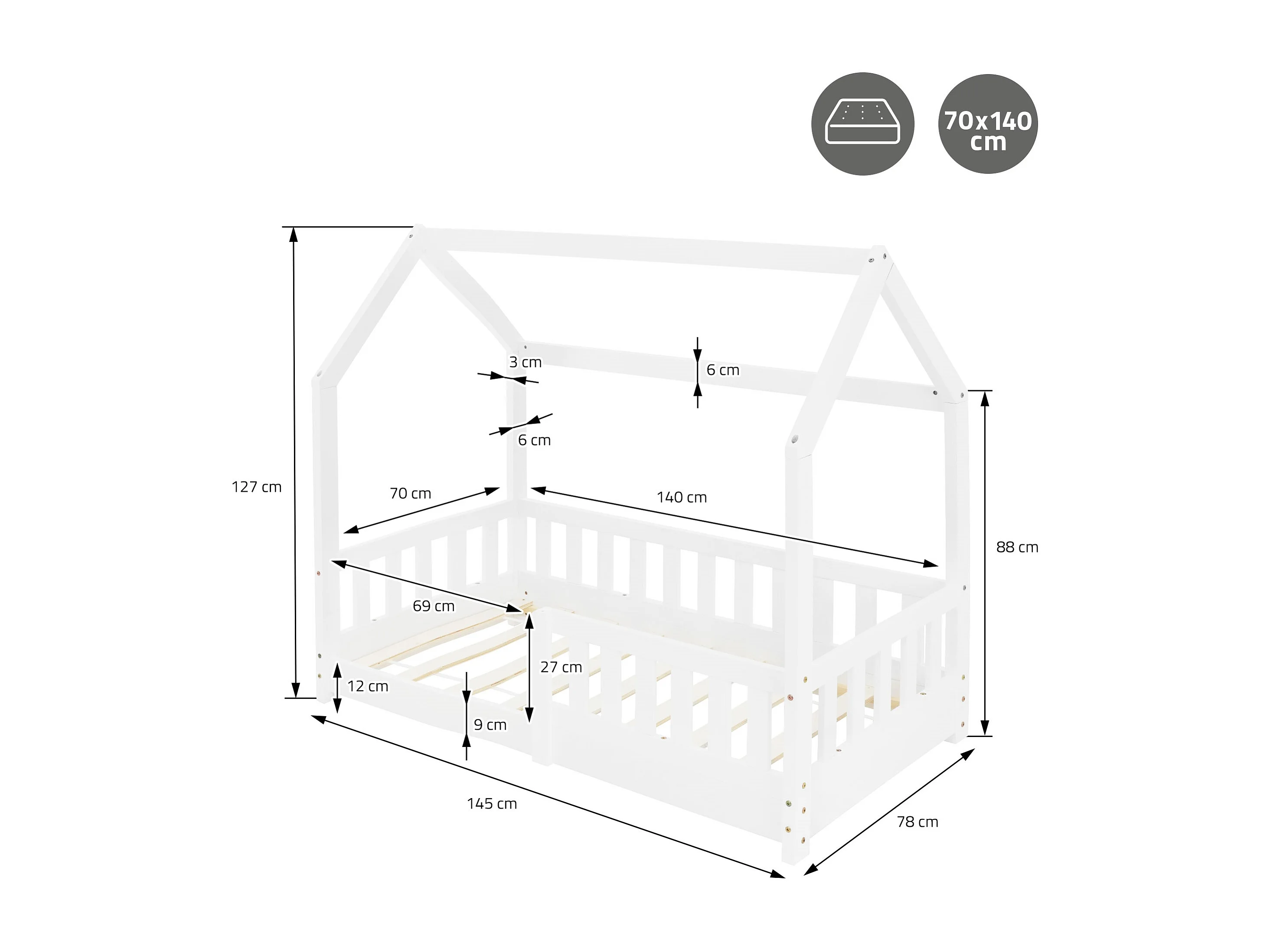 Lit d'enfants 70x140 cm blanc forme de maison en bois de pin massif avec matelas housse amovible sommier à lattes anti-chute pour filles garçons