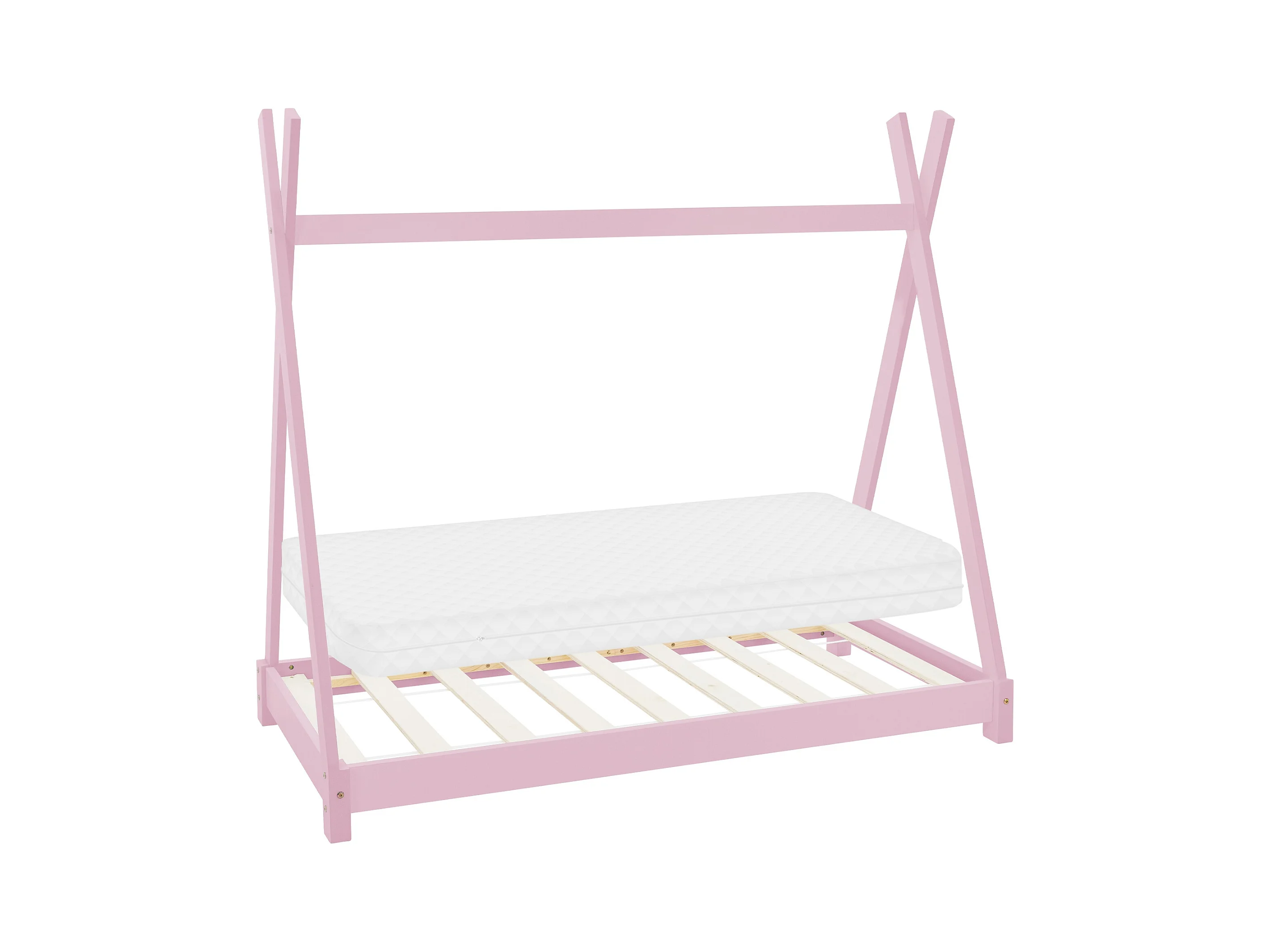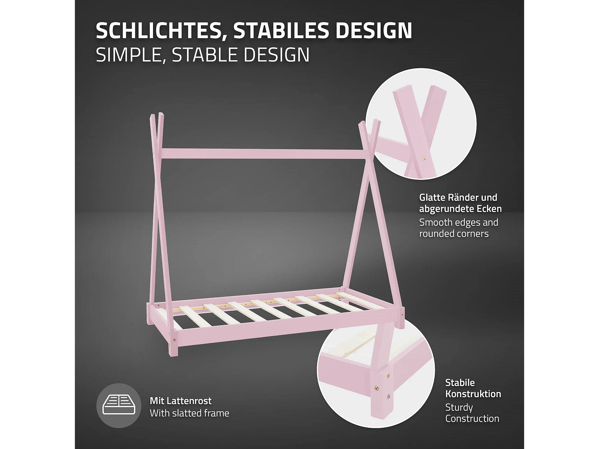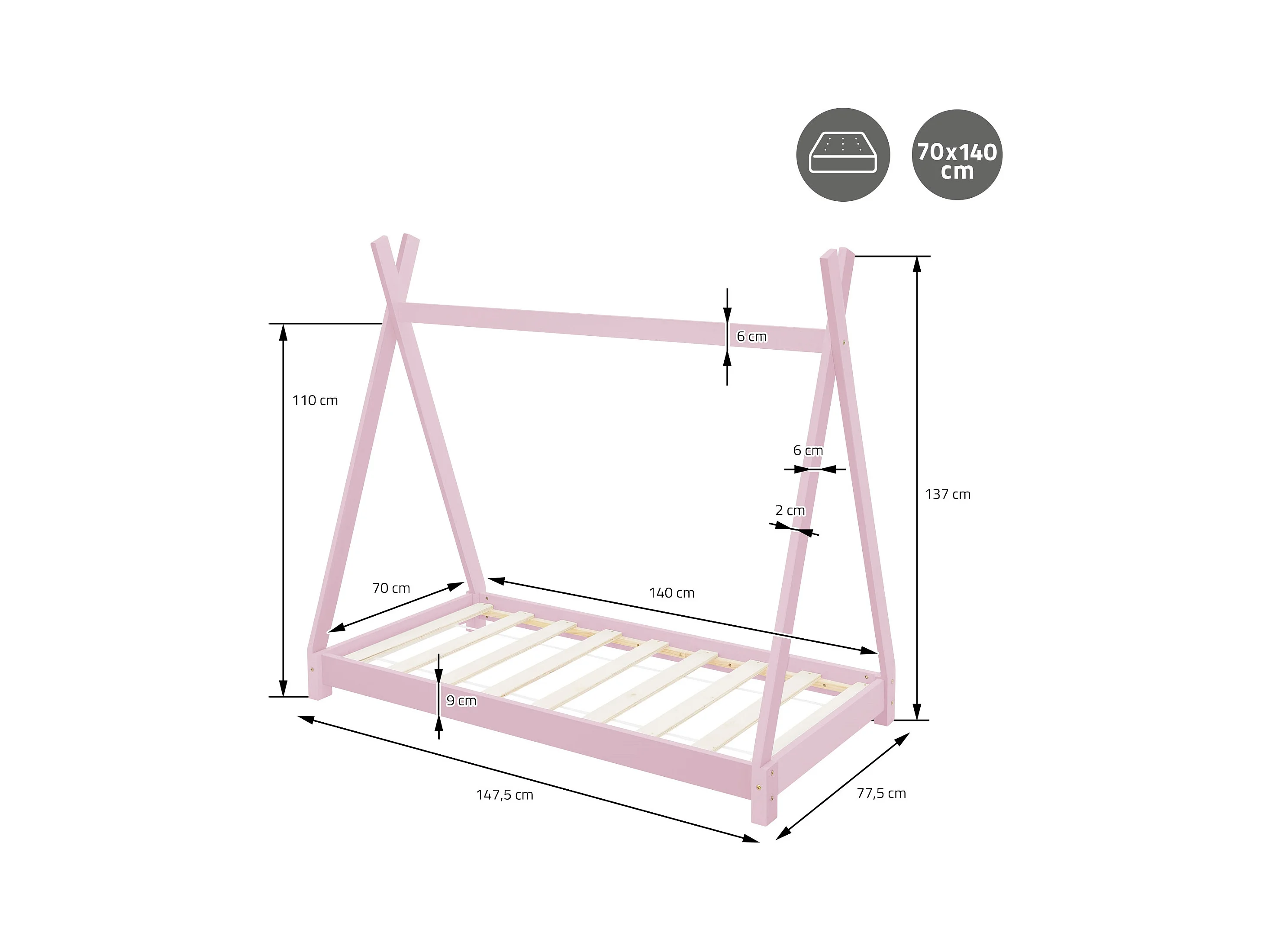 Lit d'enfants Tipi 70x140cm rose style indien cadre bois de pin massif avec matelas hypoallergénique housse amovible respirant et sommier à lattes