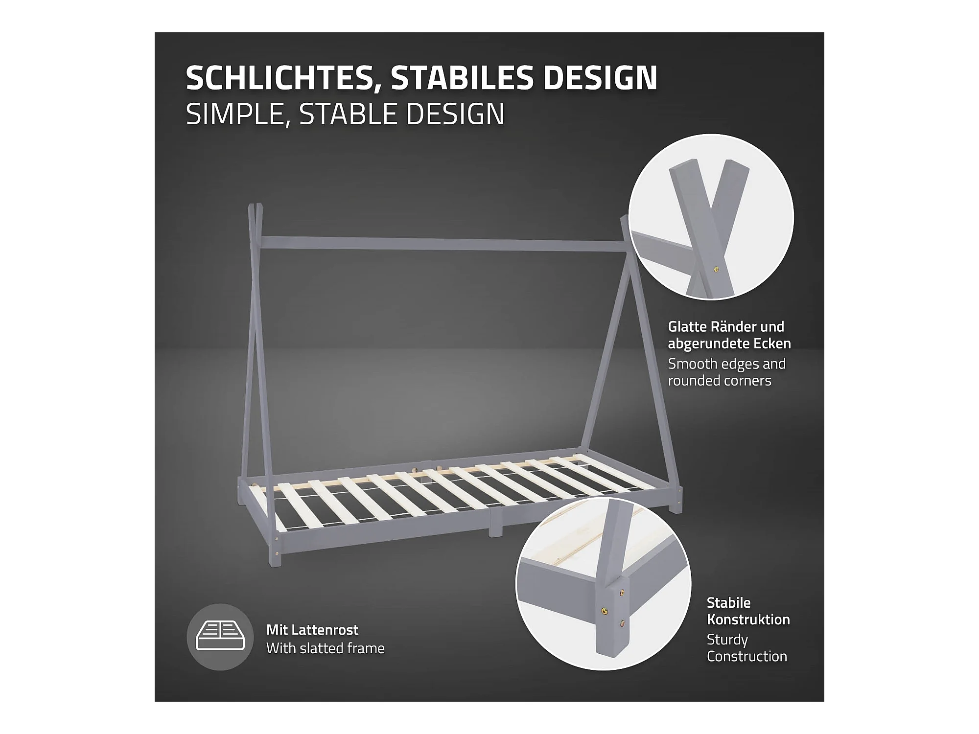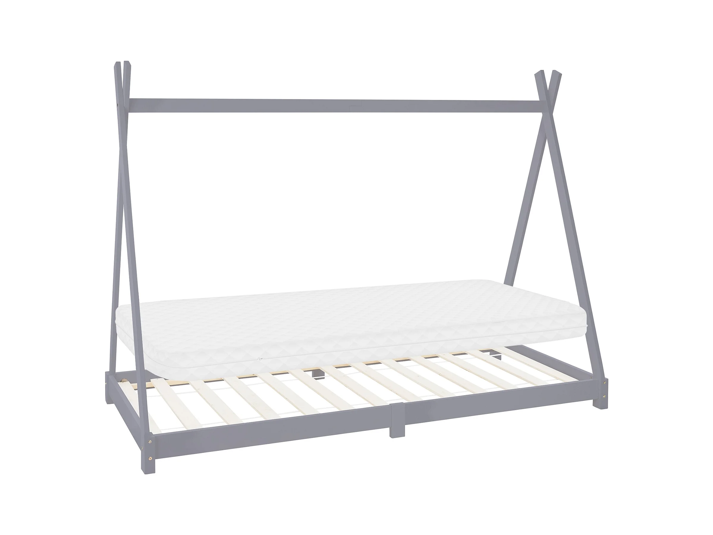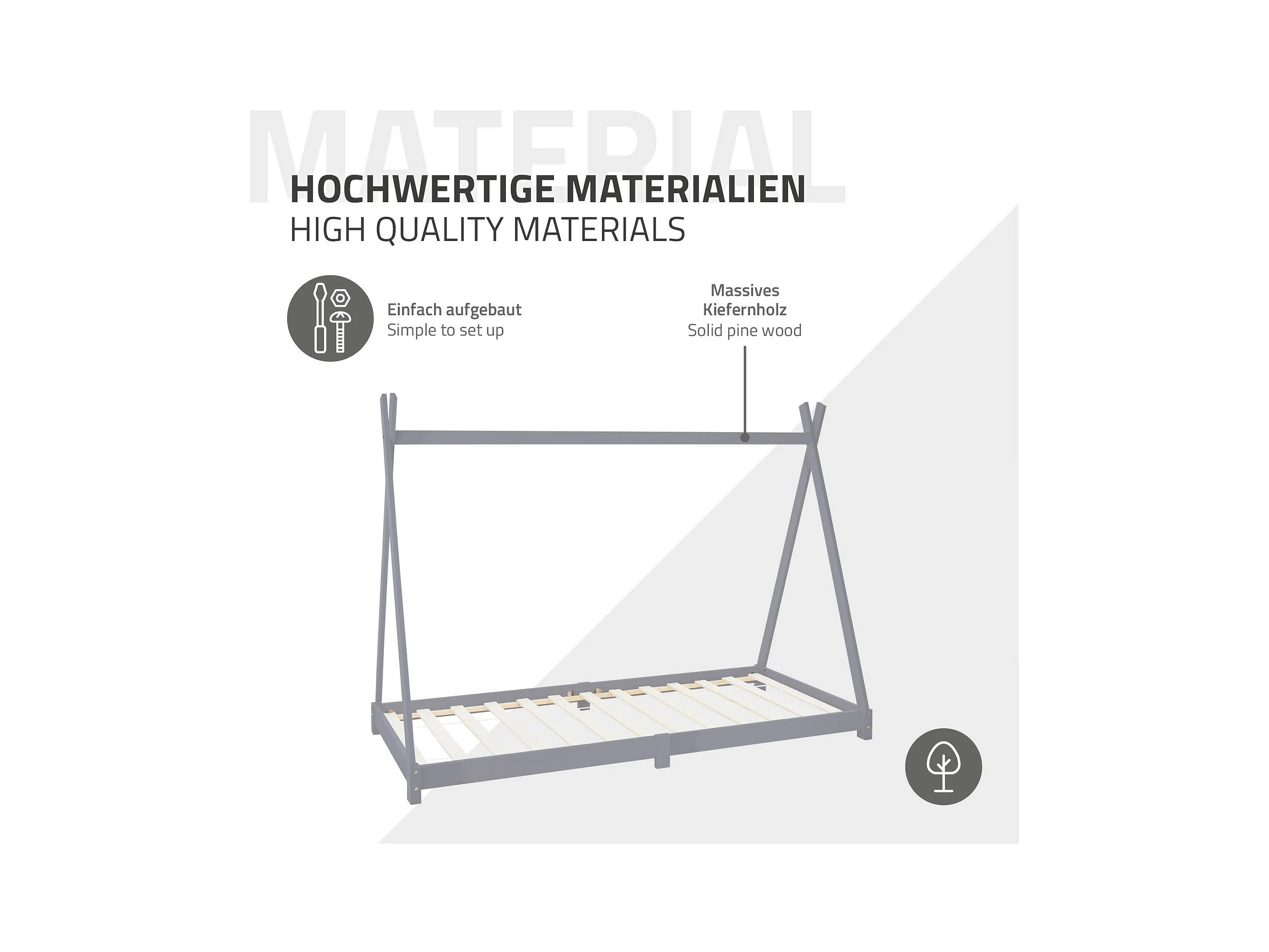 Lit d'enfants Tipi 90x200 cm gris clair cadre style indien en bois de pin massif matelas H:10 cm hypoallergénique housse amovible et sommier à lattes