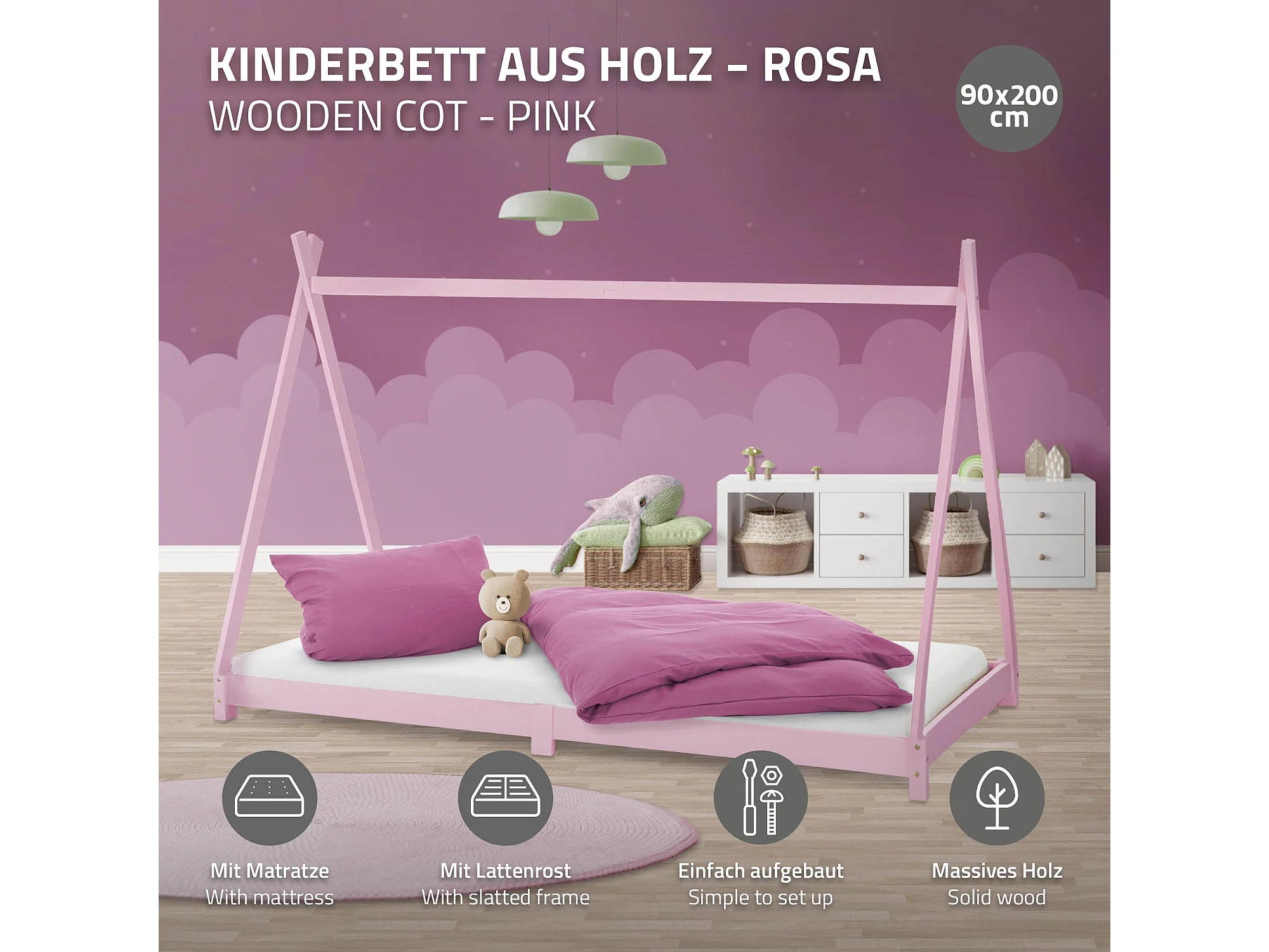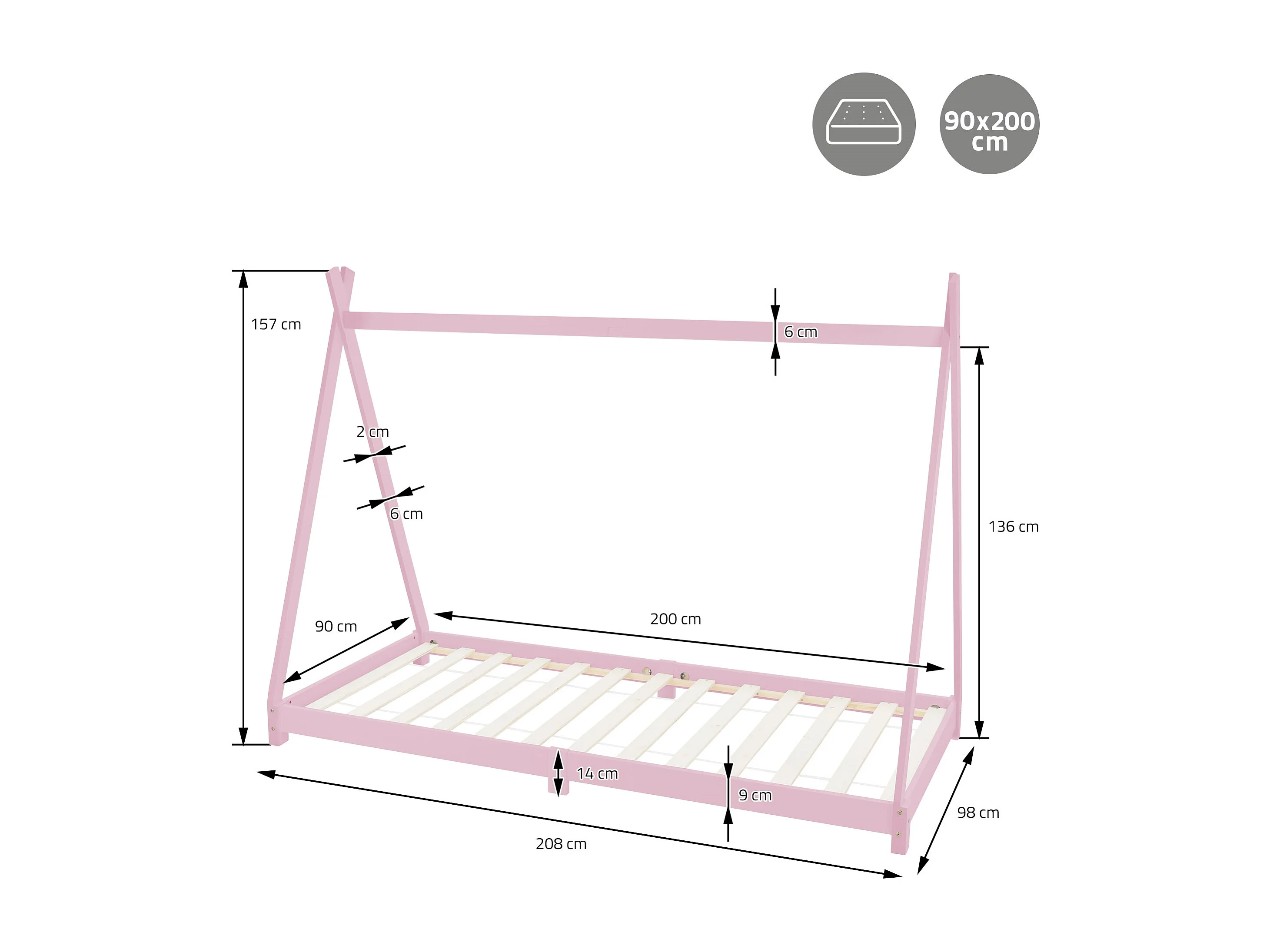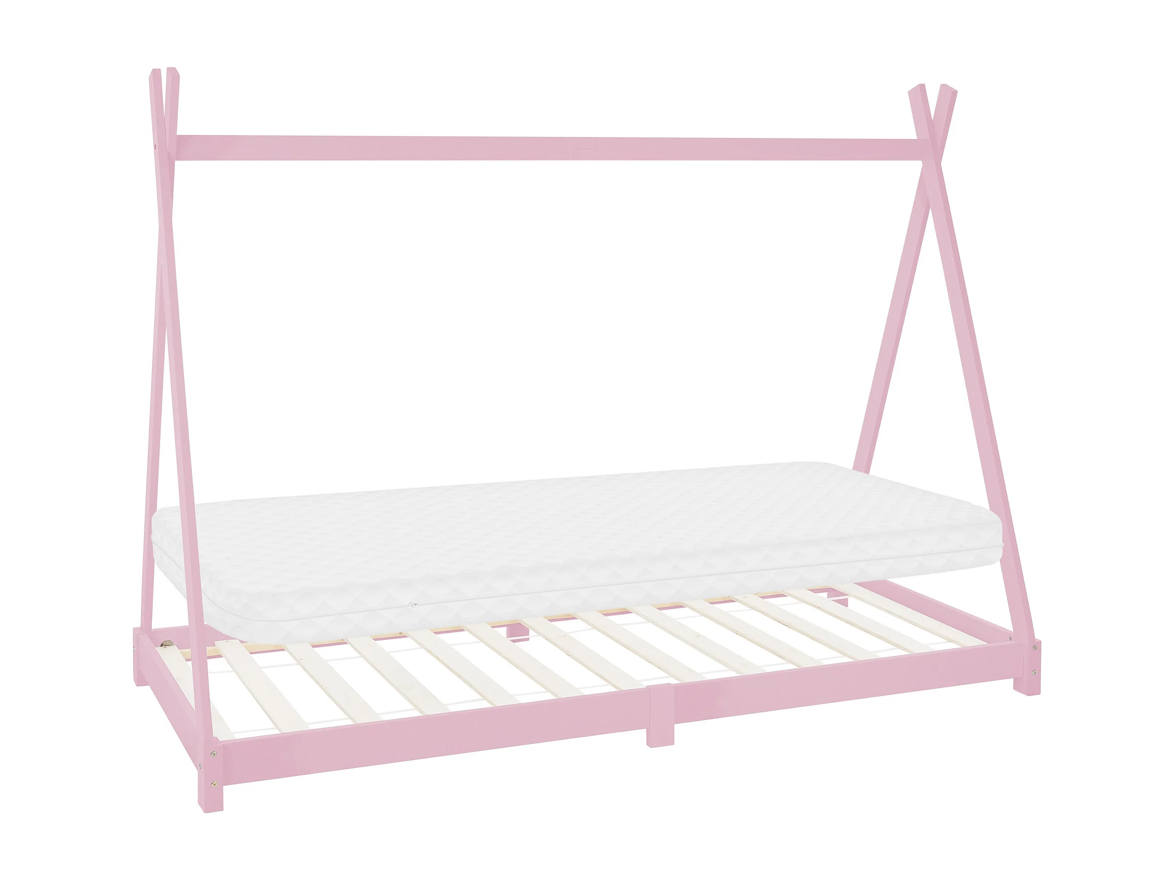 Lit d'enfants Tipi 90x200 cm rose style cadre indien en bois de pin massif avec matelas H:10 cm hypoallergénique housse amovible et sommier à lattes
