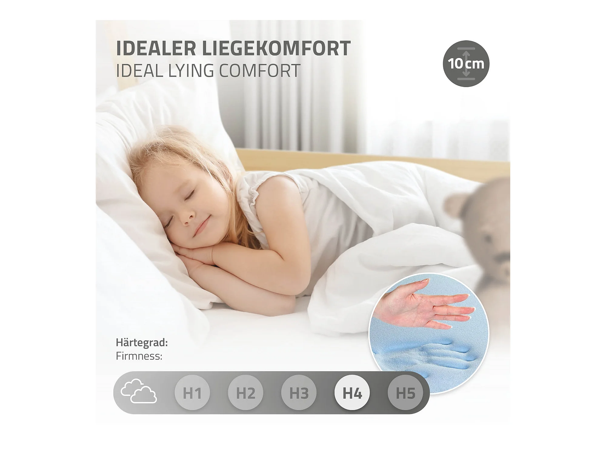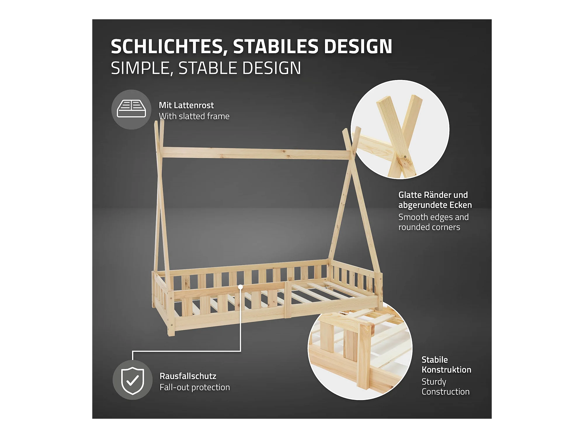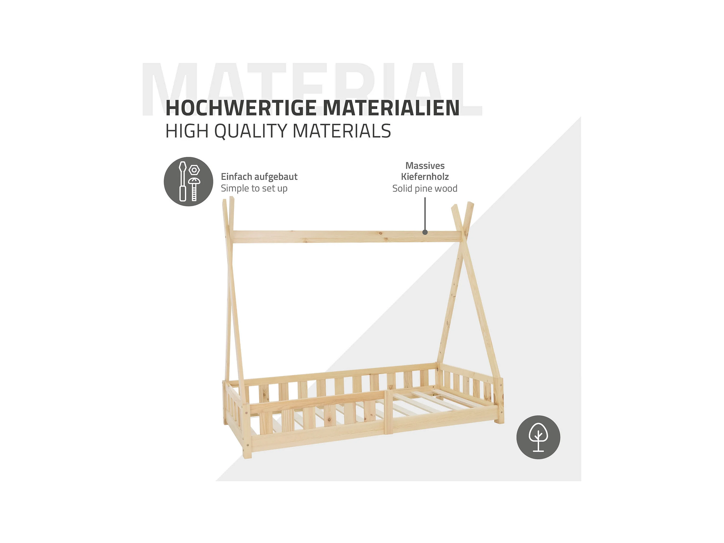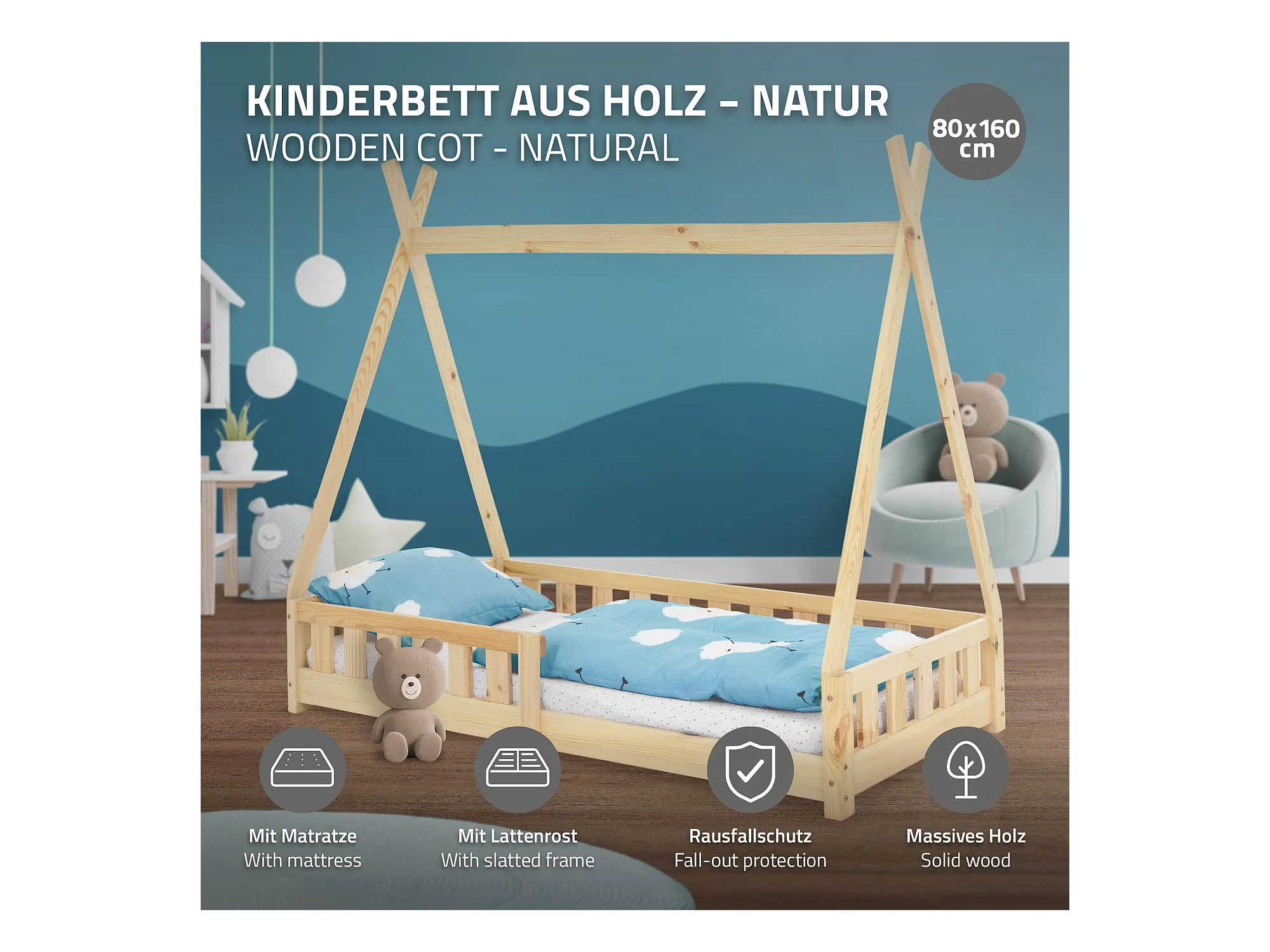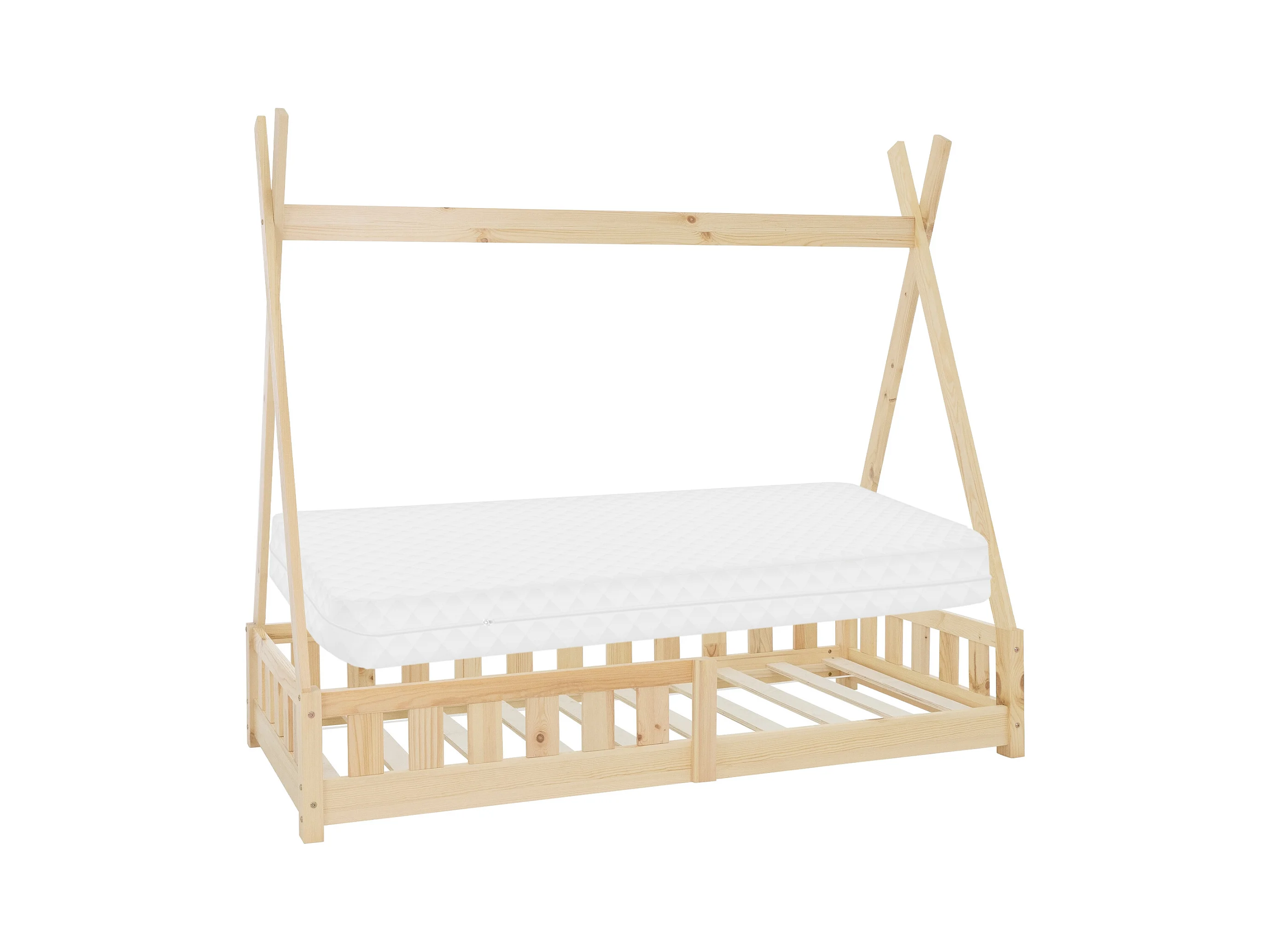 Lit d'enfants Tipi 80x160 cm naturel style indien bois de pin massif avec matelas housse amovible respirant et sommier à lattes protection anti-chute