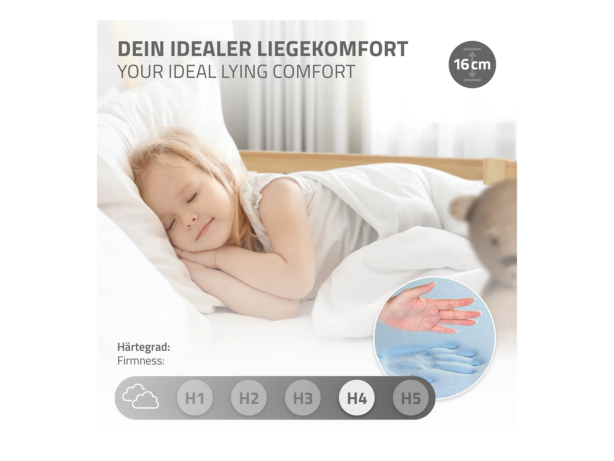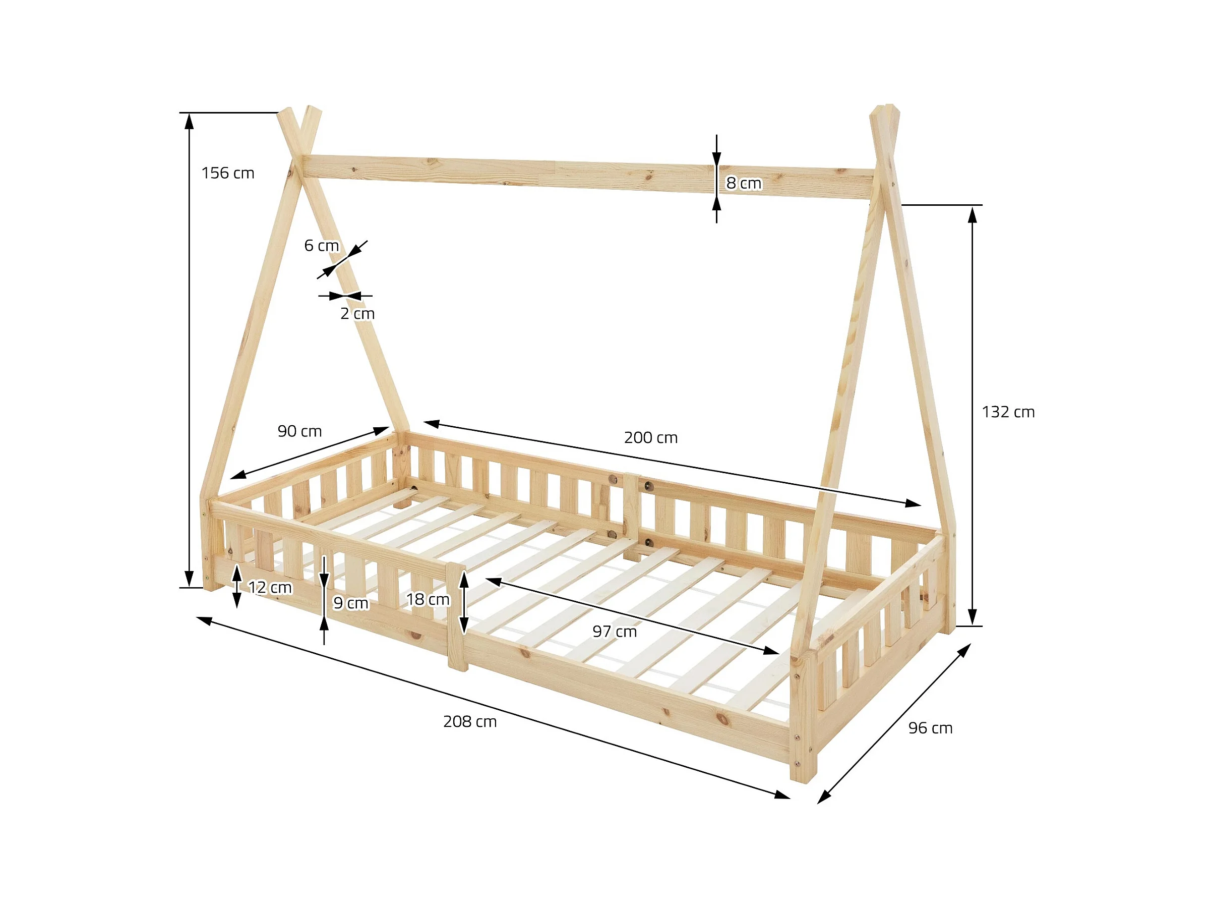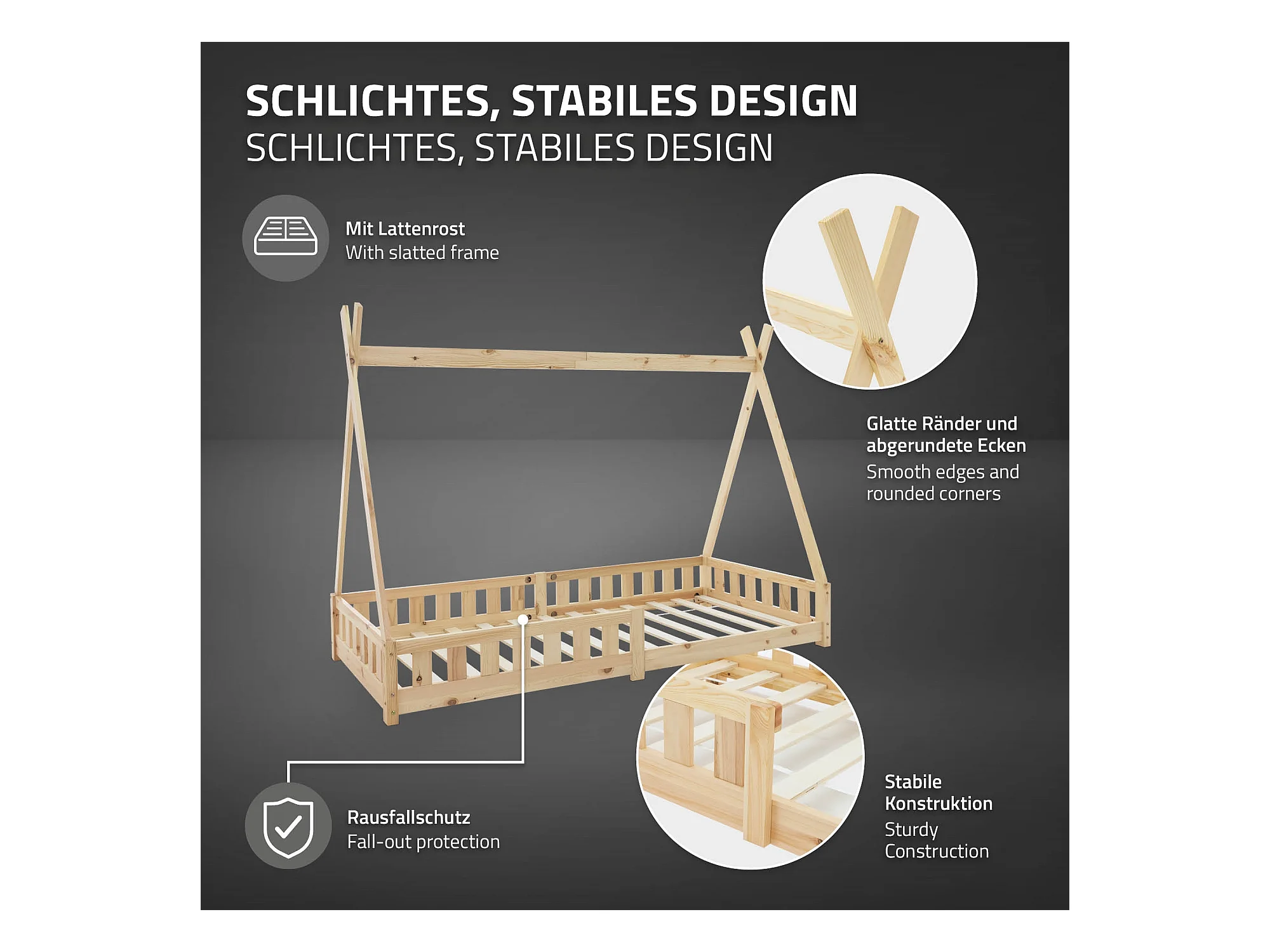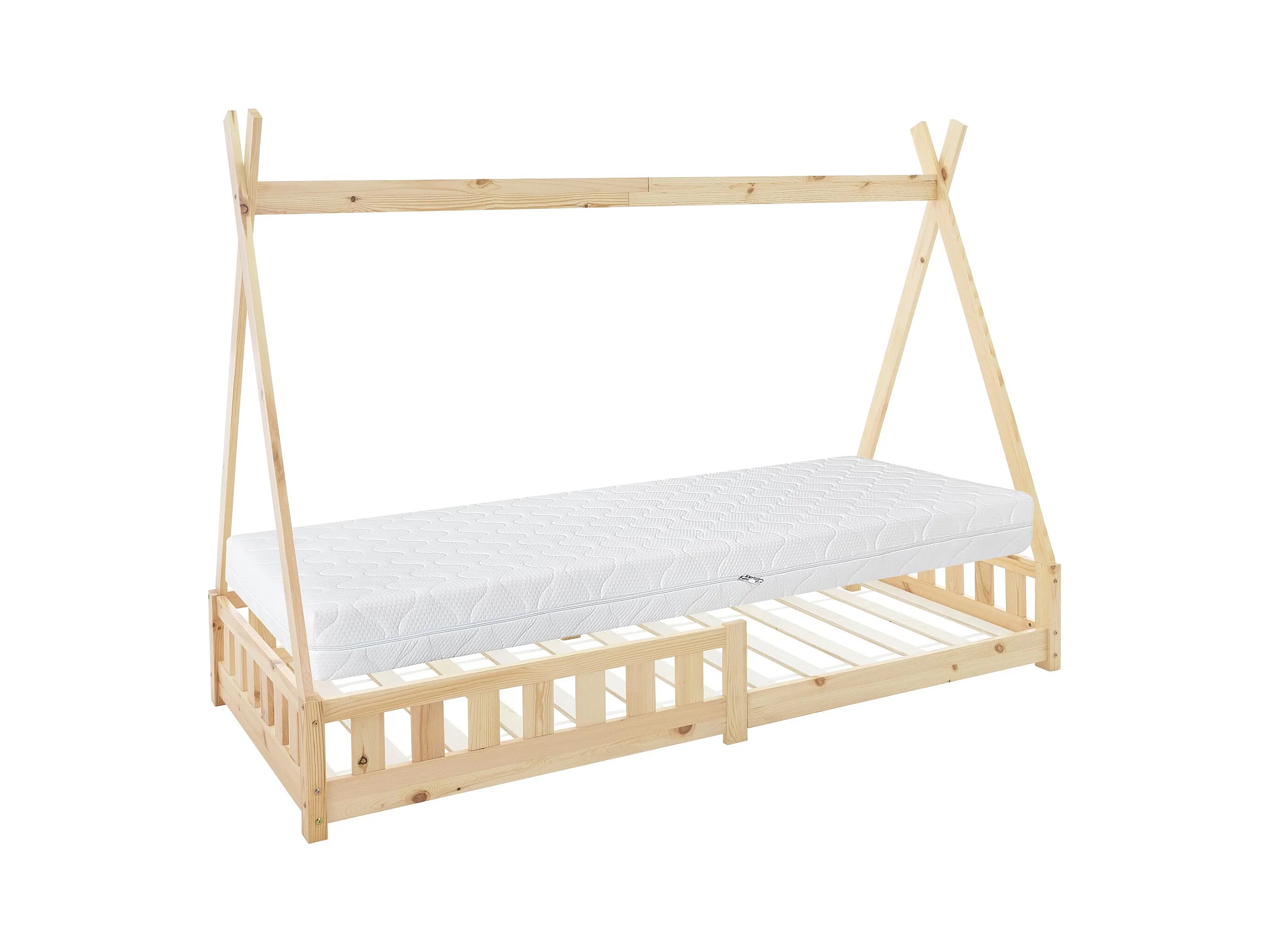 Lit d'enfants Tipi 90x200 cm naturel style indien en bois de pin massif avec matelas H:16 cm housse amovible sommier à lattes protection anti-chute