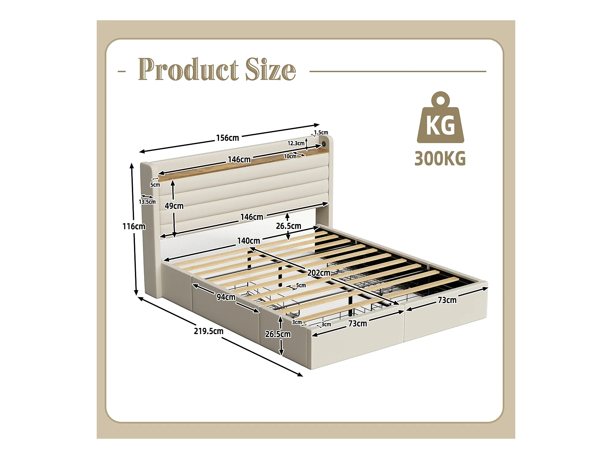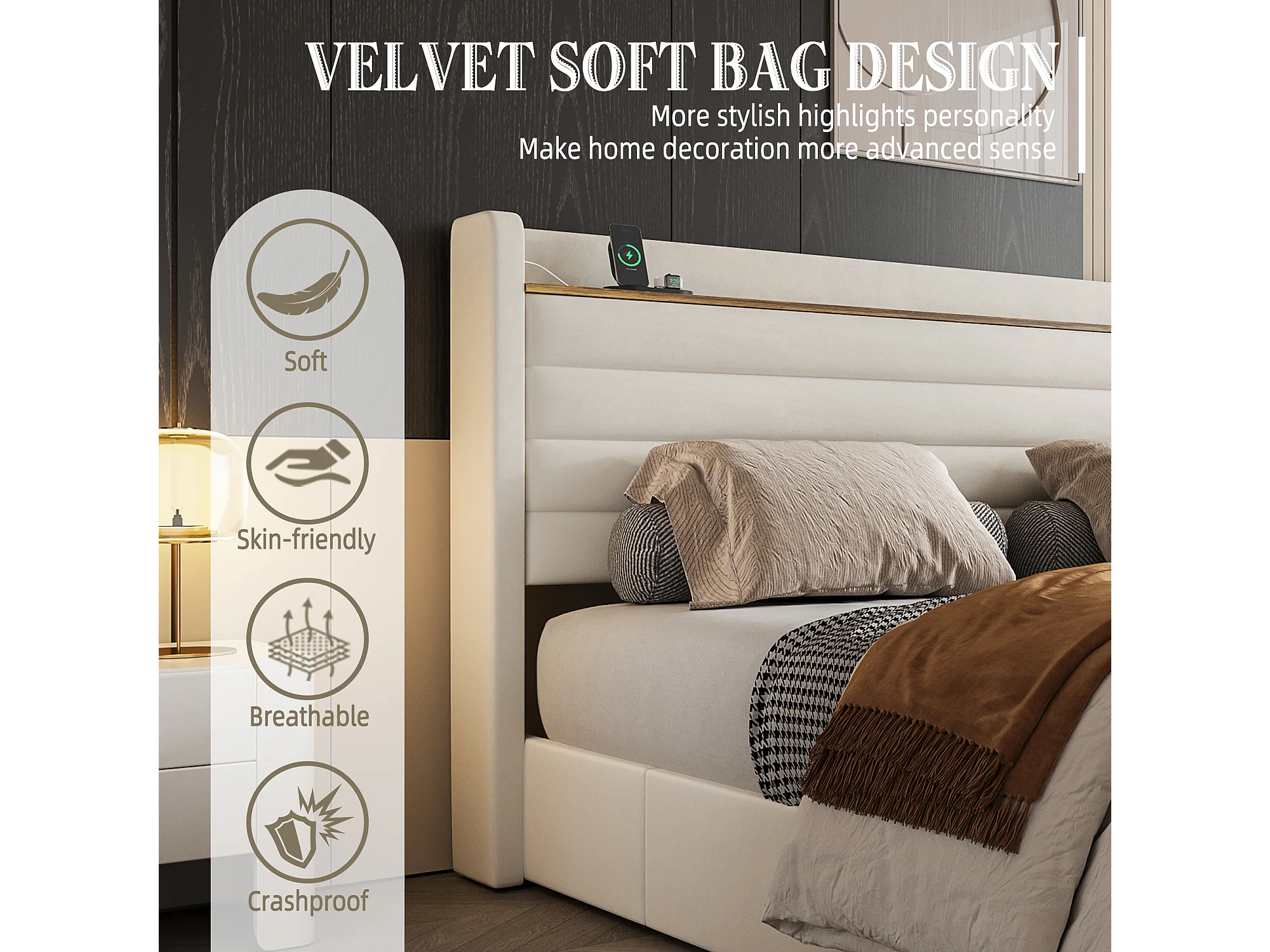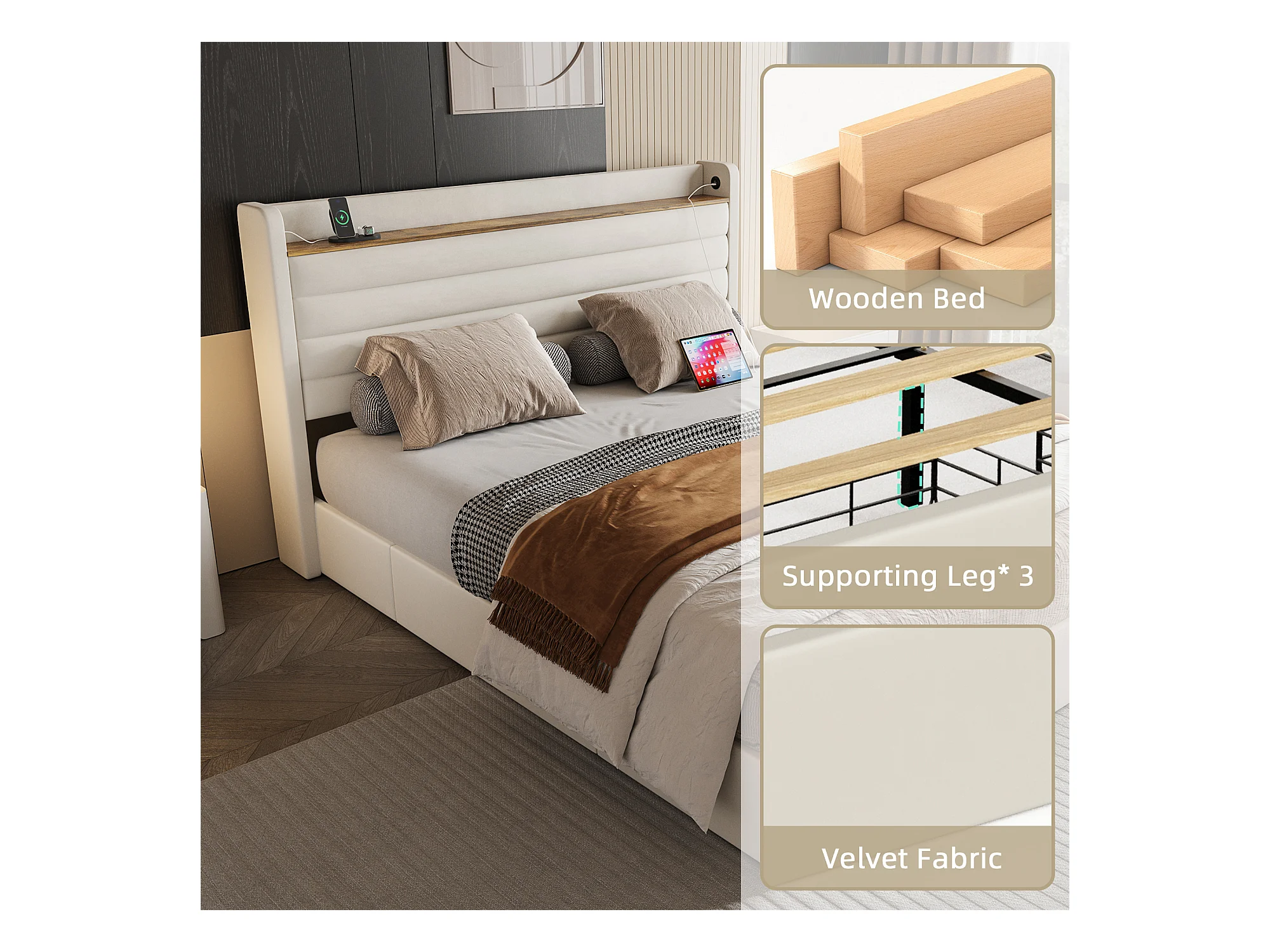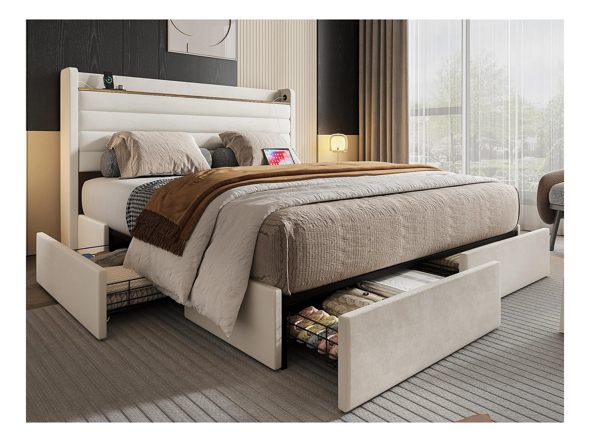 Lit Coffre 140x200 cm - Lit Rembourré en Velours Beige - avec Étagère de Tête de Lit- 4 tiroirs et port USB