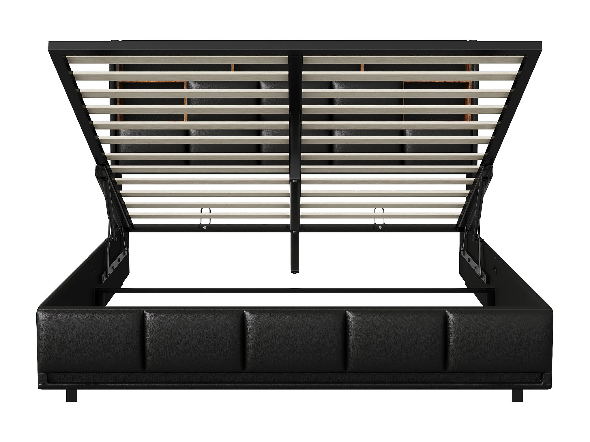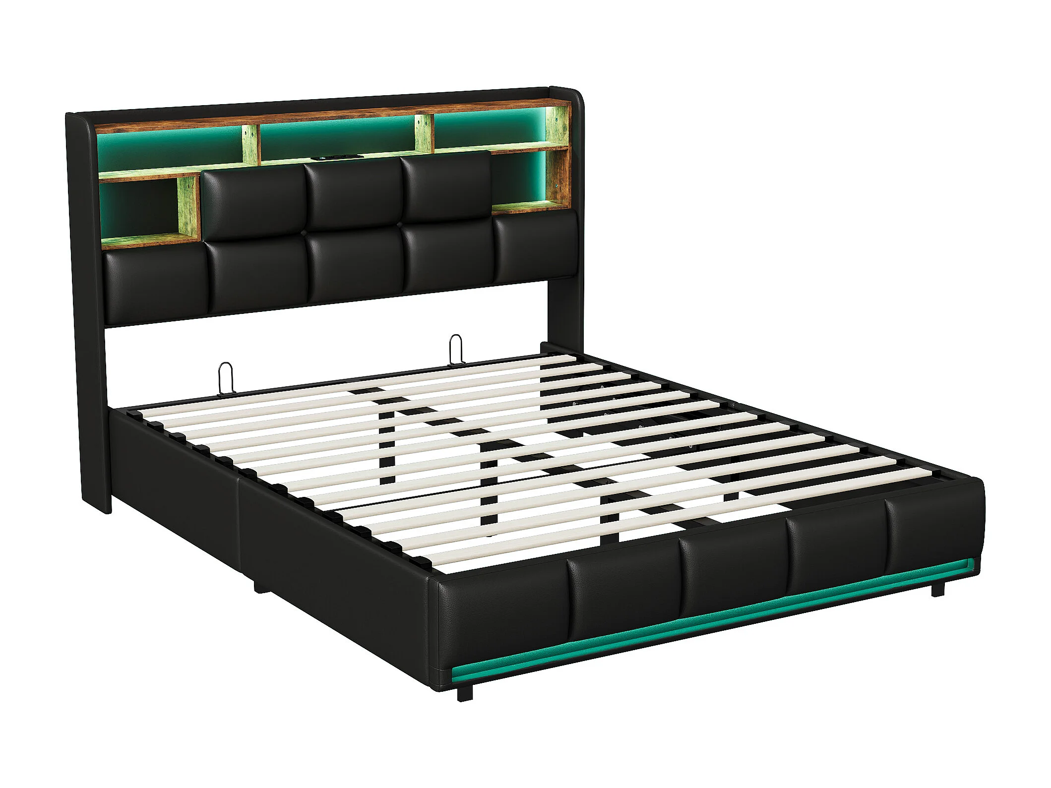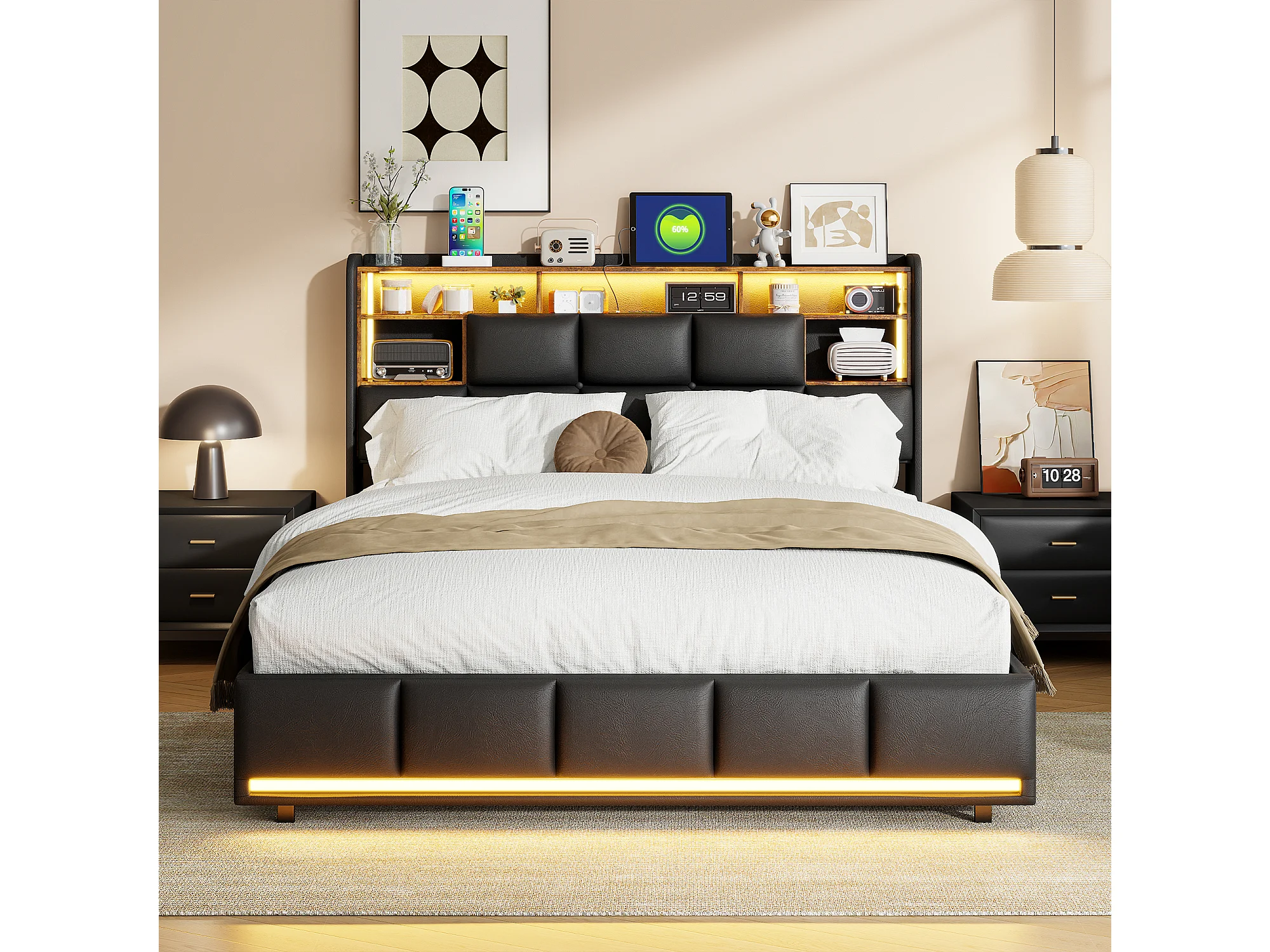Lit double 140 x 200 , bande lumineuse LED + chargeur de chevet + rangement sous le lit, noir, PU