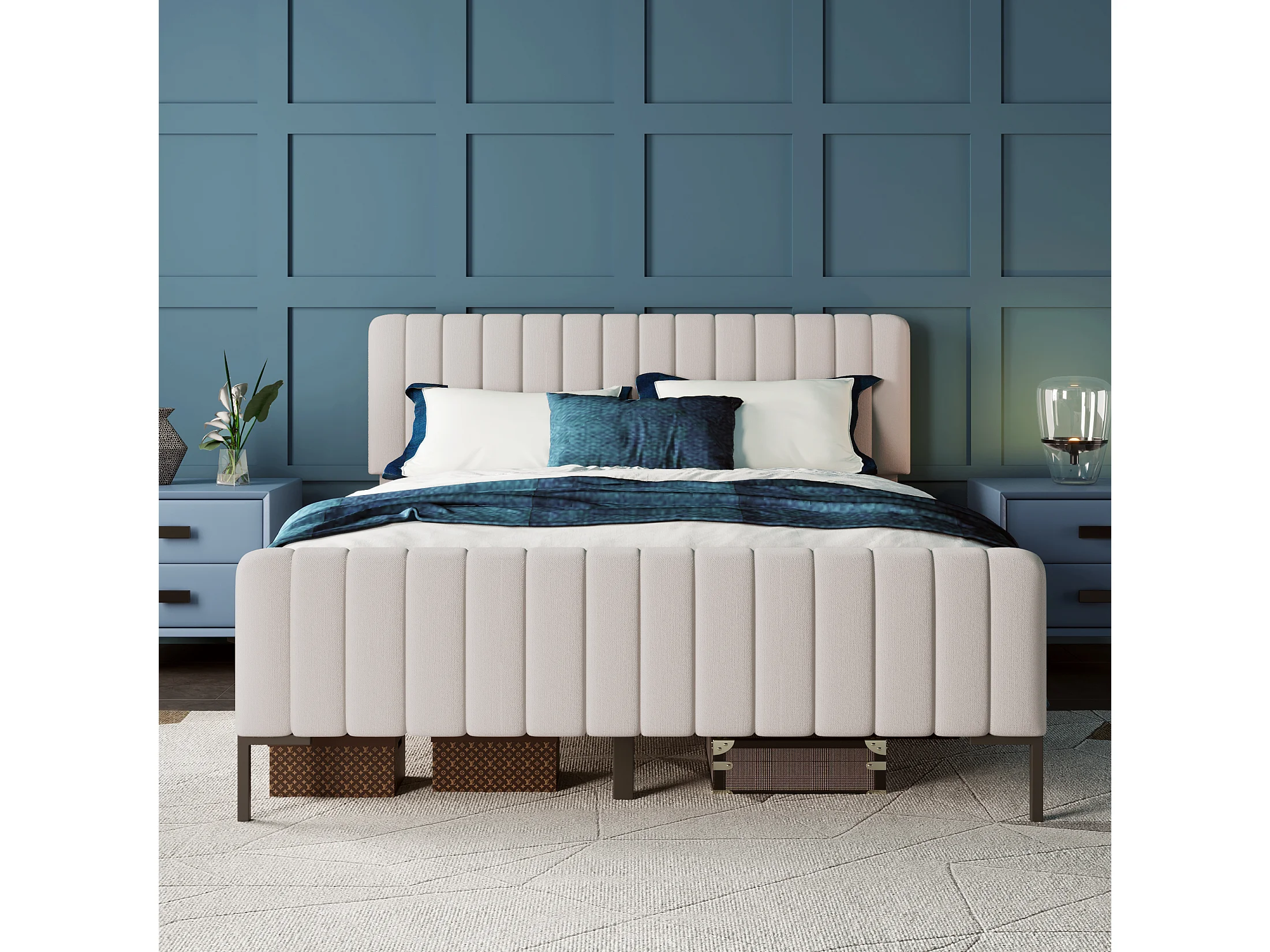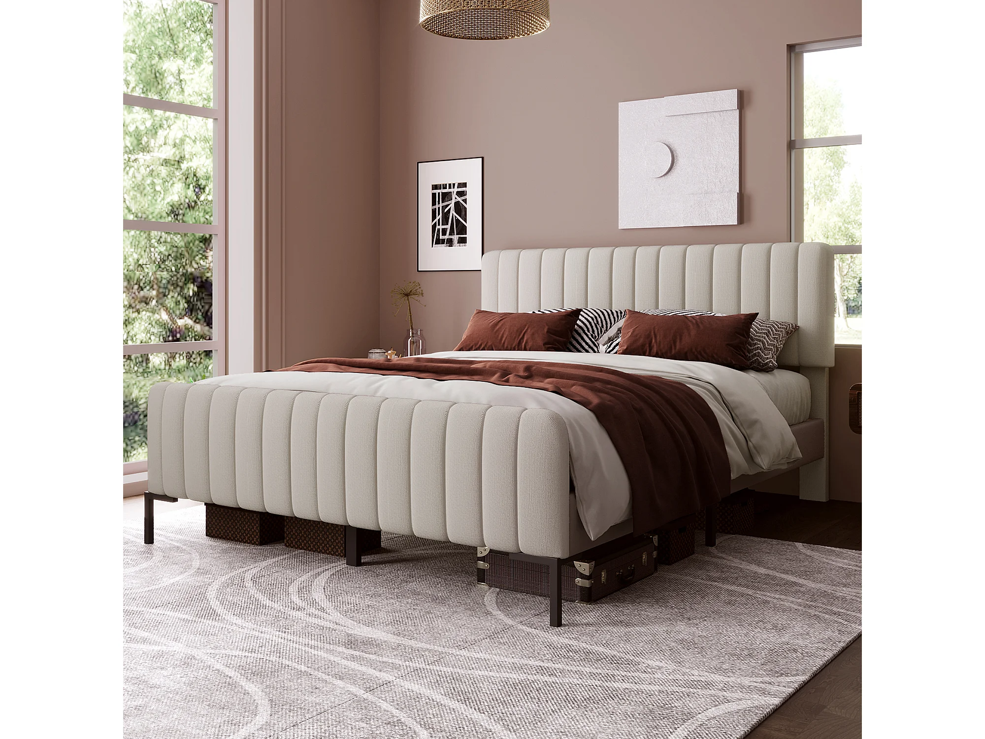 Lit double 140 x 200 cm, cadre de lit avec sommier et tête de lit réglable, lit rembourré gris-beige