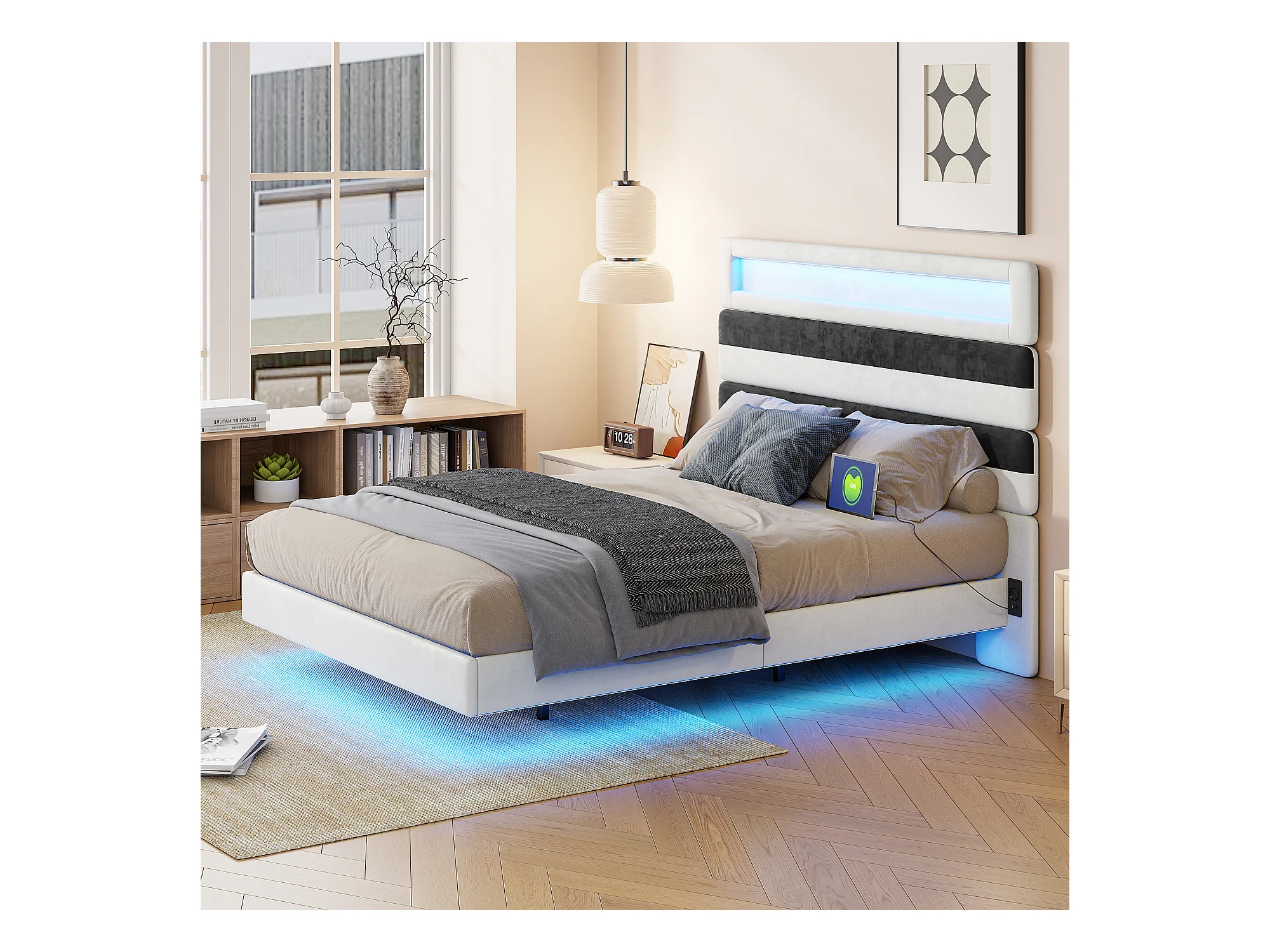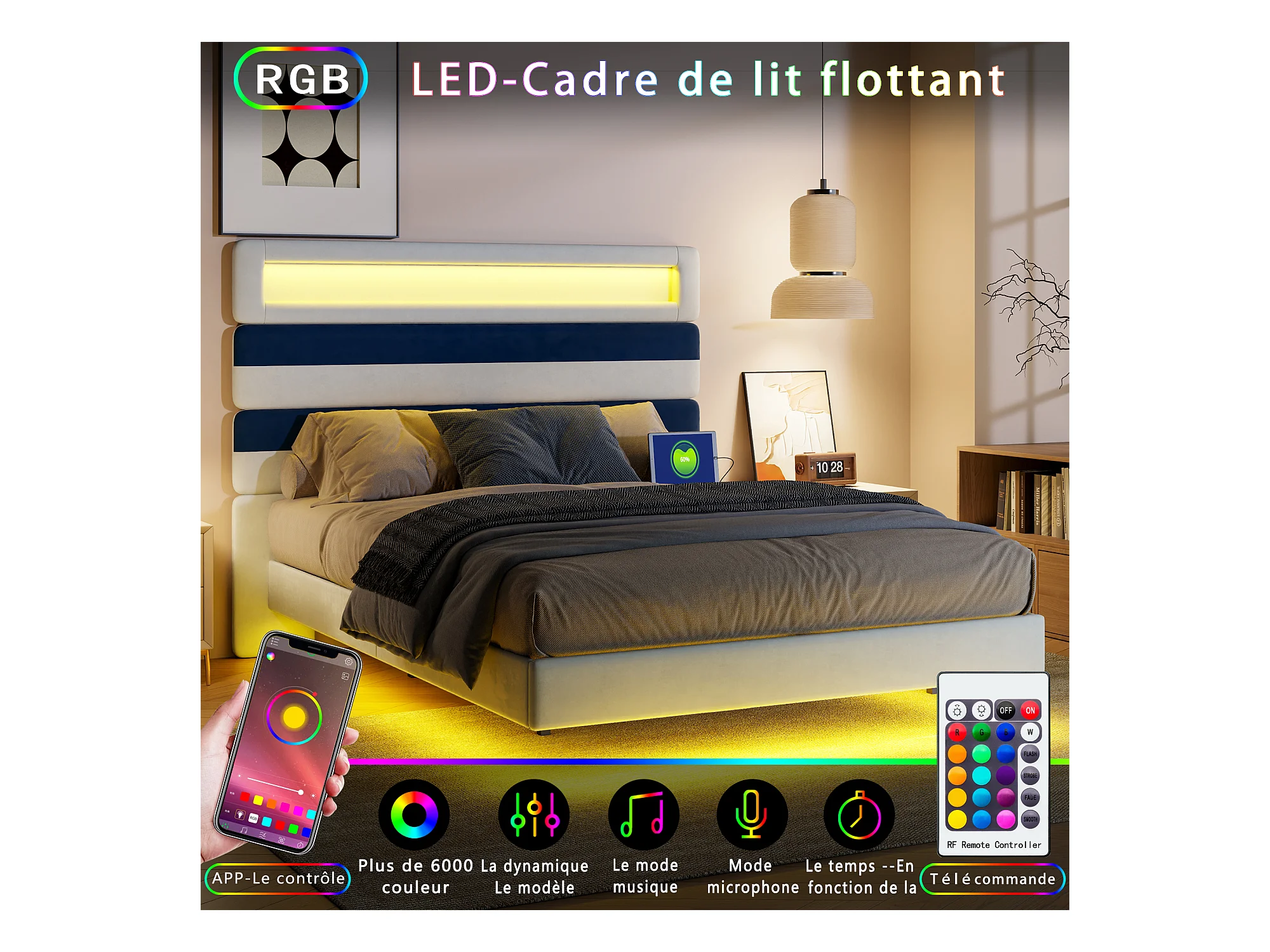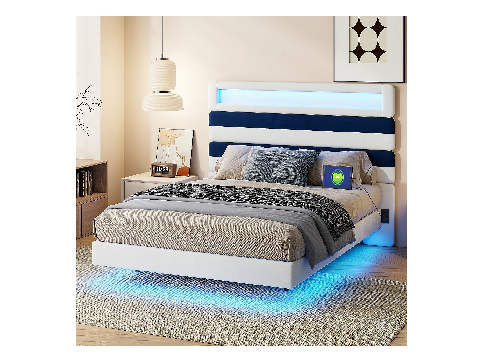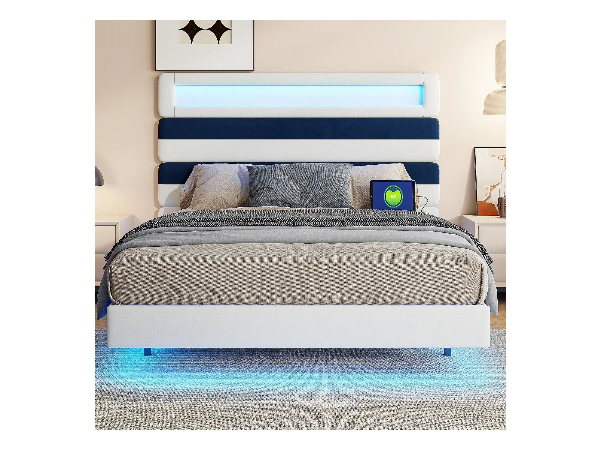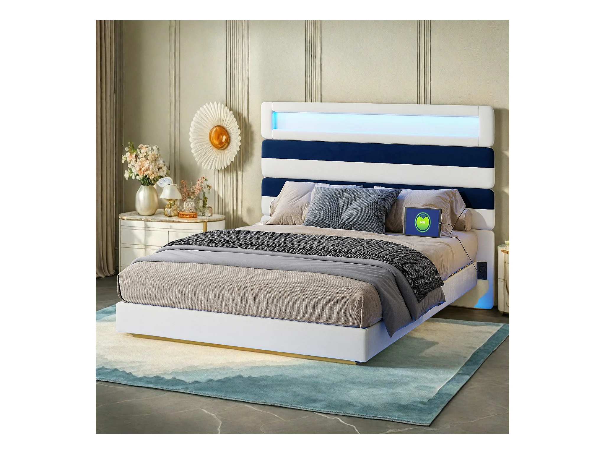 Lit double 140x190 cm, tête de lit rayée en velours blanc & bleu, panneau bois réglable, ports USB, bandes LED tête/pied, chargeur EU