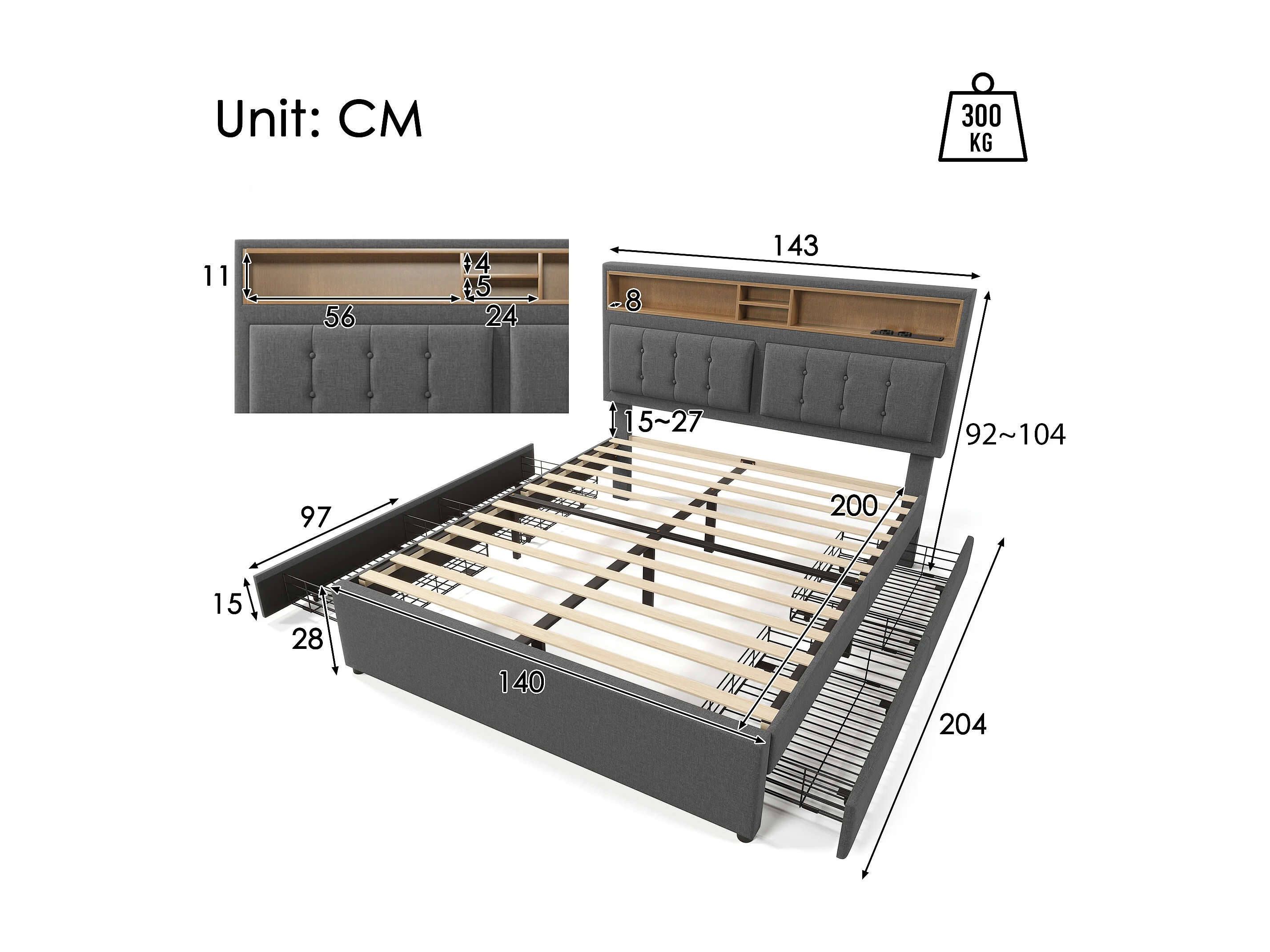 Lit double 140x200 cm avec 4 tiroirs et prise USB-C, tête de lit réglable en hauteur, sommier en bois