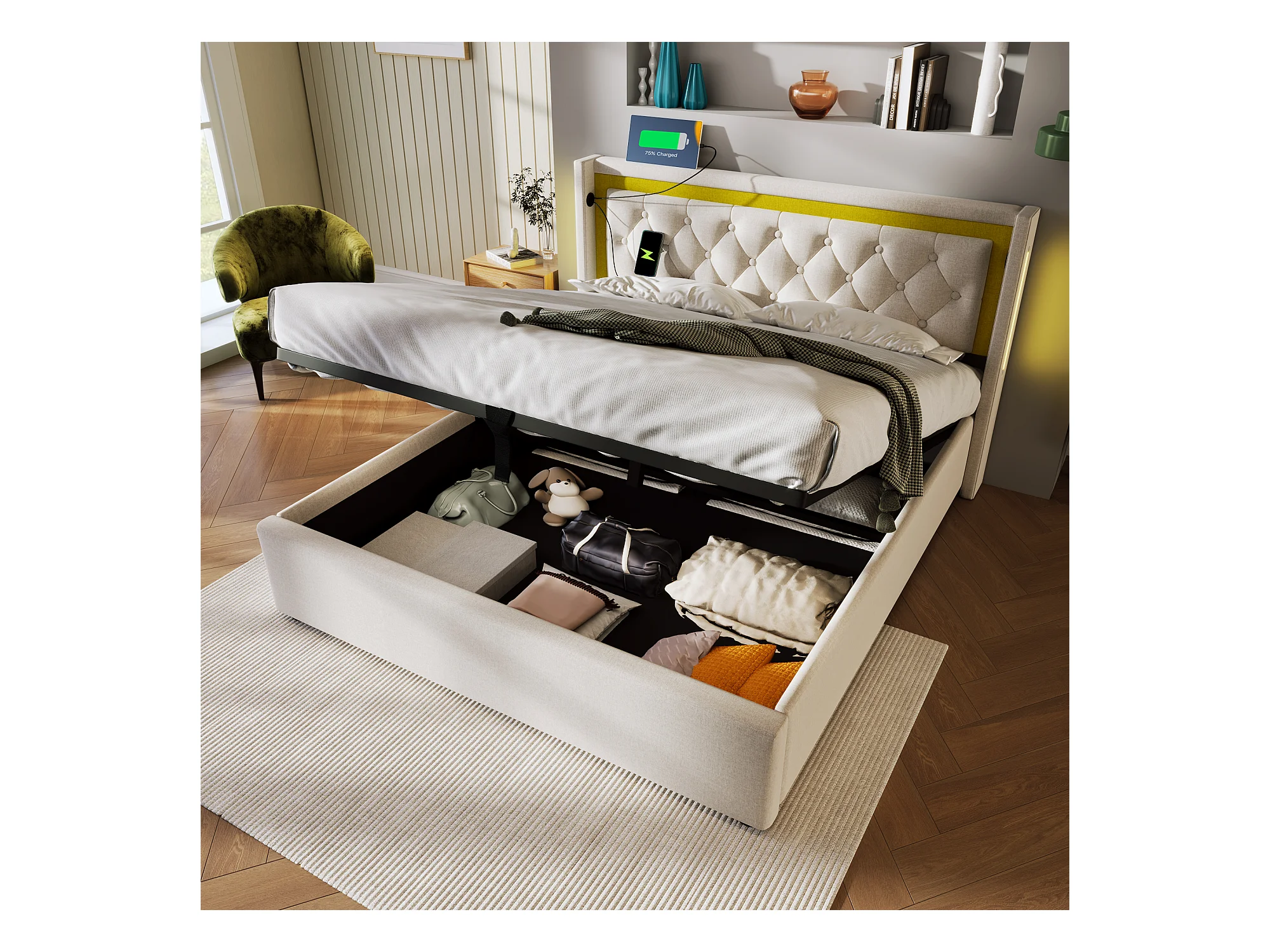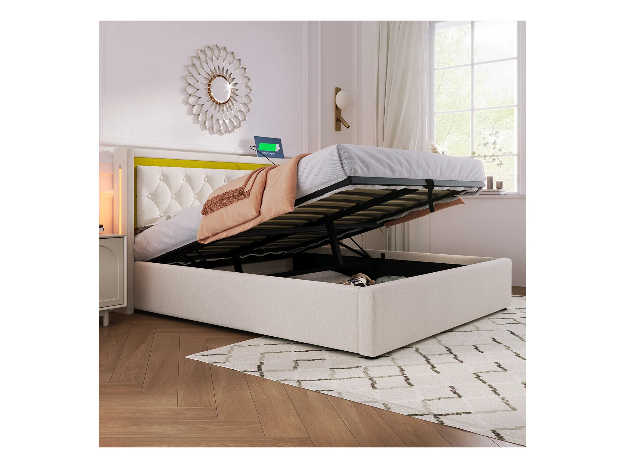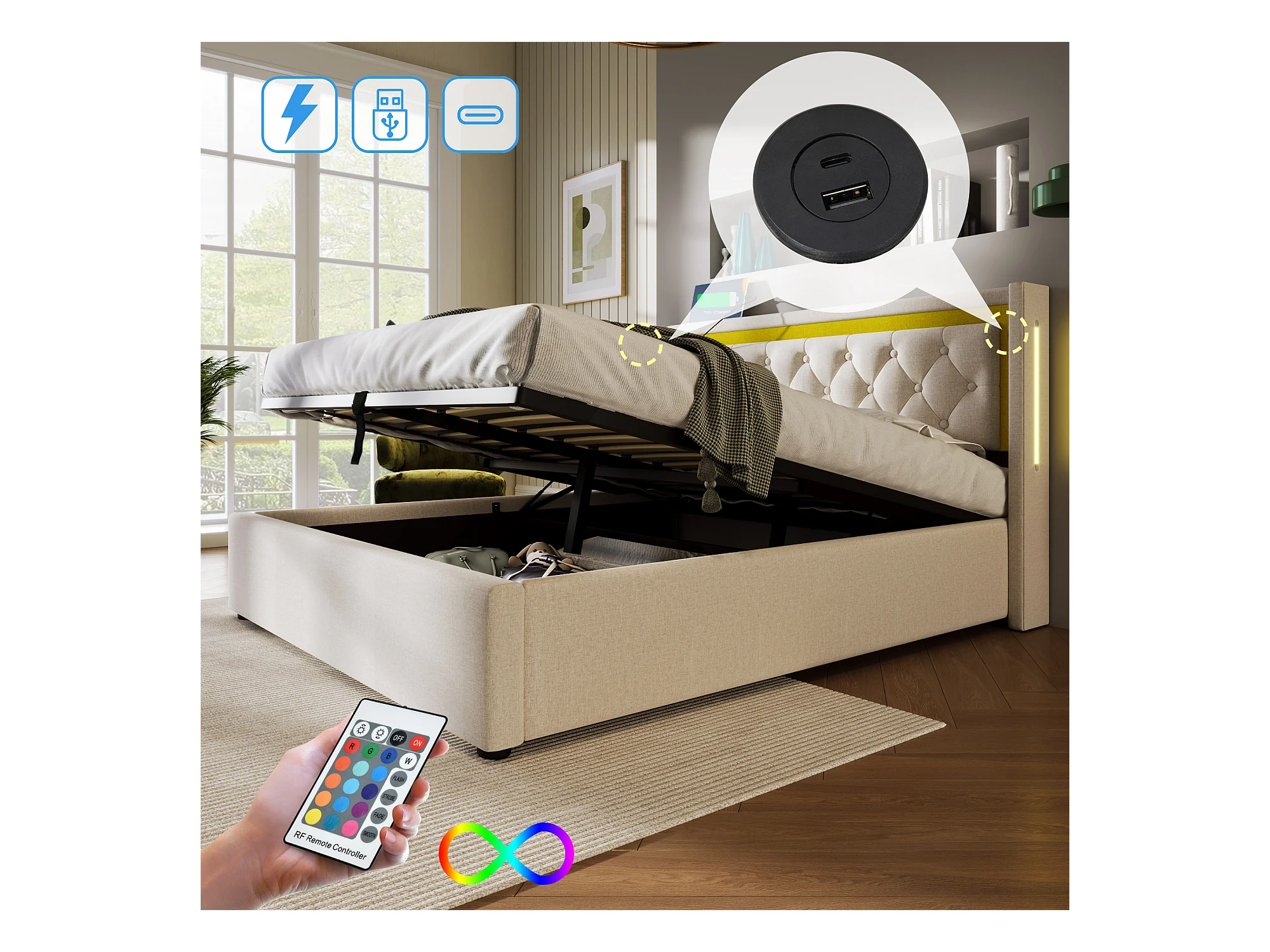 Lit coffre adulte 140x200 cm avec LED et charge USB-C - Coton gris (sans matelas)