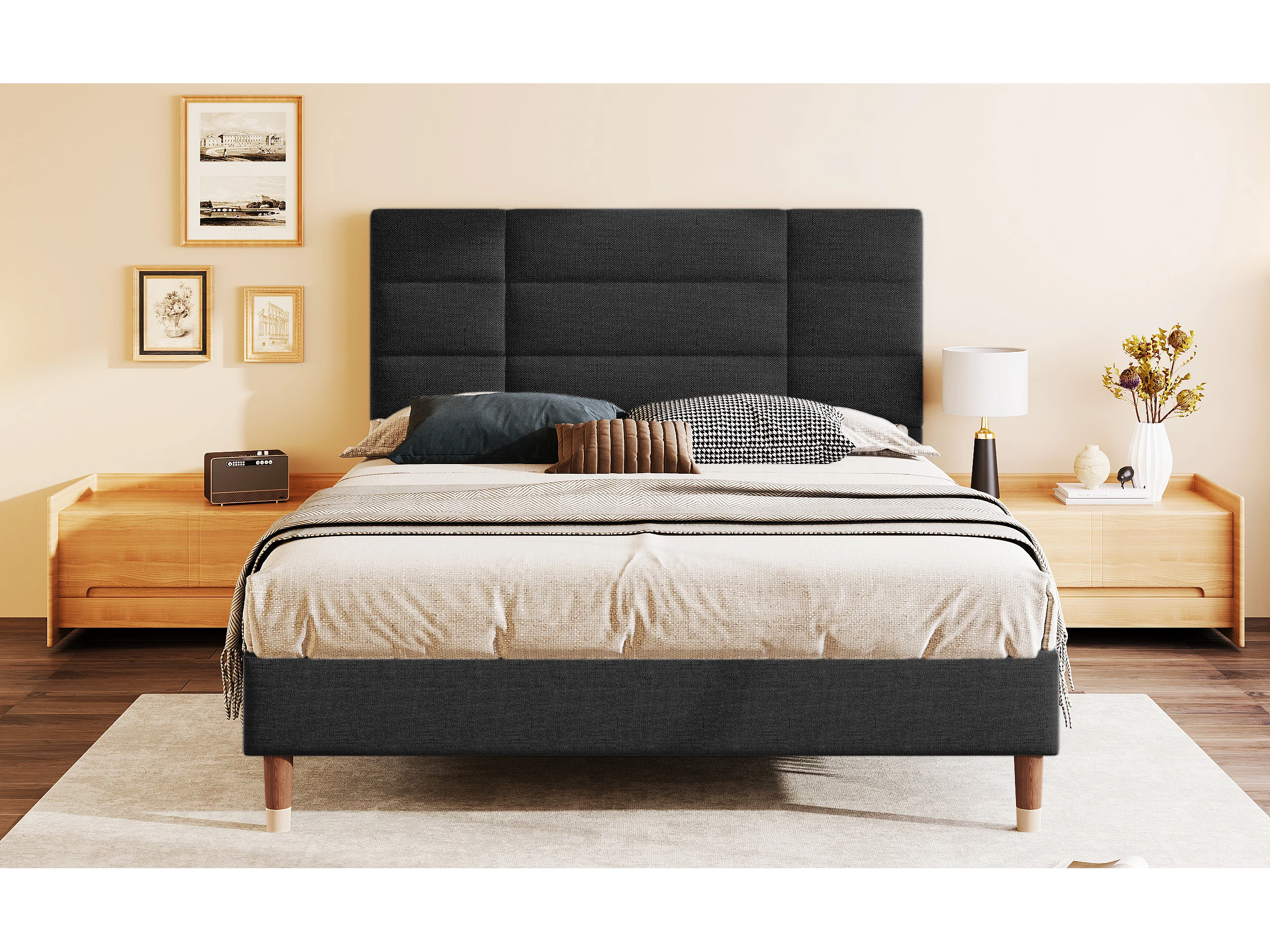 Lit double 140x200 cm en lin noir avec tête de lit, échelle et barrières de sécurité