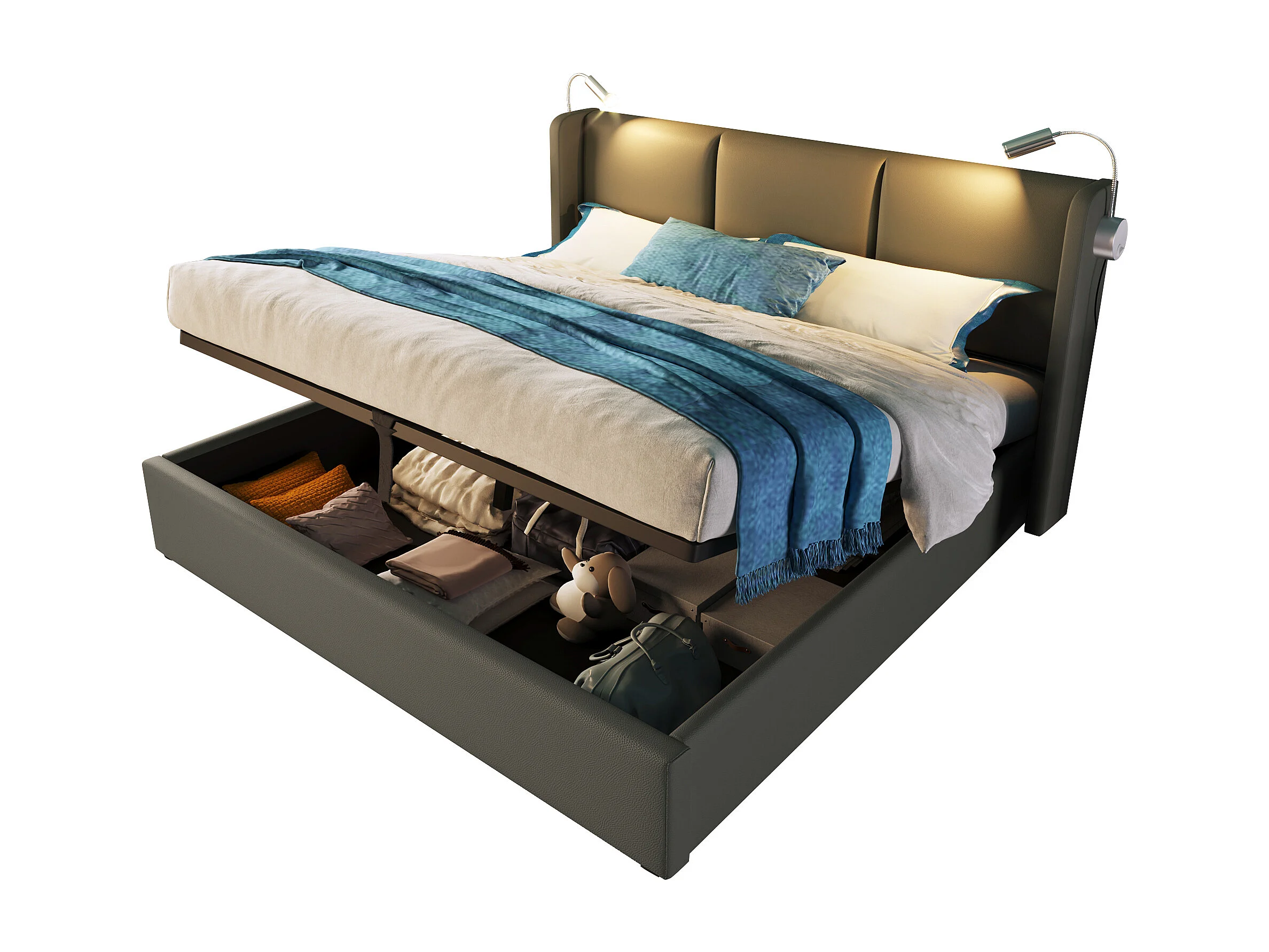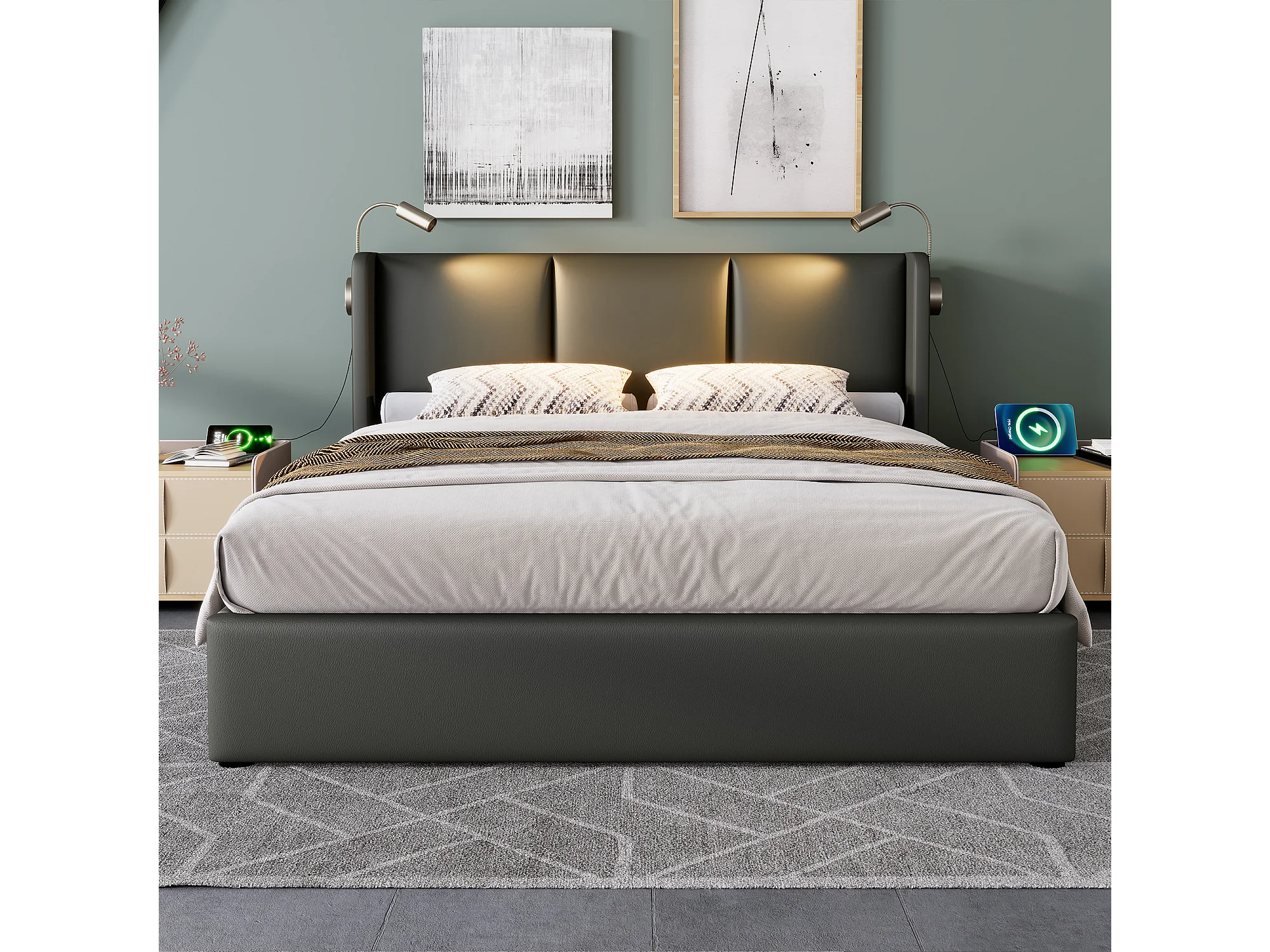 Lit double 140x200 cm en PU gris avec éclairage de lecture et fonction de charge USB