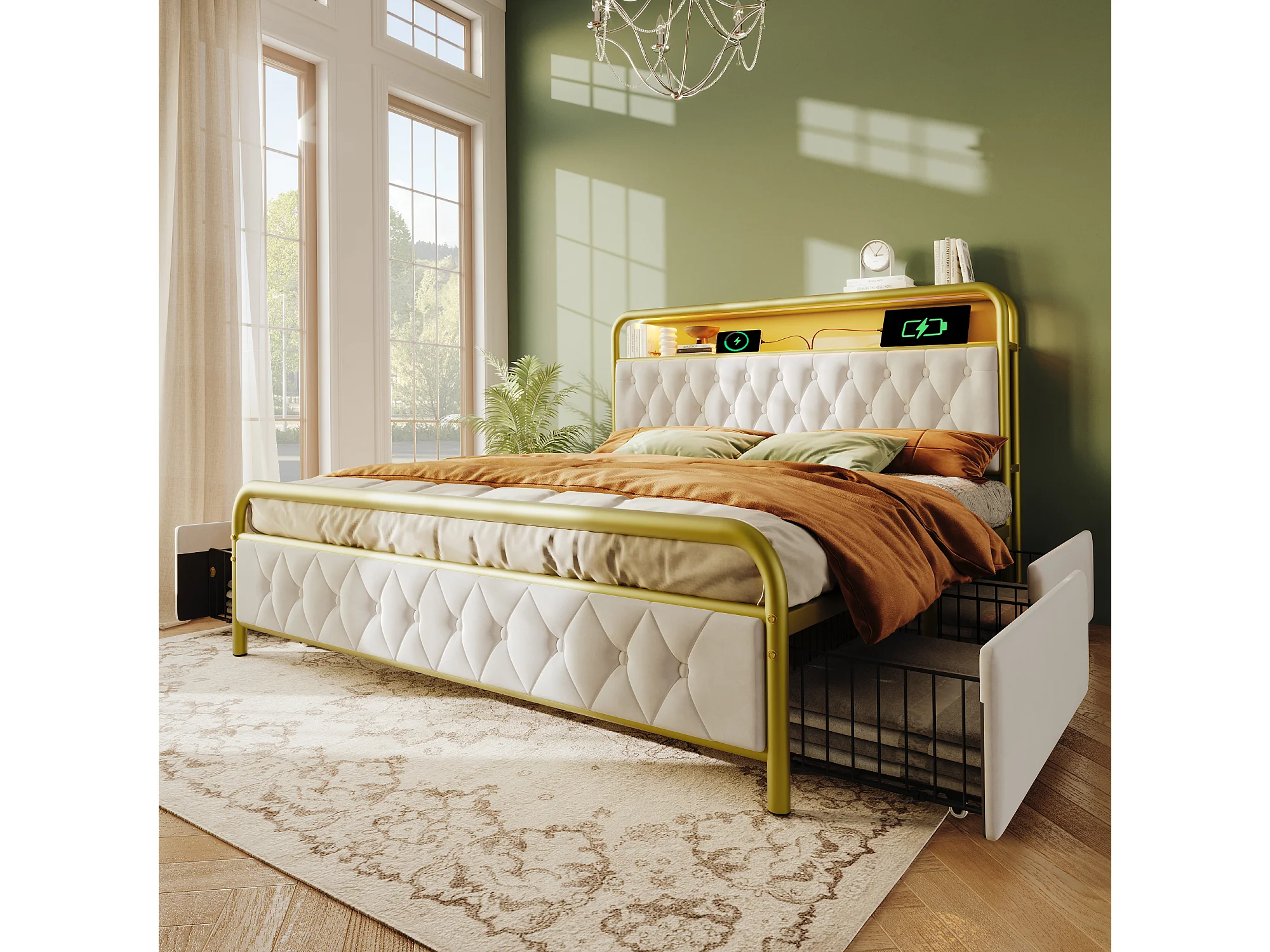 Lit double 140×200 cm en velours blanc avec éclairage LED, USB et 4 tiroirs de rangement