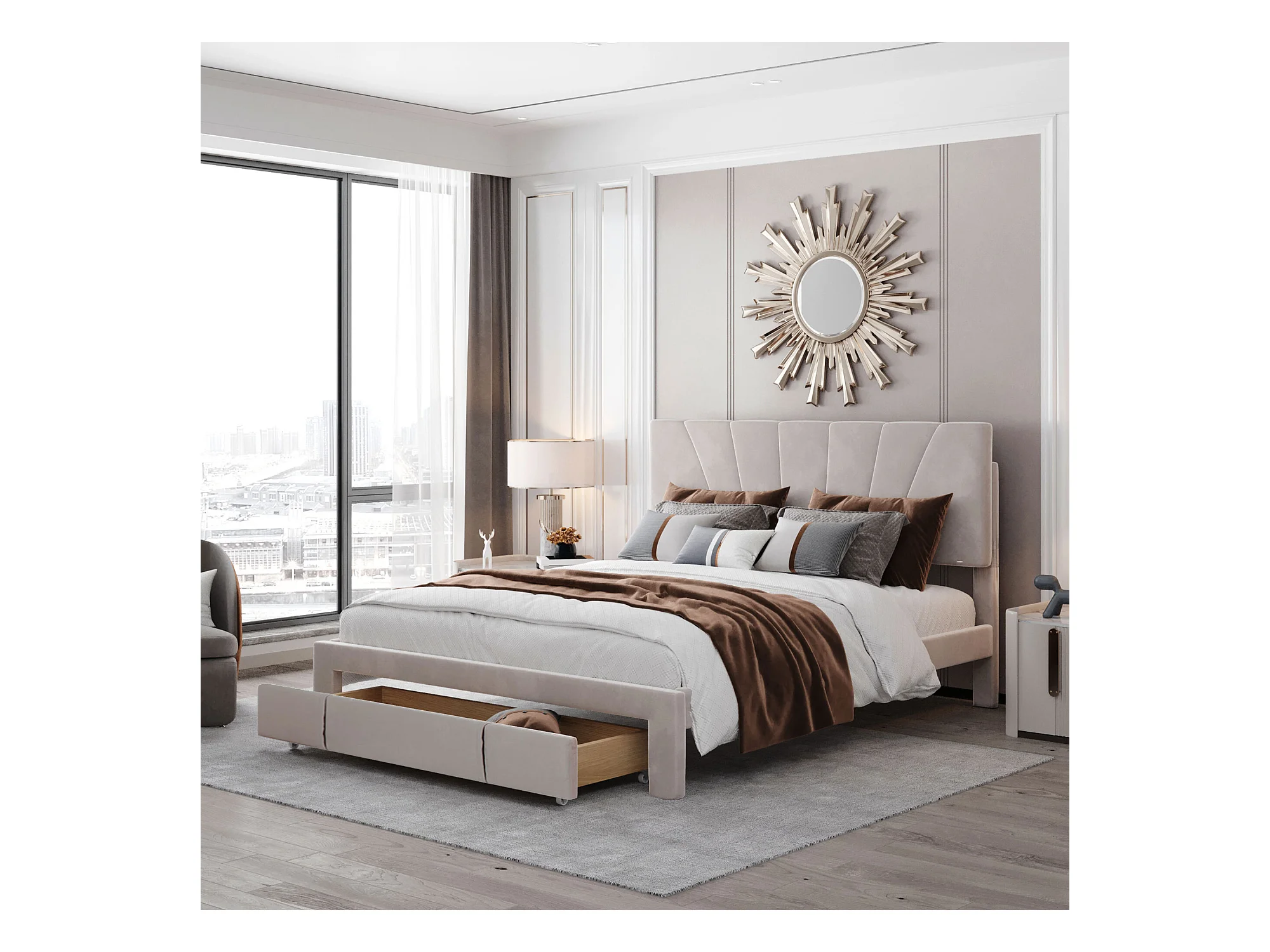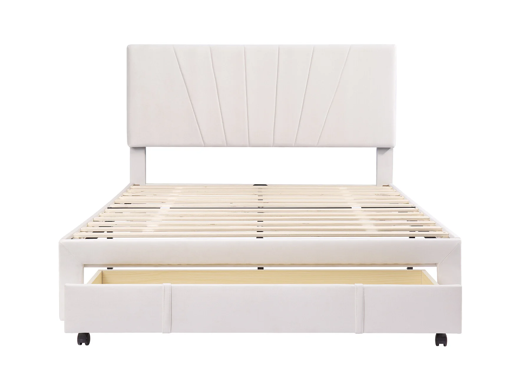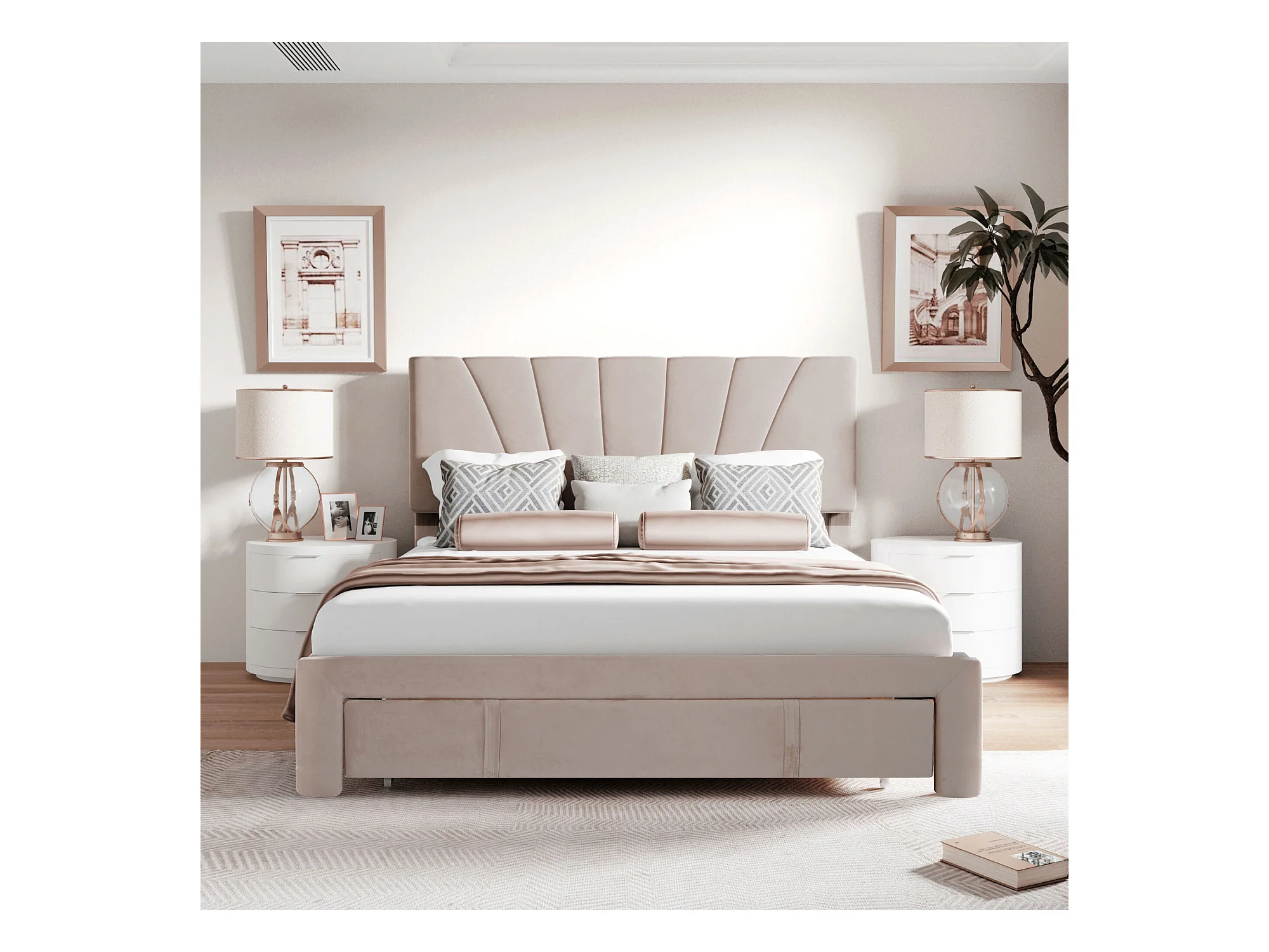 Lit double 140x200 cm - Lit tapissé avec sommier à lattes, dossier et grand tiroir - Tissu velours - Beige