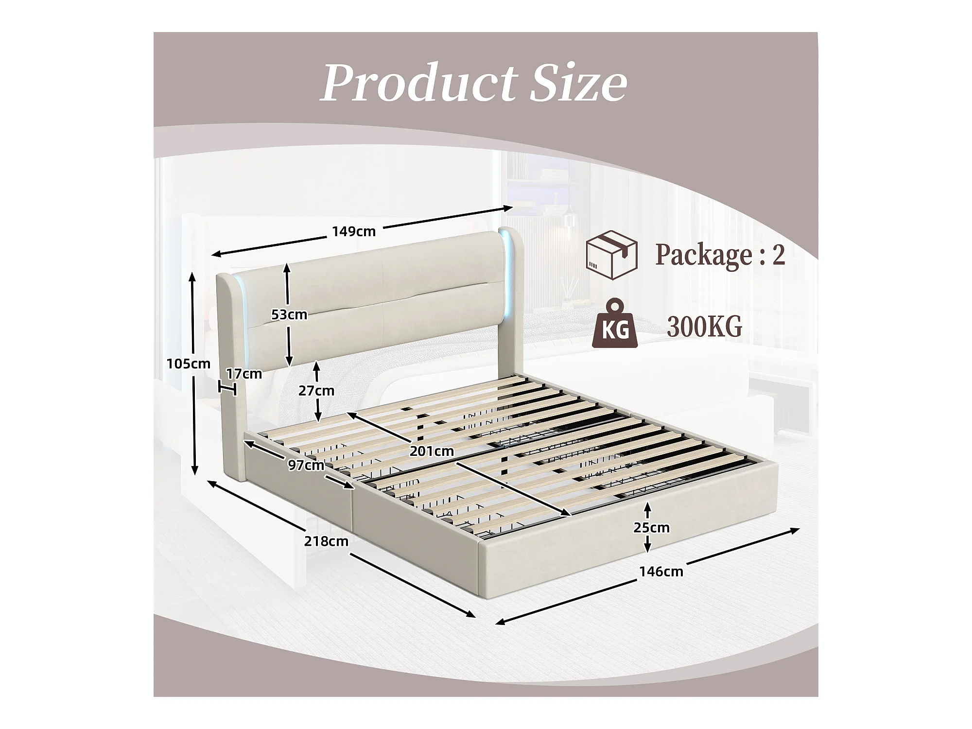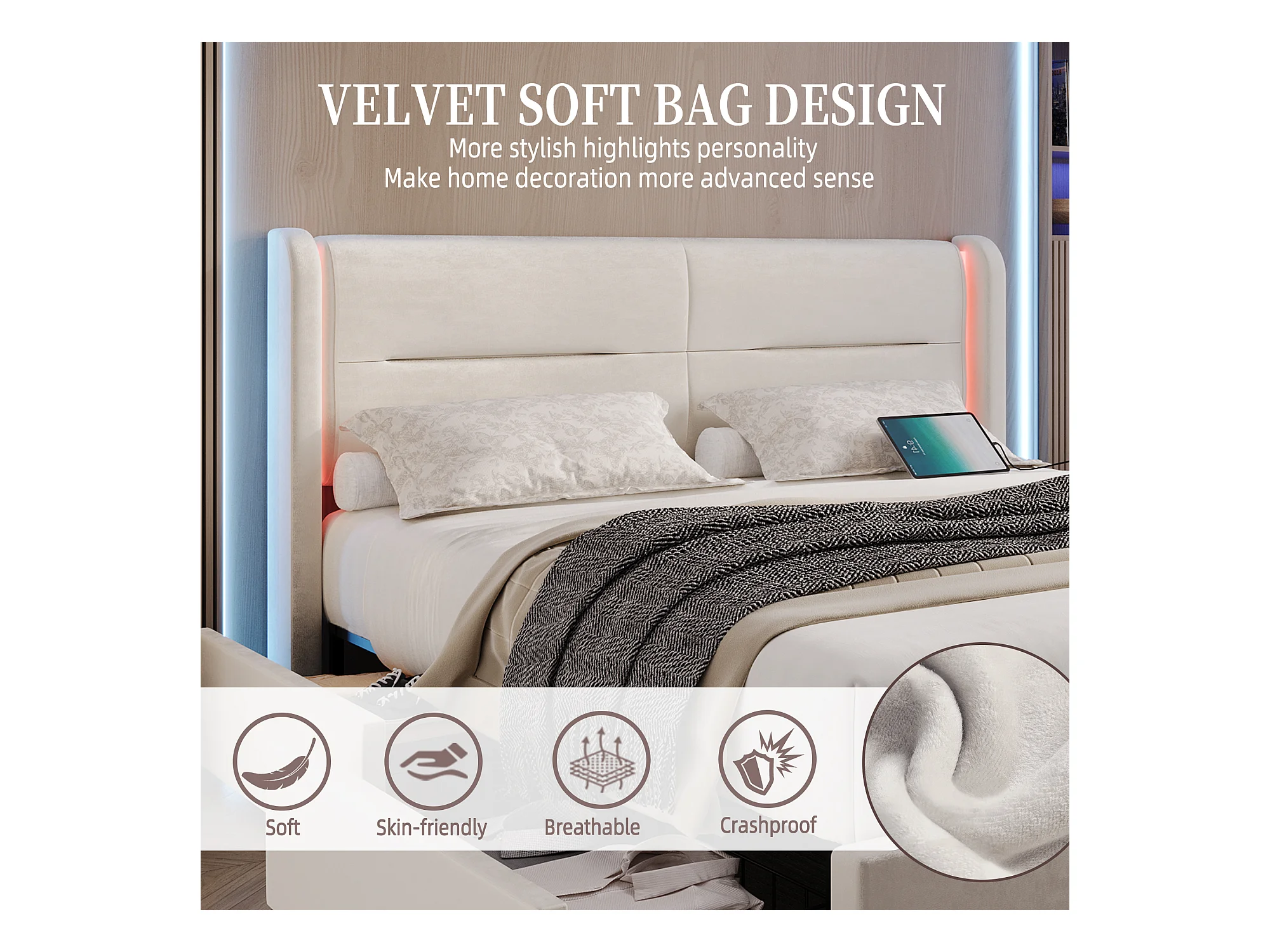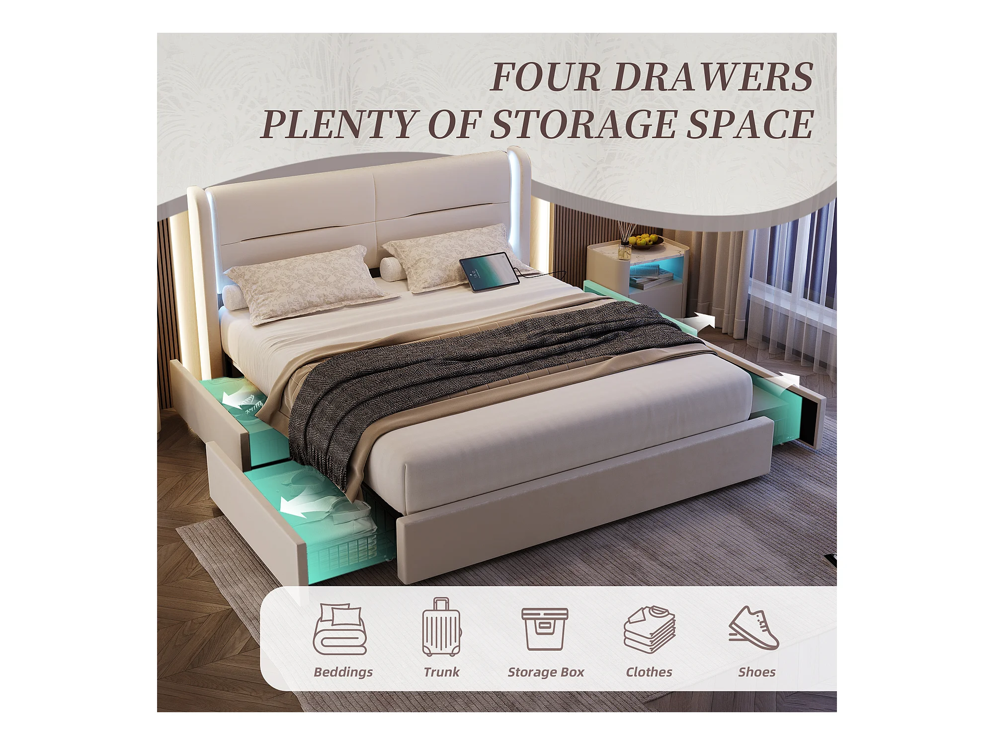 Lit Coffre 140×200 cm - Lit Rembourré en Velours Beige – Tête de Lit LED – 4 Tiroirs – Ports USB/USB‑C – Style Contemporain