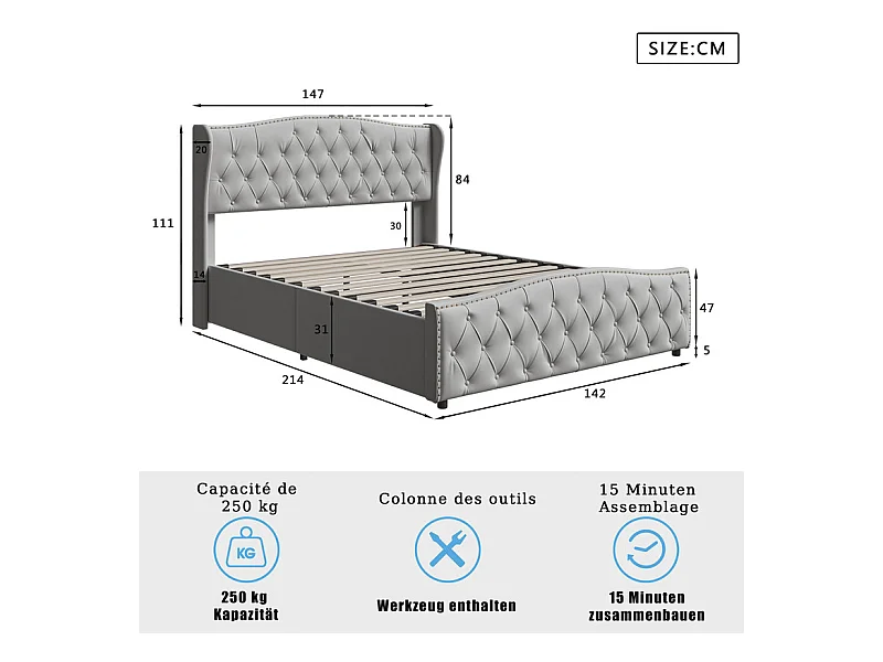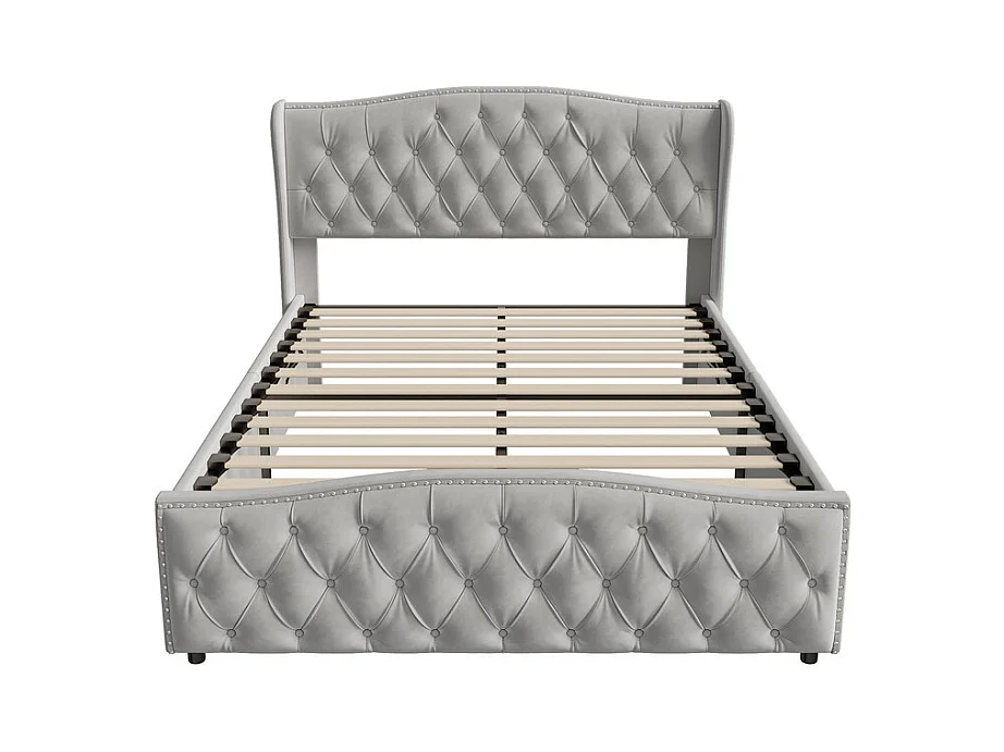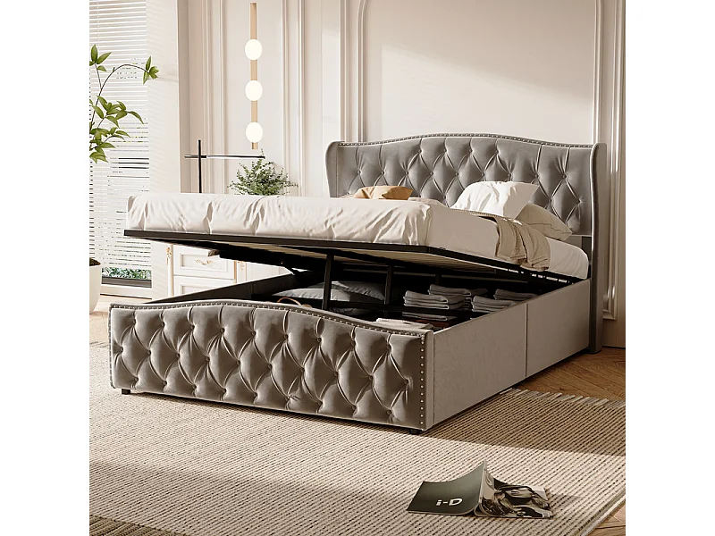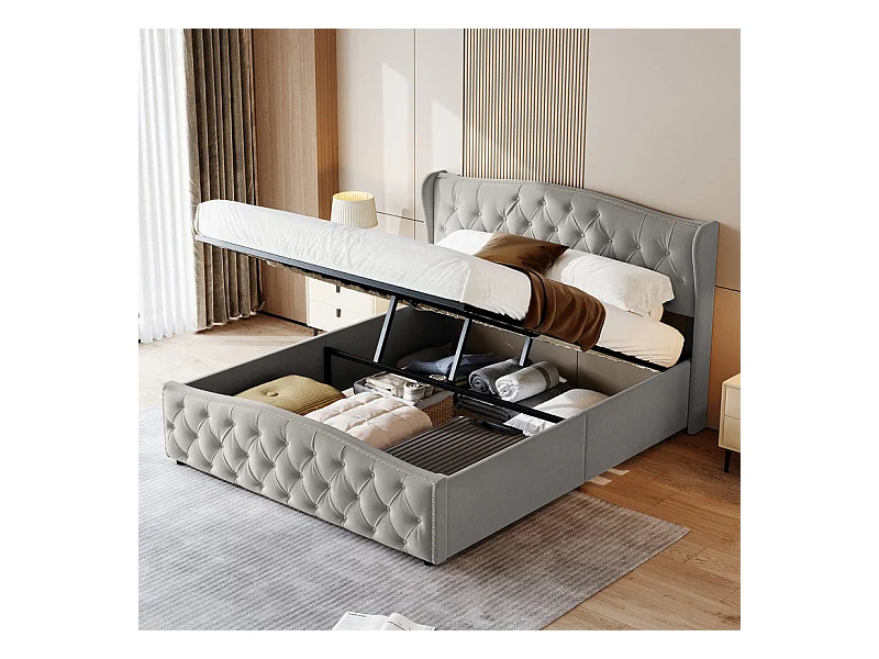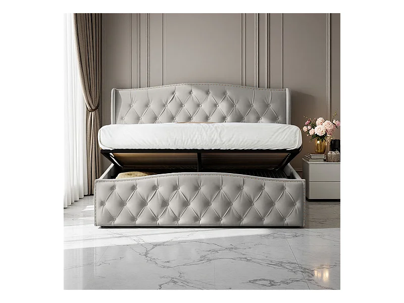 Lit Double 140x200 Hydraulique avec Rangement - Lit Coffre Velours Gris Clouté - Design Vague Moderne - 250kg