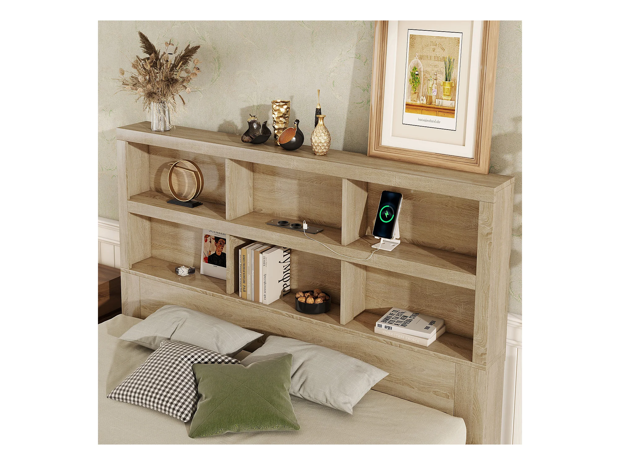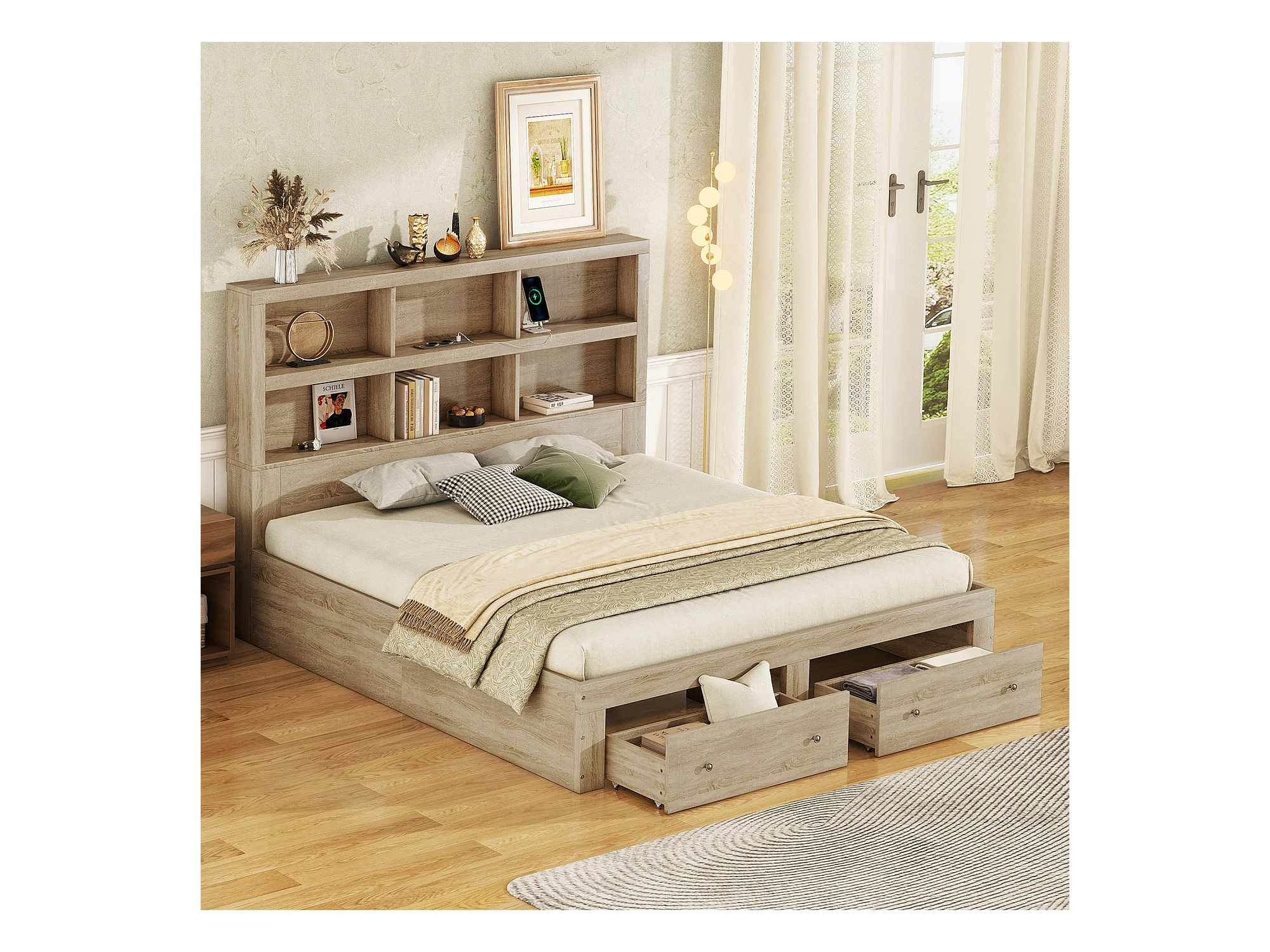 Lit Double 160*200 cm - Bois Massif - Cadre De Lit Avec 2 Tiroirs - Tête De Lit Fonctionnelle Avec Rangements - Naturel