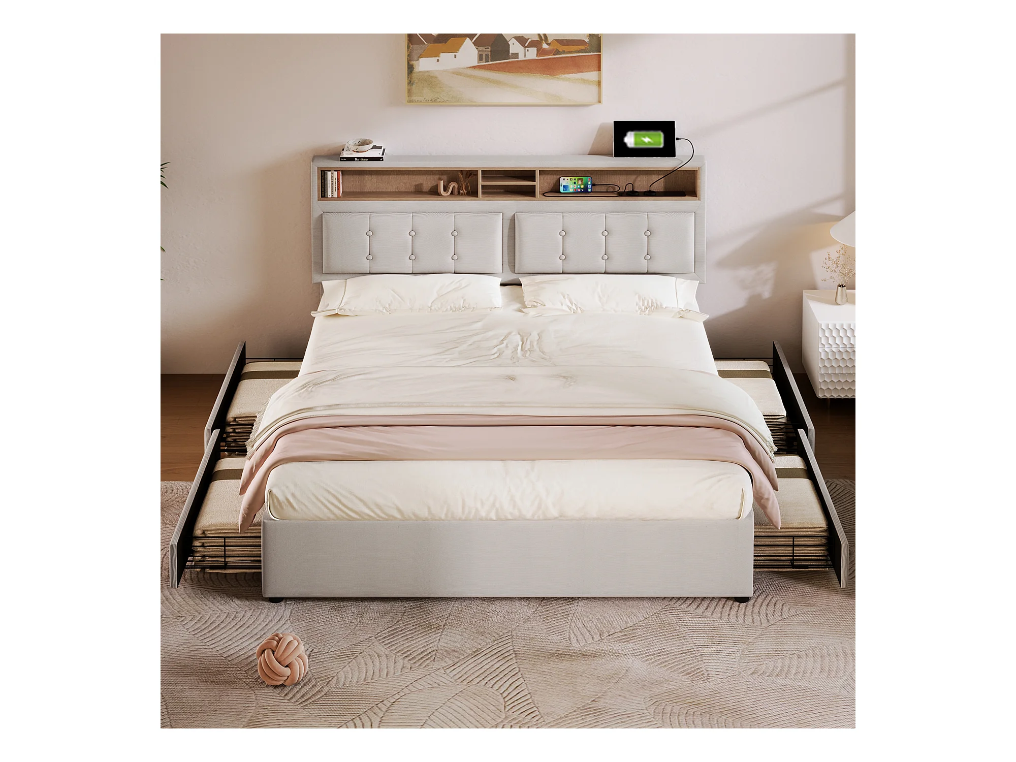 Lit double 160x200 cm avec 4 tiroirs et prise USB-C, tête de lit réglable en hauteur, en lin beige