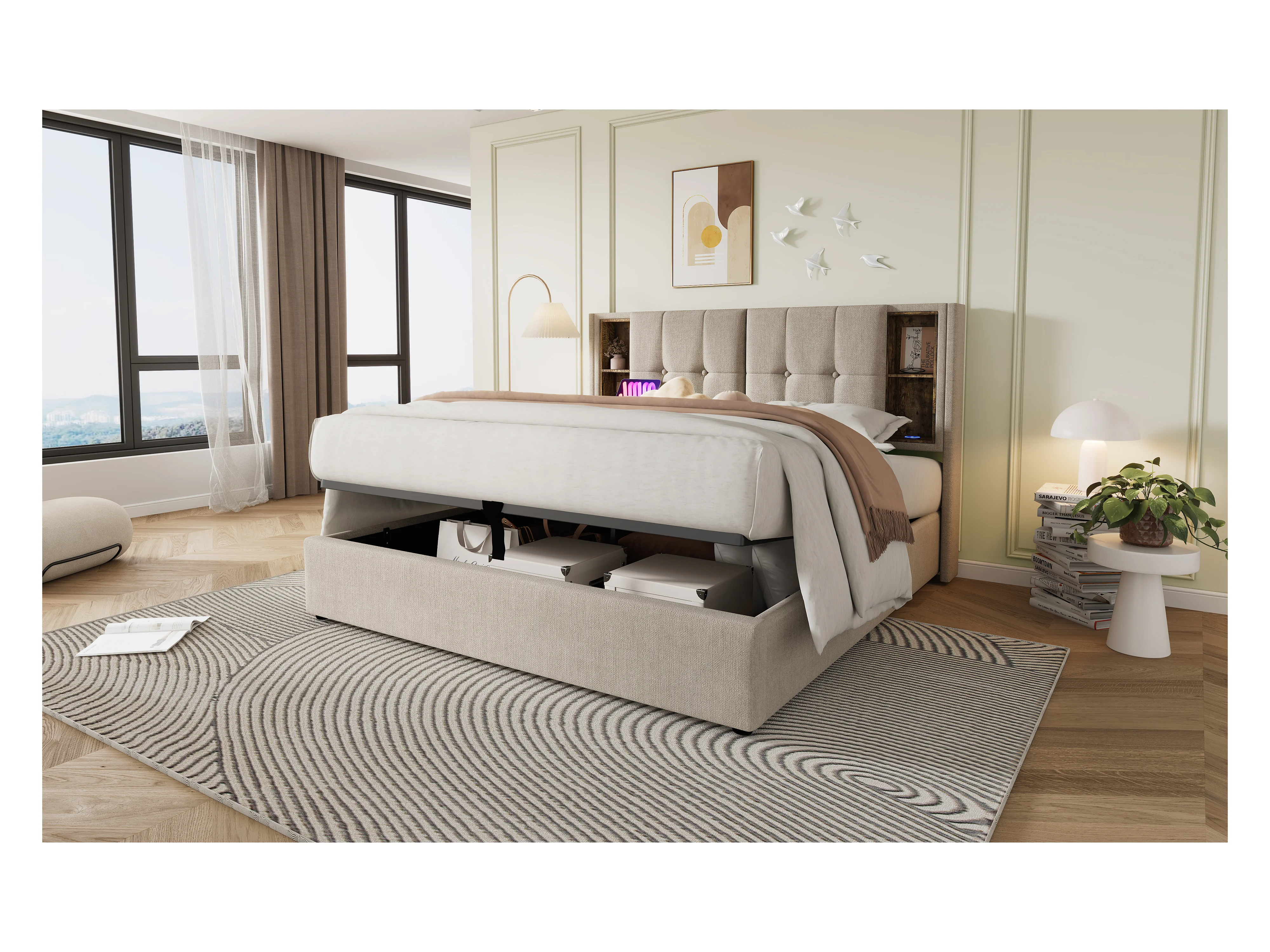 Lit double 160x200 cm avec chargement sans fil et ports USB, cadre en lin naturel avec rangement