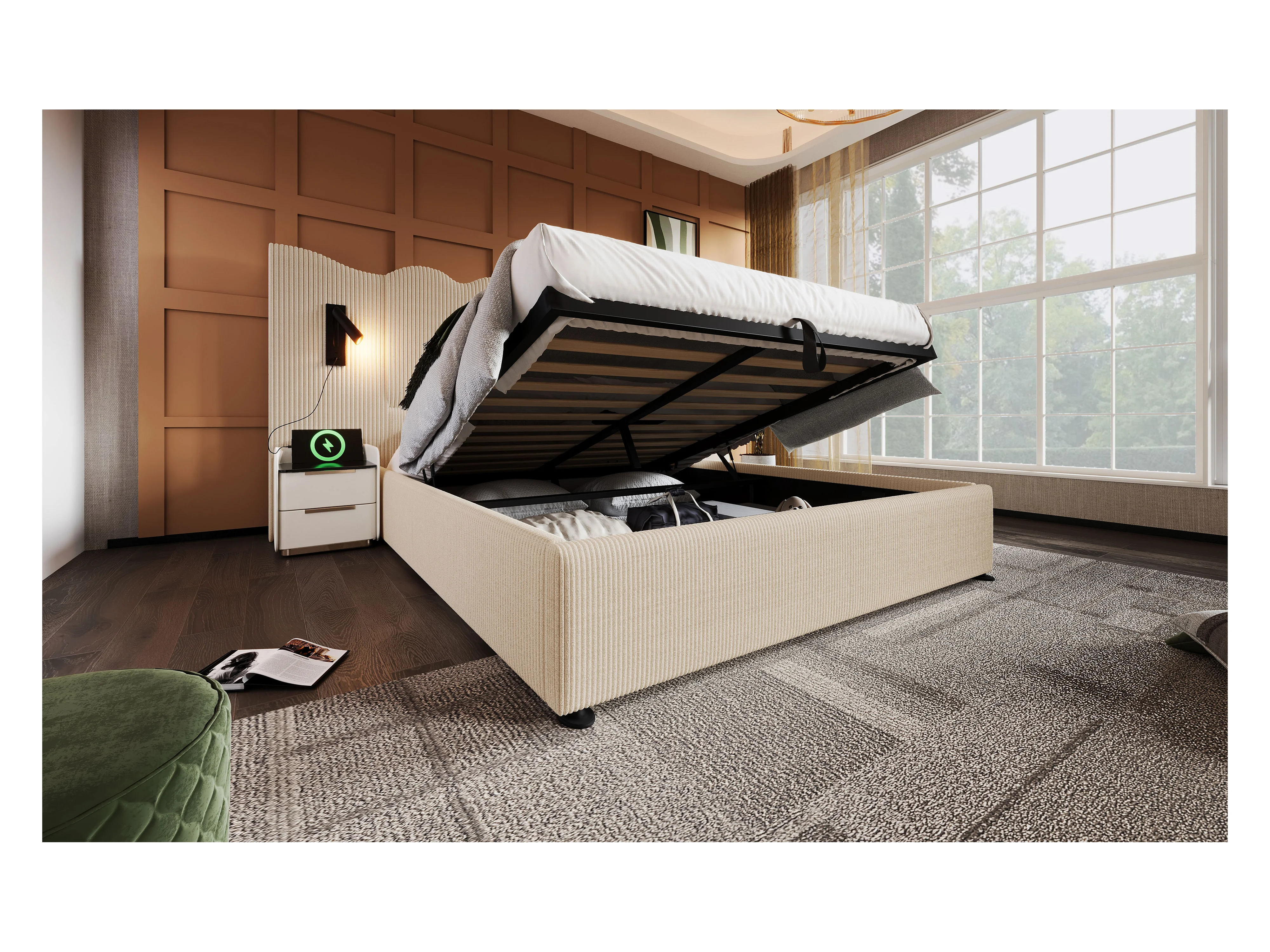 Lit double 160×200 cm avec lampe de lecture et fonction de chargement USB Type-C, lit de rangement en bois massif et métal, beige