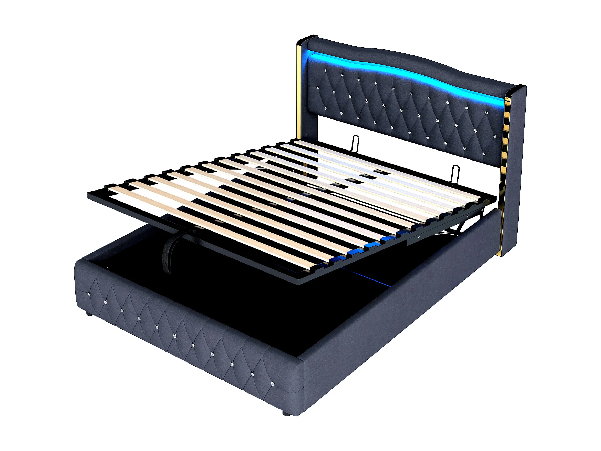 Lit double 160×200 cm avec pieds larges, éclairage LED changeant de couleur et rangement hydraulique