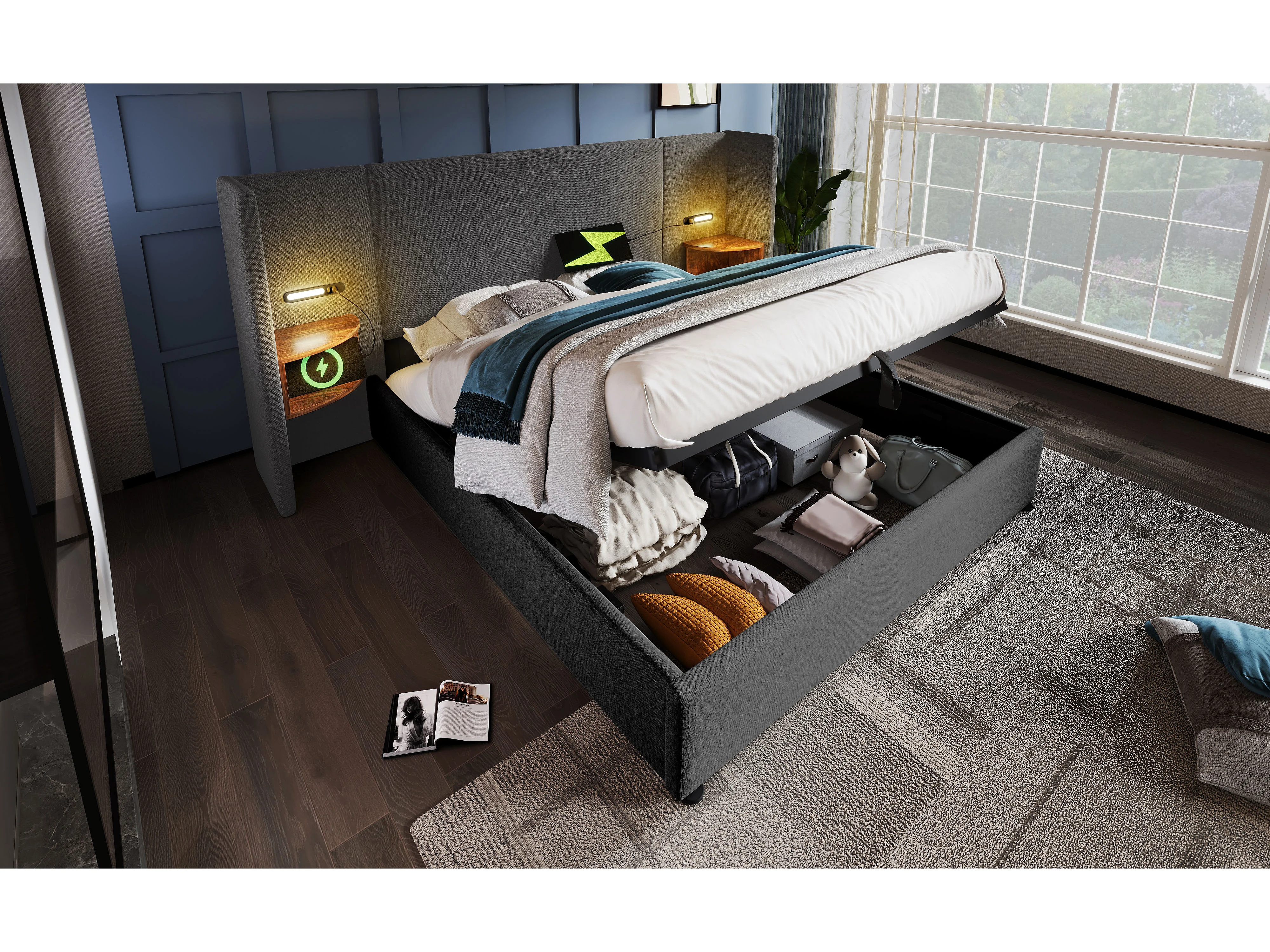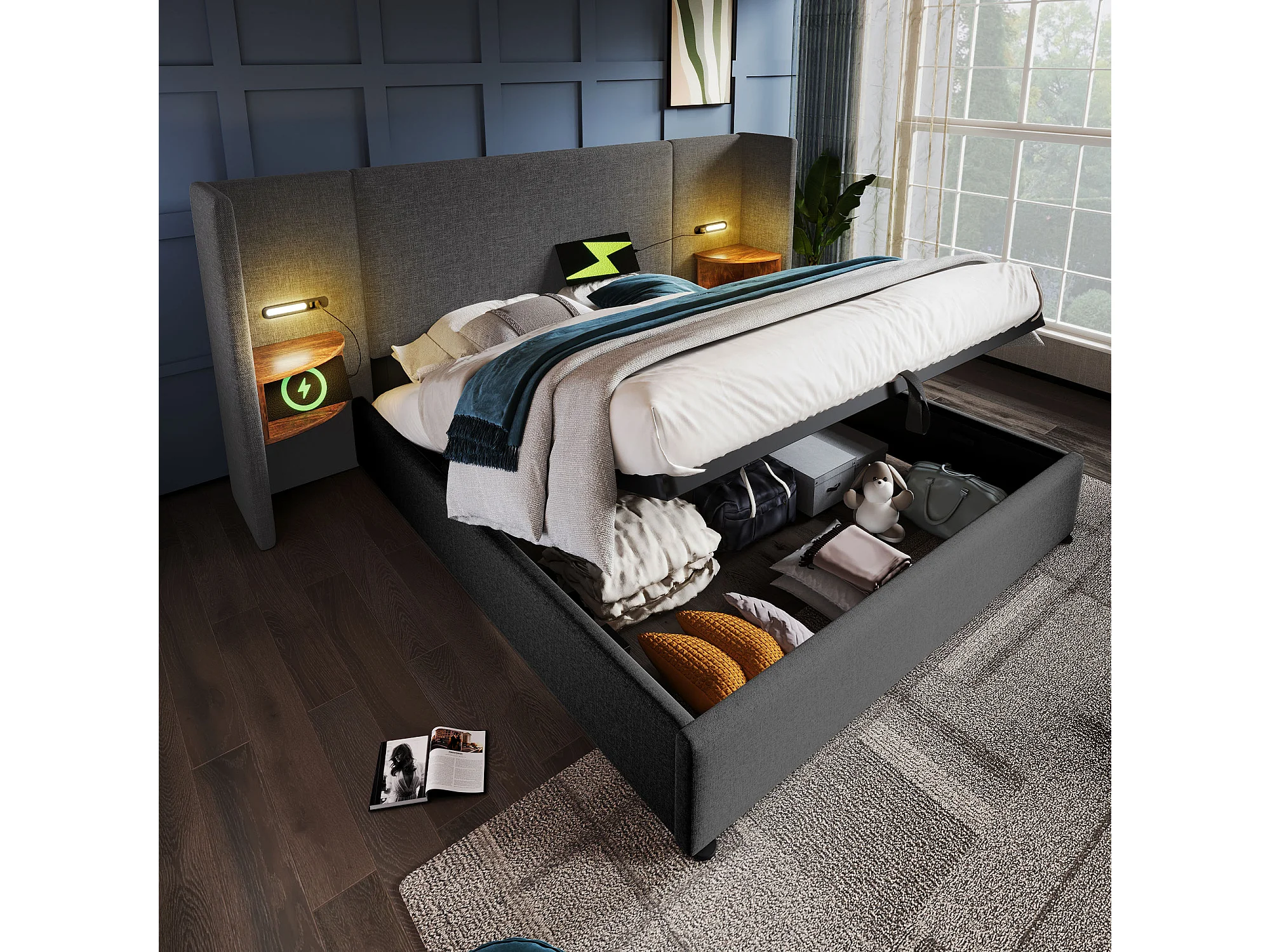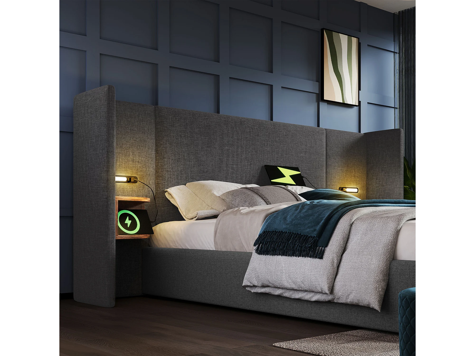 Lit double 160×200 cm avec table de nuit, lampe de lecture et chargeur USB Type-C, cadre en bois massif et métal, gris, lin