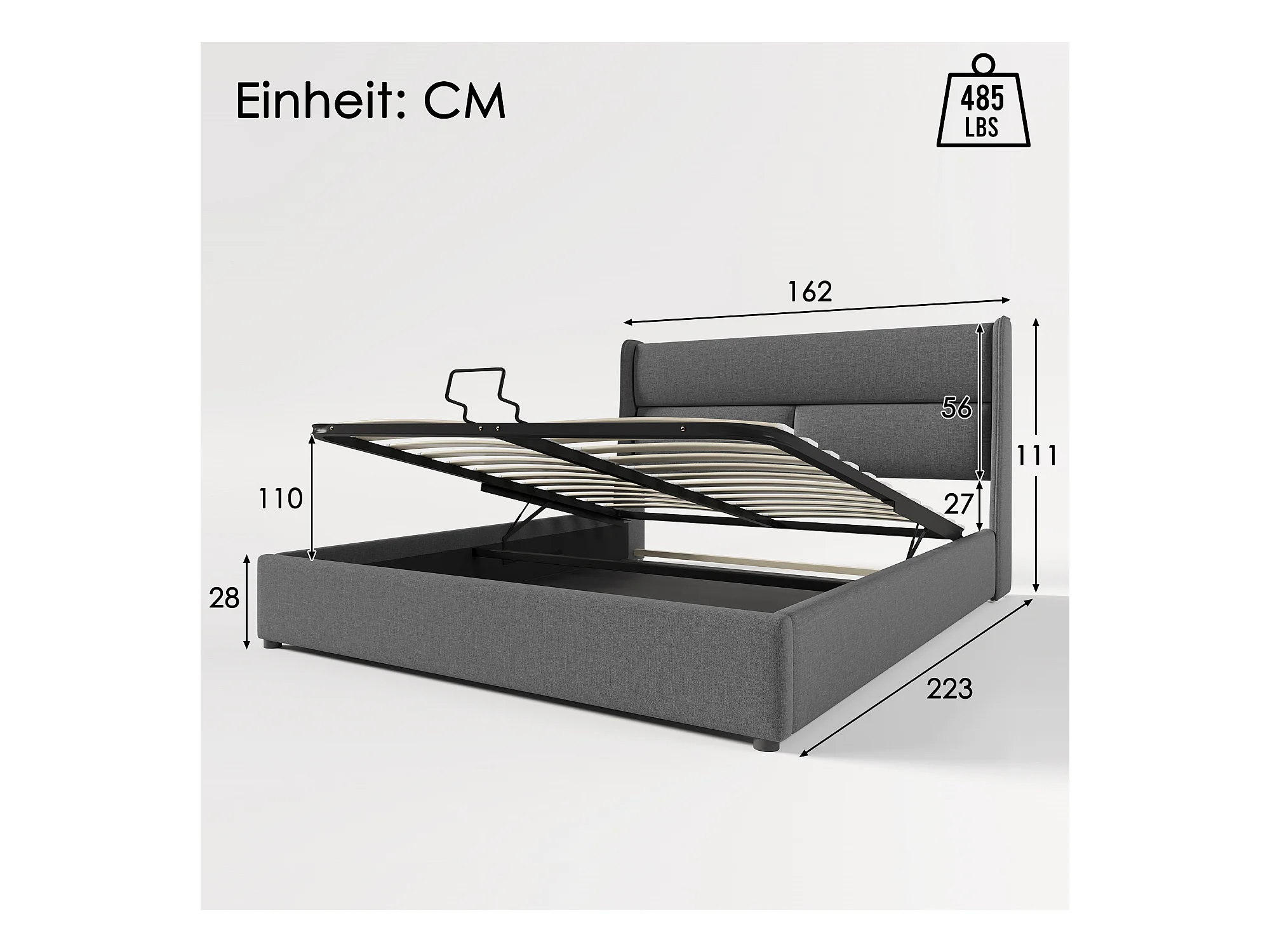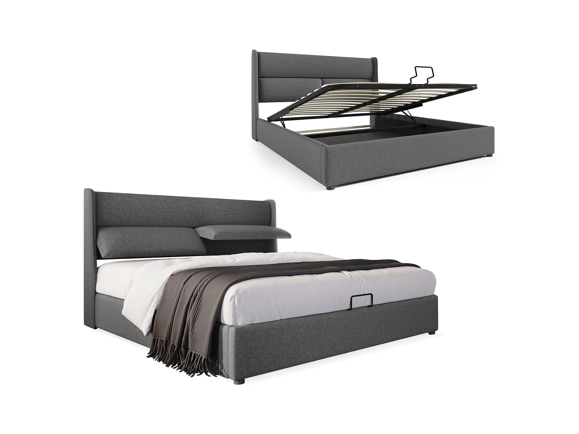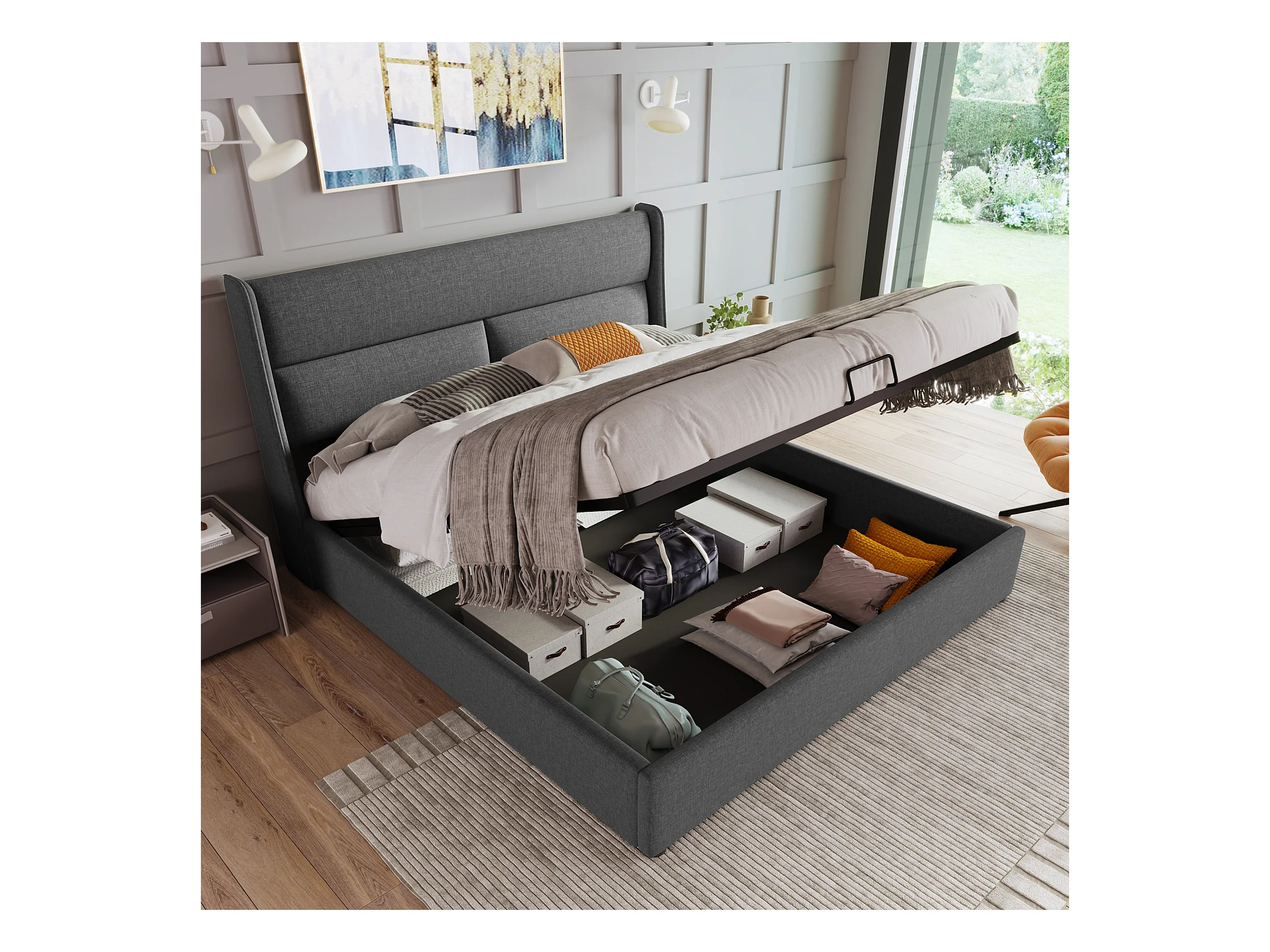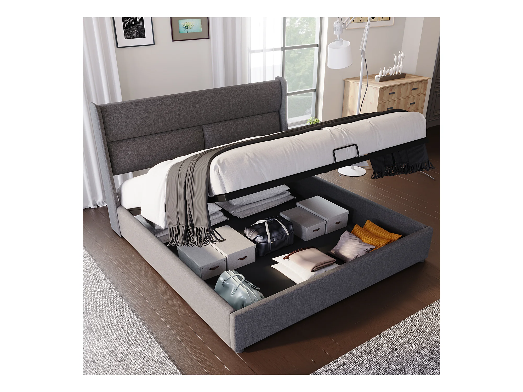 Lit double 160x200 cm avec têtière réglable et rangement pratique en lin gris