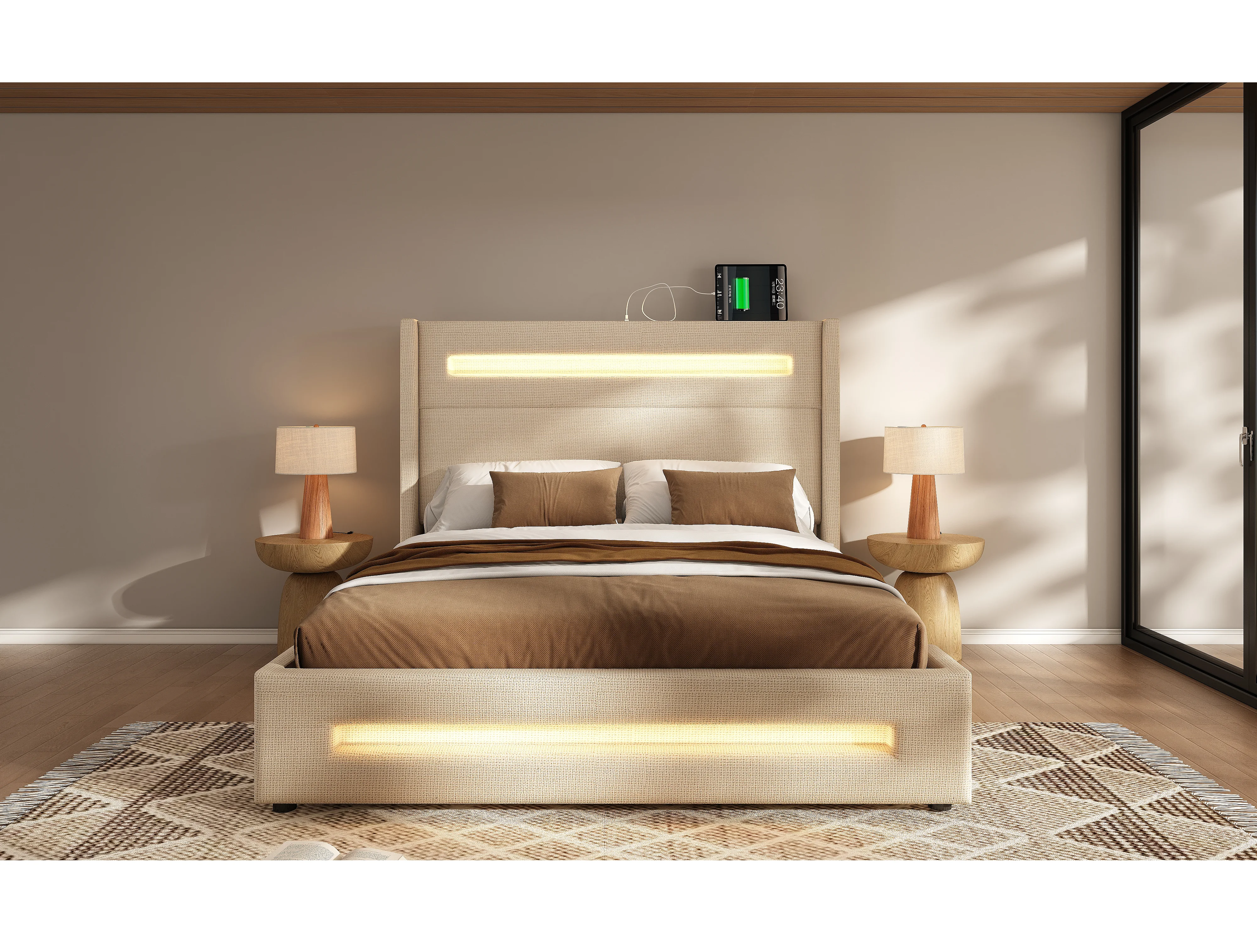 Lit double 160x200 cm en lin beige avec LED, rangement hydraulique et ports USB