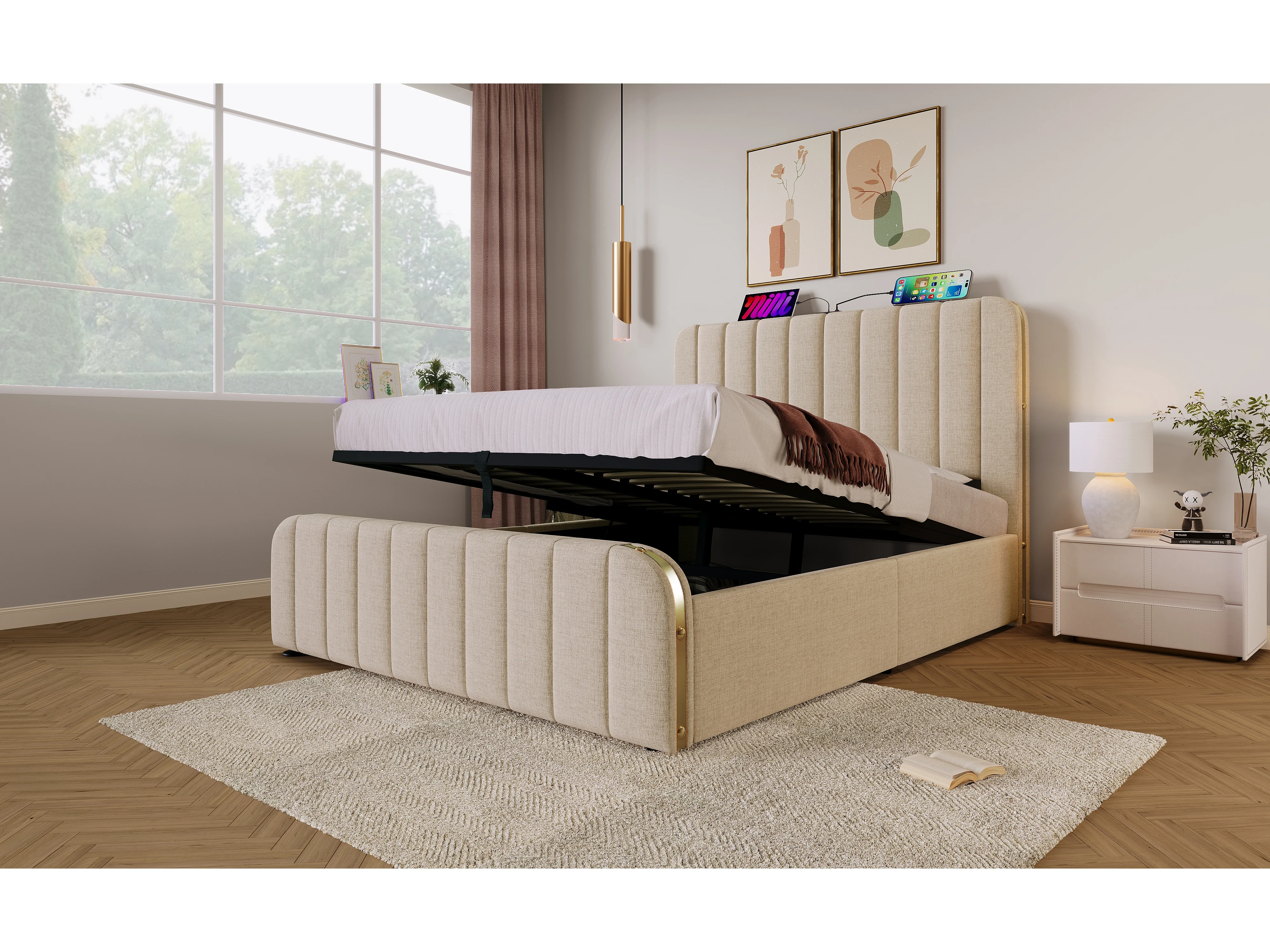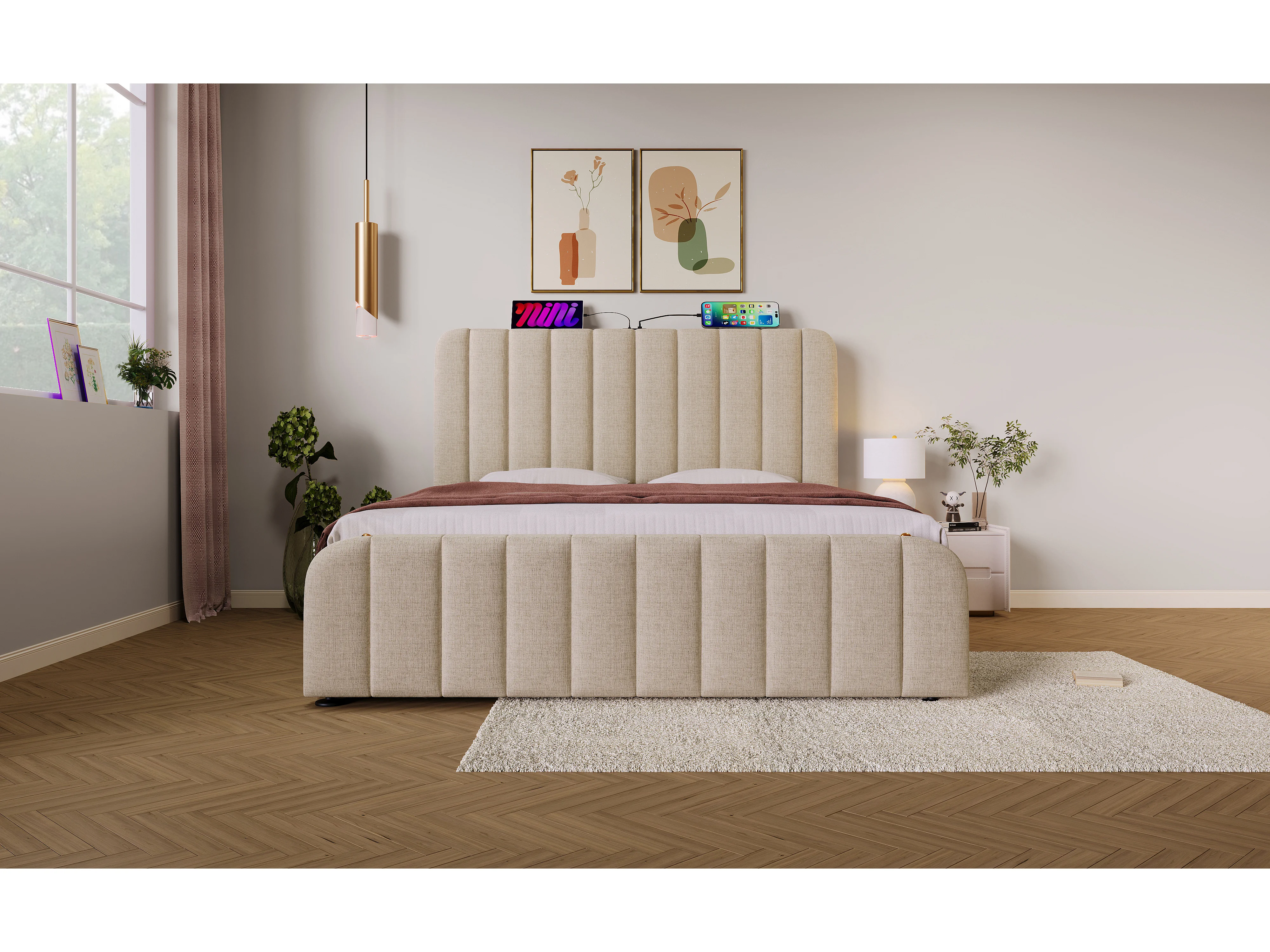 Lit double 160×200 cm en lin beige avec tête de lit rembourrée et ports USB intégrés