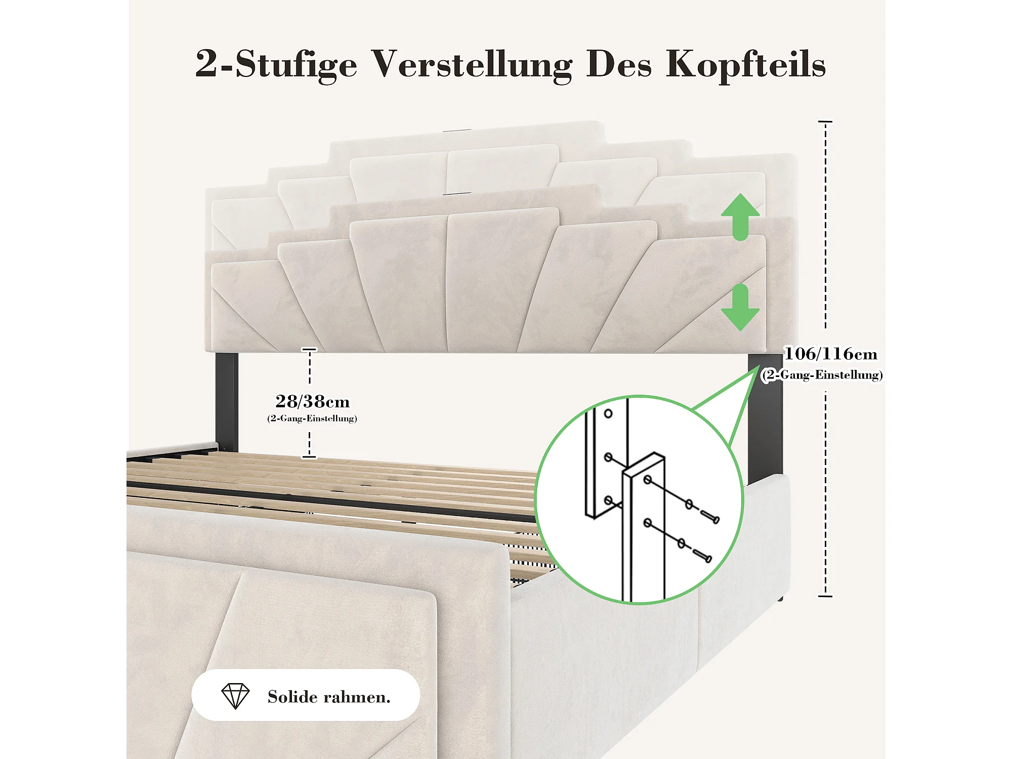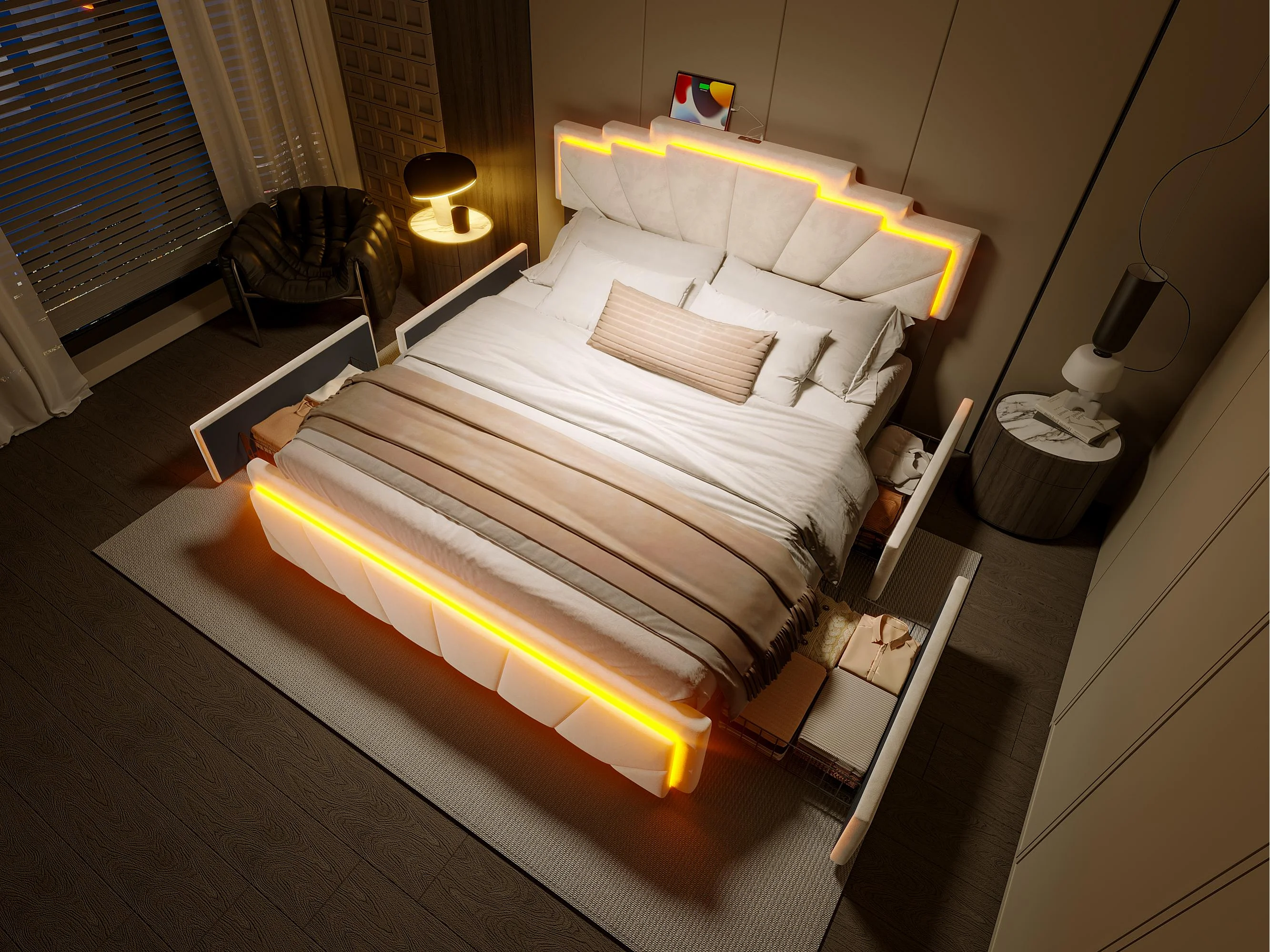Lit coffre rembourré 160x200 cm en velours beige - avec 4 tiroirs - ports USB et Type-C - éclairage LED RGB - design futuriste
