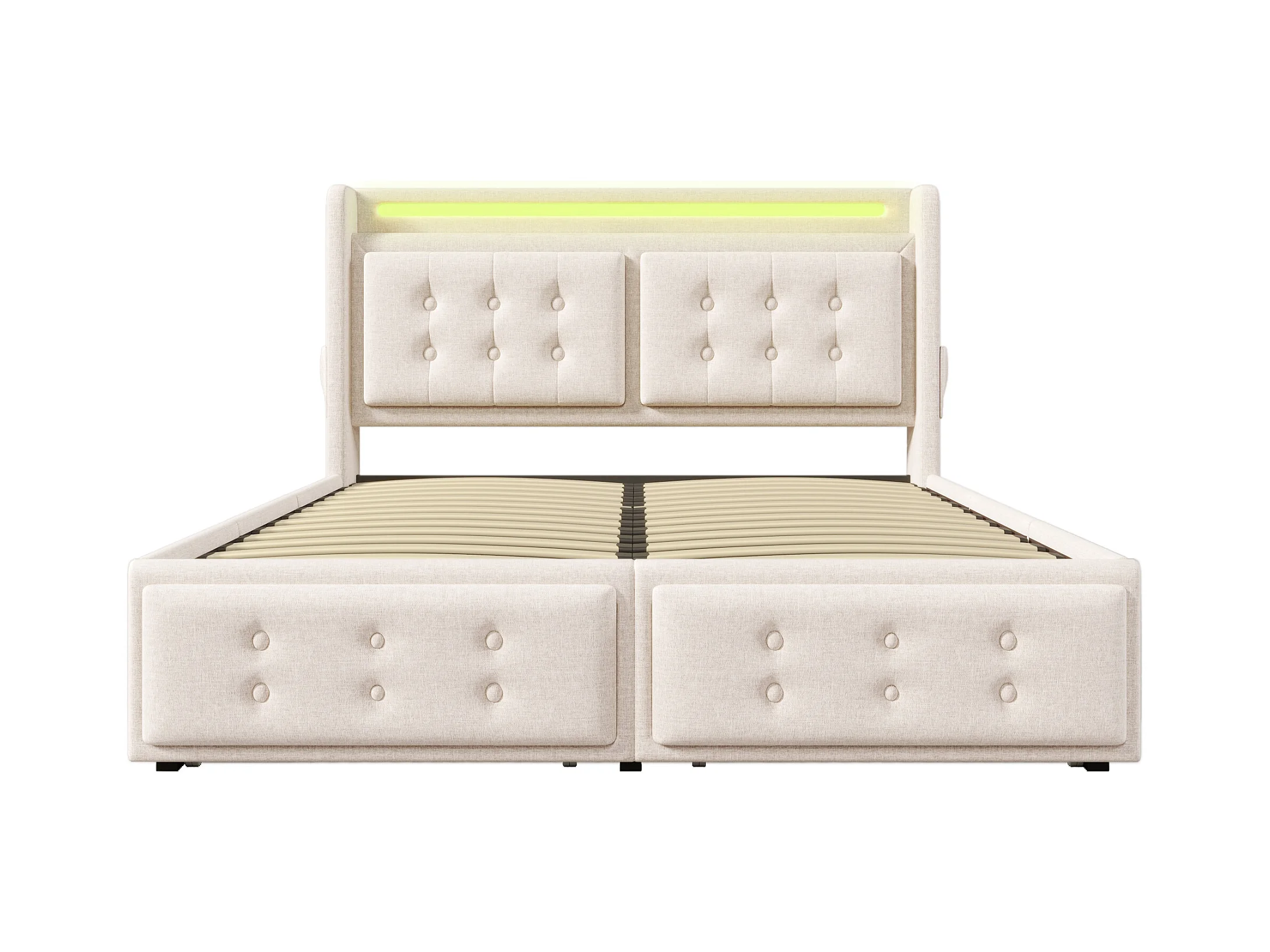 Lit double 160x200 cm - Lit adulte avec LED et chargement USB - 4 tiroirs - lin coton beige