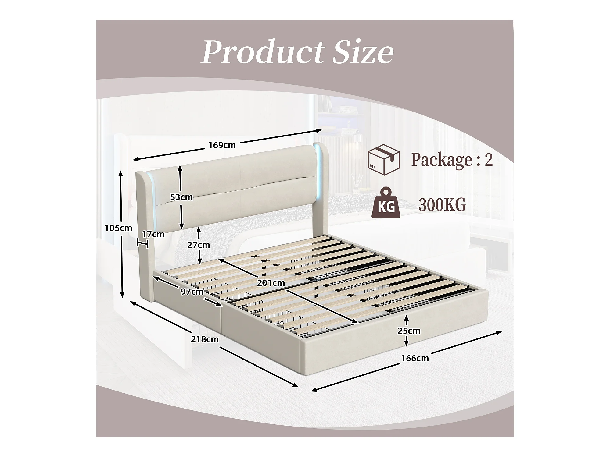 Lit Coffre 160×200 cm - Lit Rembourré en Velours Beige – Tête de Lit LED – 4 Tiroirs – Ports USB/USB‑C – Style Contemporain