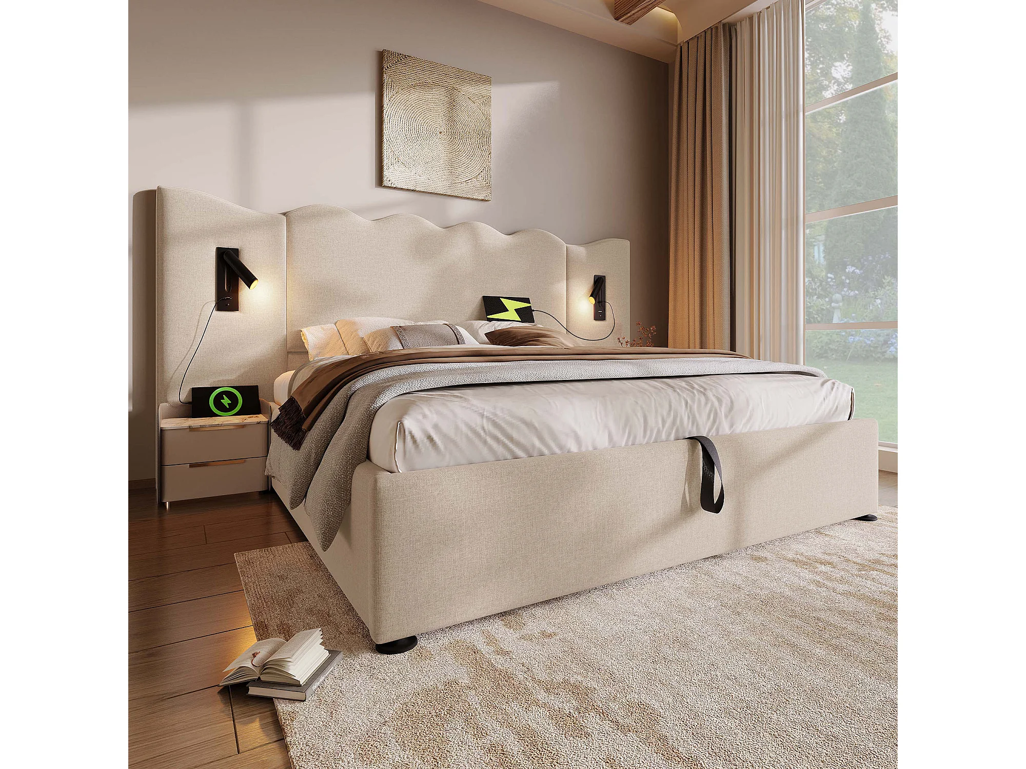 Lit double 180×200 cm en lin beige avec lampe de lecture et fonction de charge USB Type-C, lit de rangement en bois massif et métal