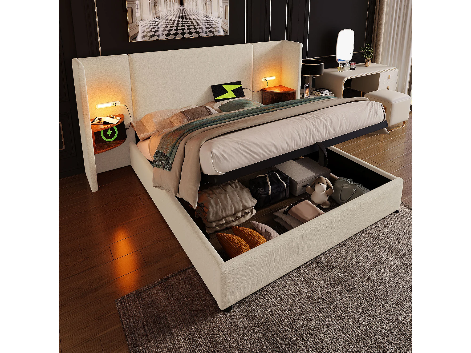 Lit double 180×200 cm en lin beige avec tête de lit multifonctionnelle, lampe de lecture et ports USB