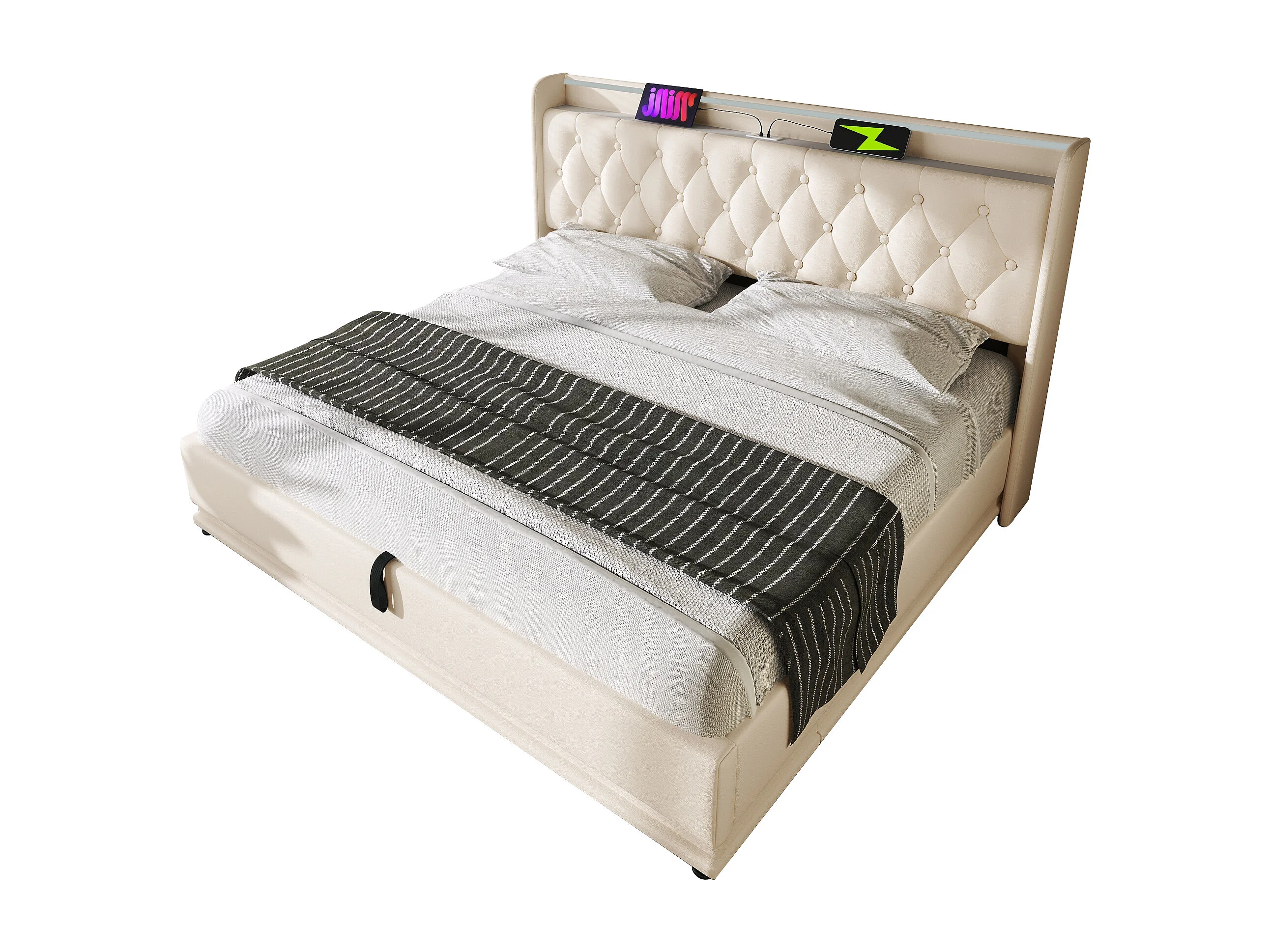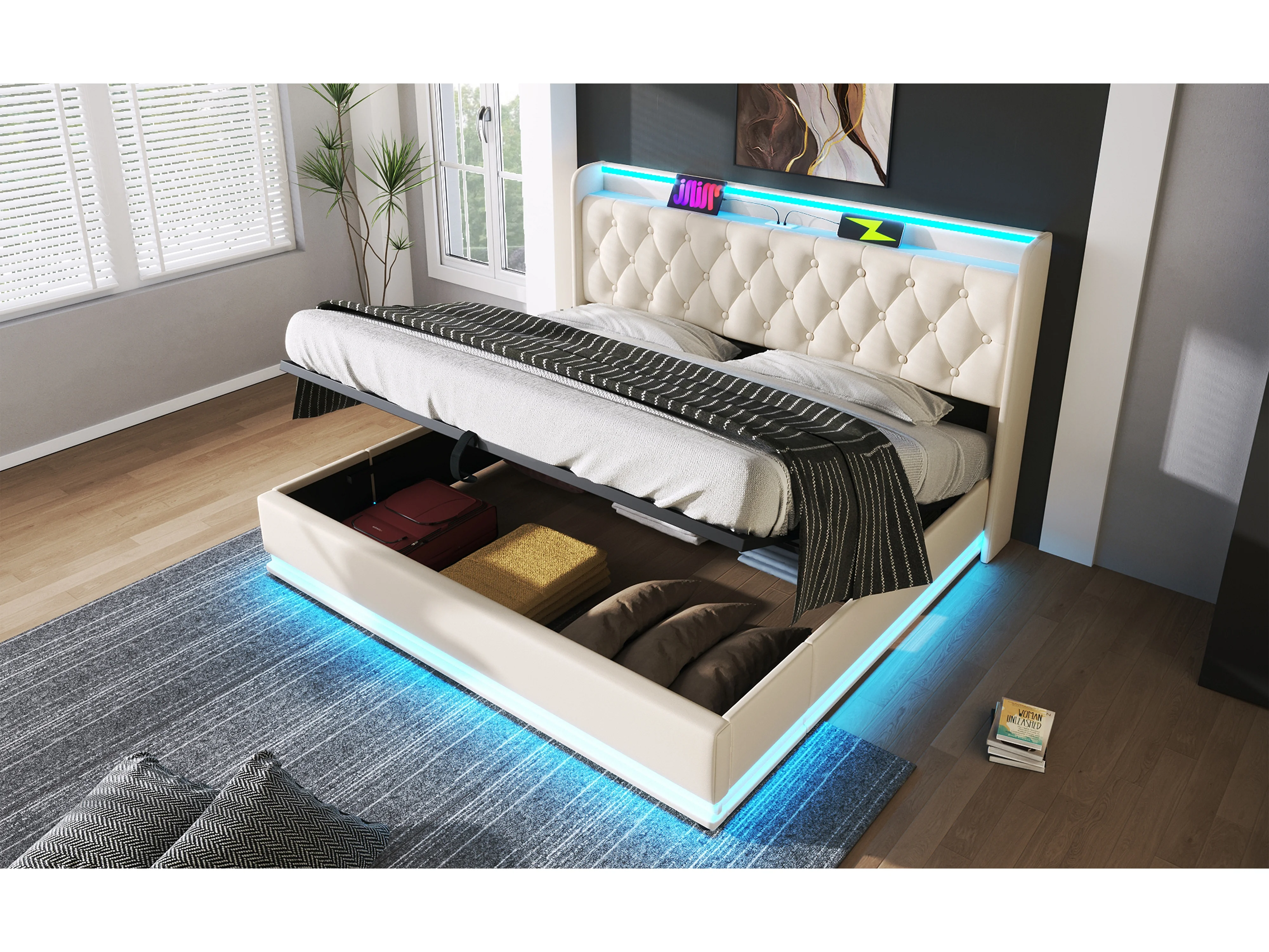 Lit double 180×200 cm en PU blanc avec éclairage LED 360°, tête de lit rembourrée et port USB