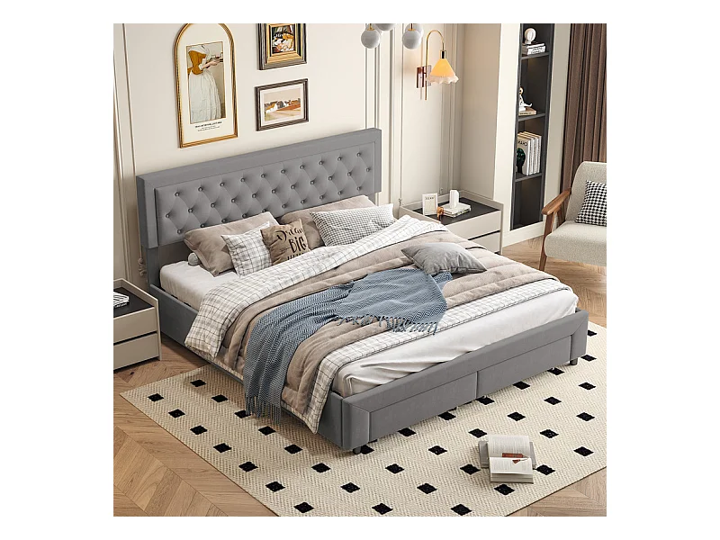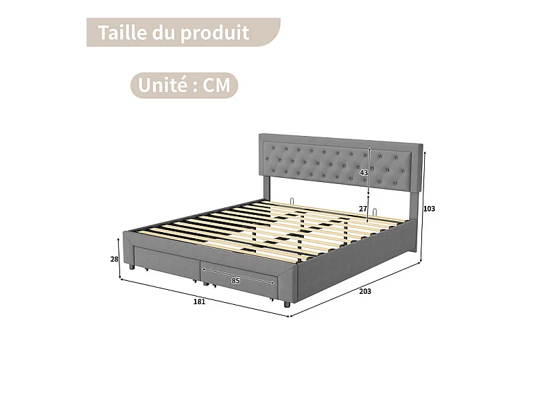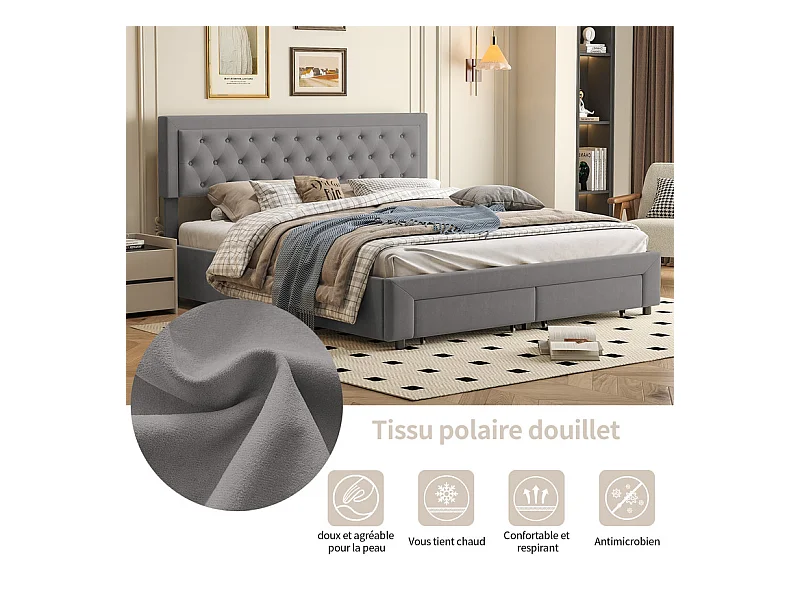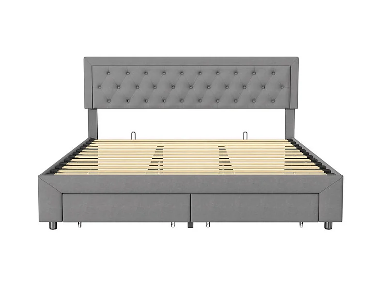 Lit Double avec Rangements Tiroir et Coffre Pneumatique - 180x200 cm - Tête de Lit Velours Cordonné Gris - Structure Métal et Bois