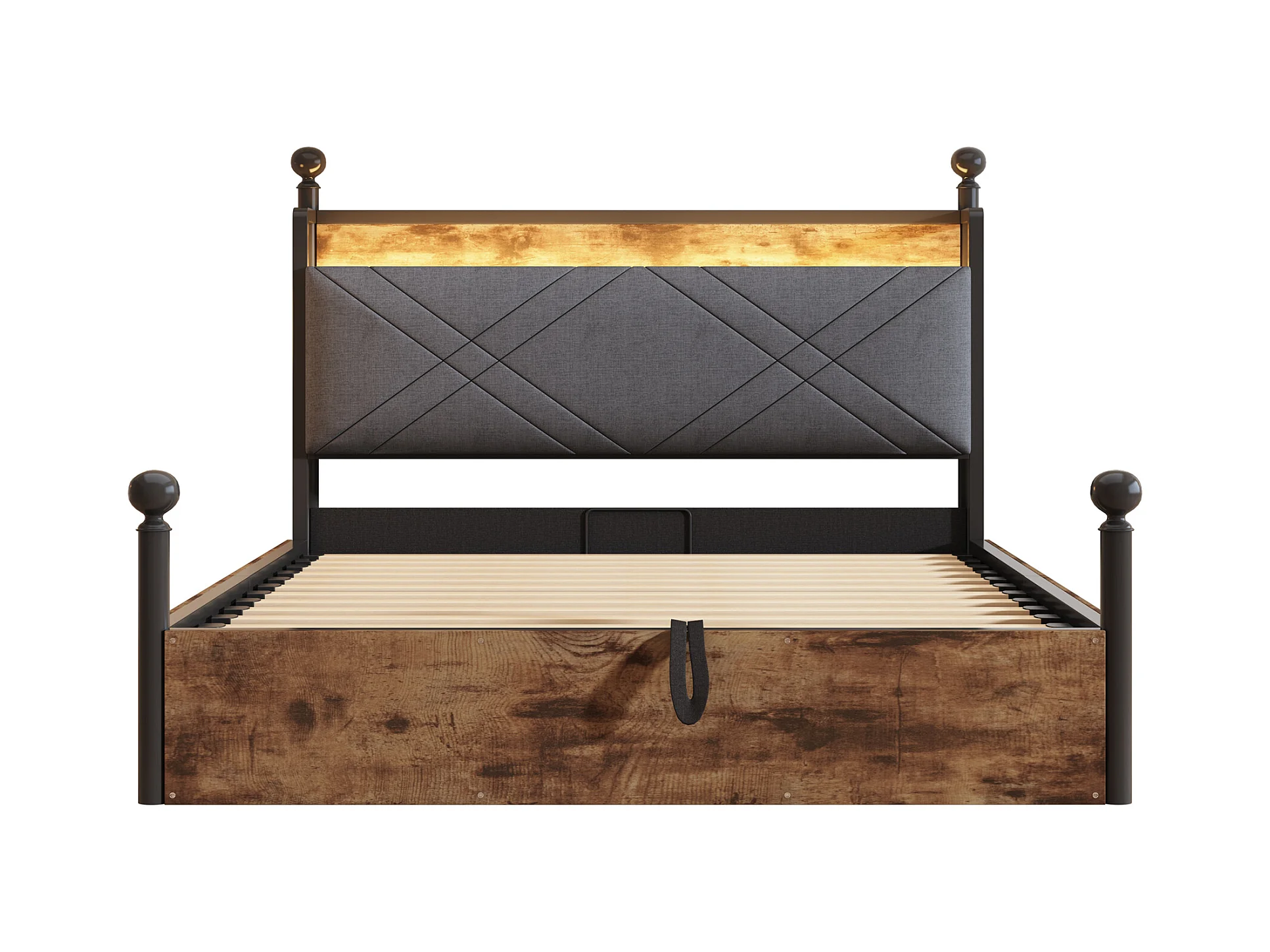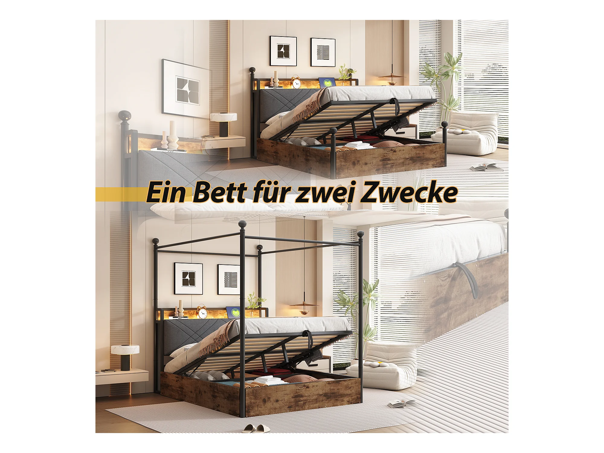 Lit double coffre 140x190 cm - avec baldaquin en métal - montants amovibles - avec LED et port USB/Type-C - Noir