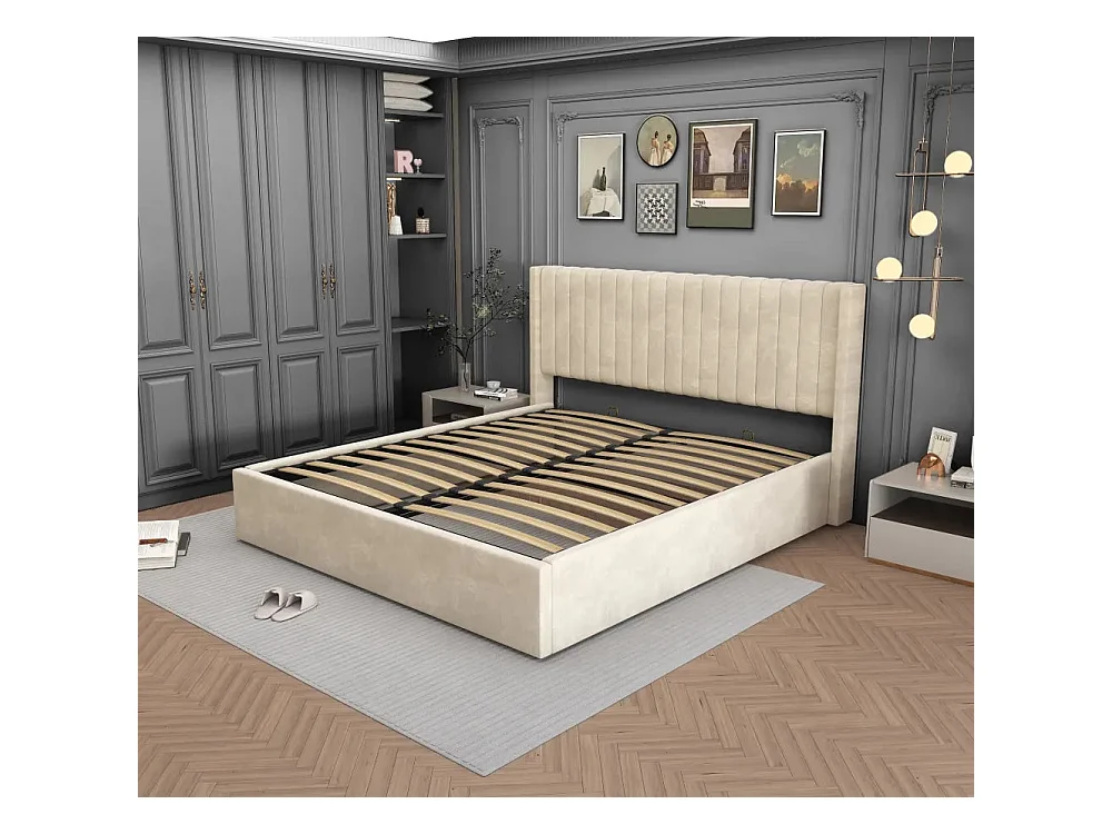 LIT DOUBLE COFFRE BEIGE CAMILLE BEIGE en velours 180X200CM