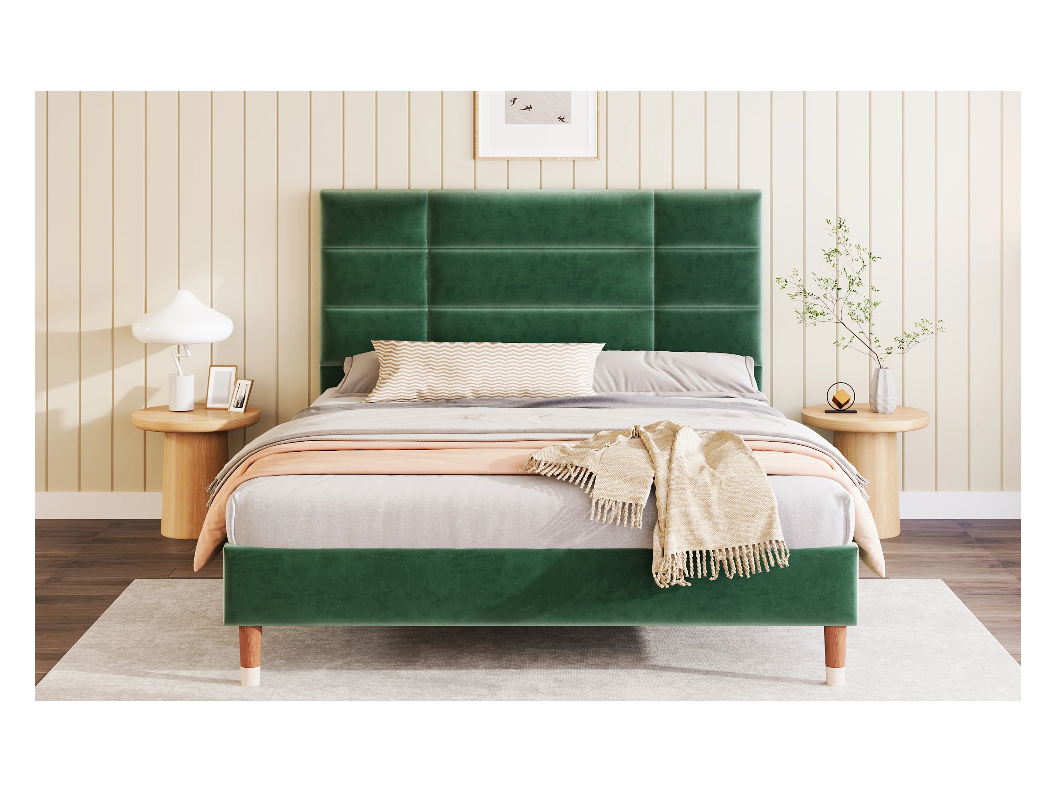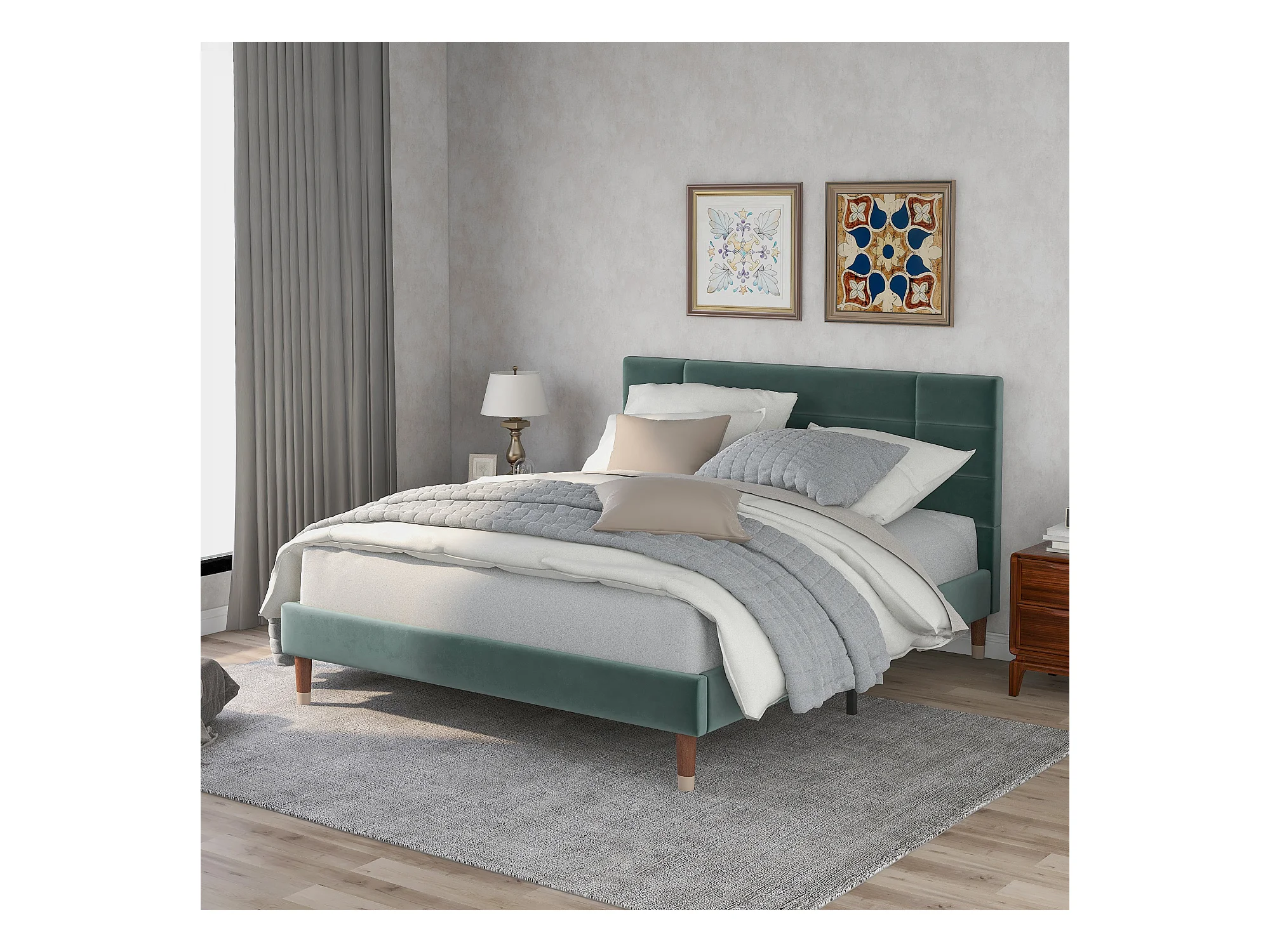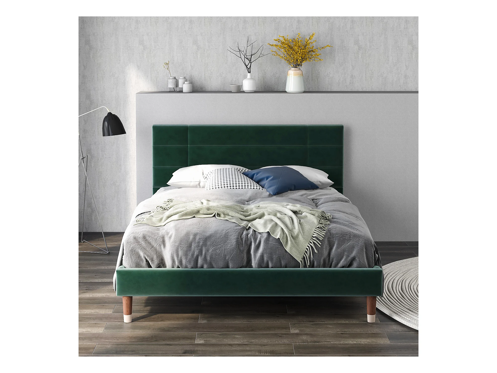 Lit double en velours vert 140x200 cm avec tête de lit et sommier, design moderne et élégant