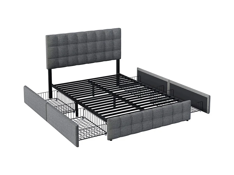 Lit double + matelas 140x200cm avec 4 tiroirs - tête de lit réglable - cadre à latte en métal - Lin - Gris