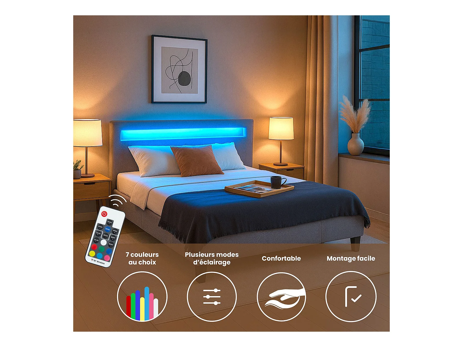 Lit LED double 140x190 cm avec sommier, tête de lit confortable, lit 1 place revêtement en tissu gris, RIOJA