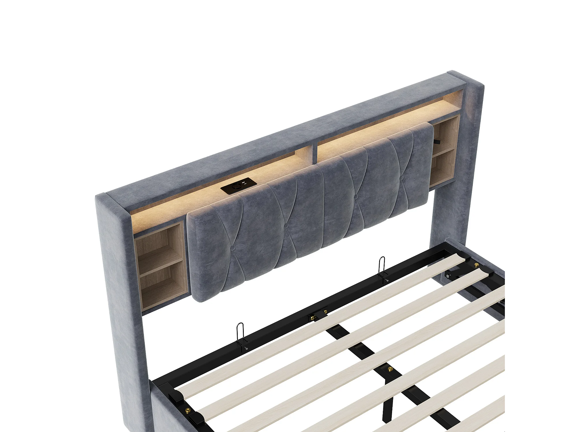 Lit Double Rembourré Lit 140x200cm, Cadre de Lit, Lit Coffre ,avec Sommier LED et USB, avec Rangement sous Lit, Velours, Gris (sans Matelas)