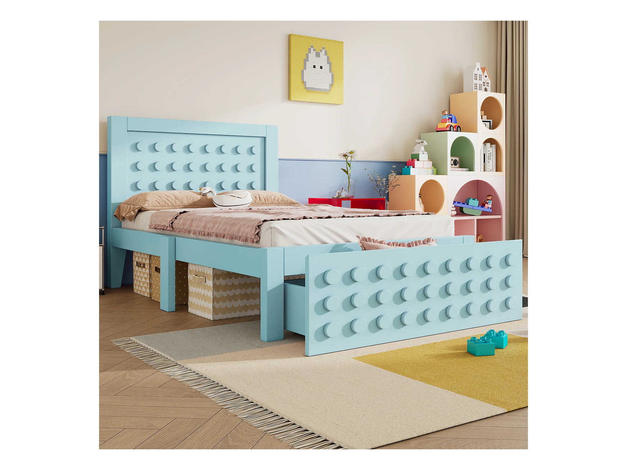 Lit en bois 90x200 cm, lit enfant design blocs, cadre massif avec sommier et espace de rangement, sans matelas
