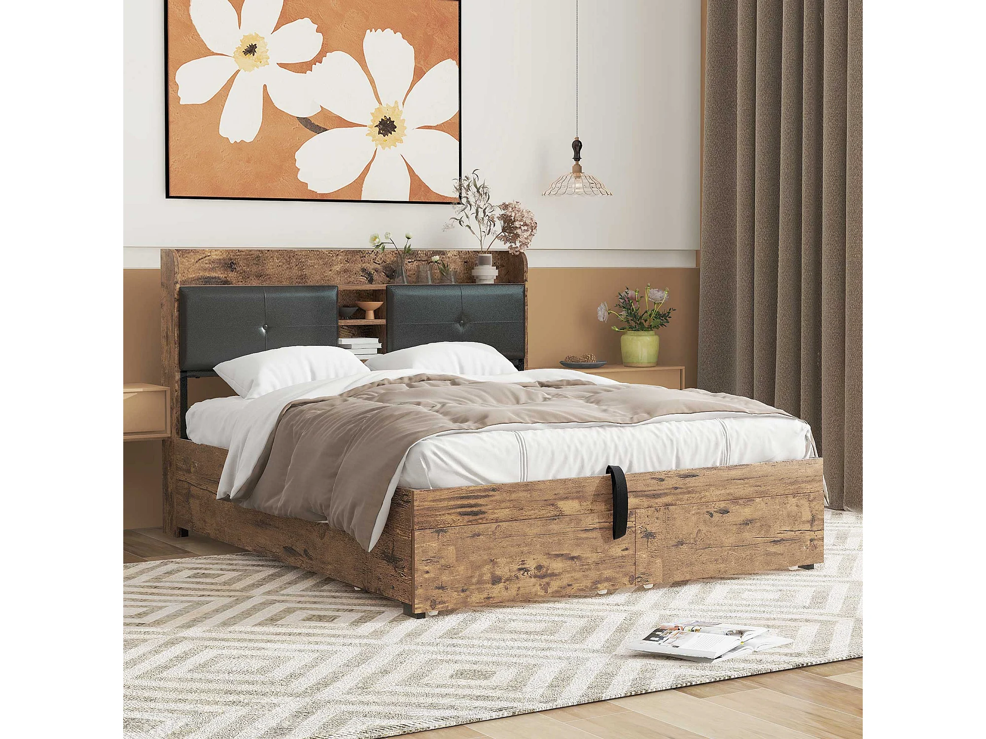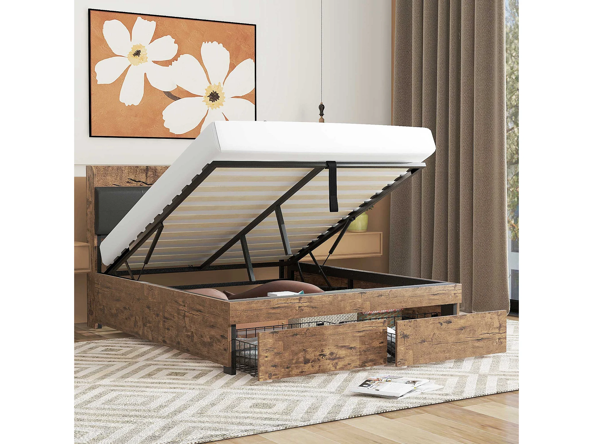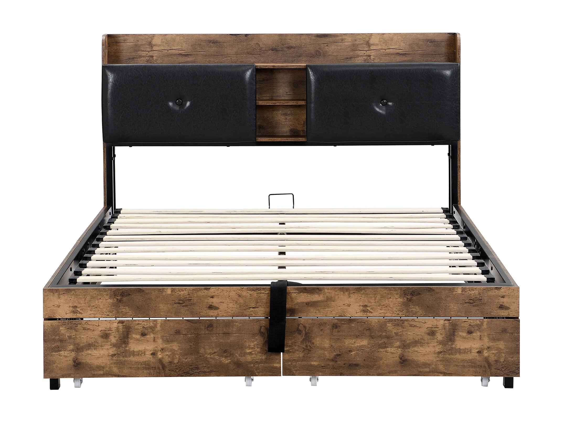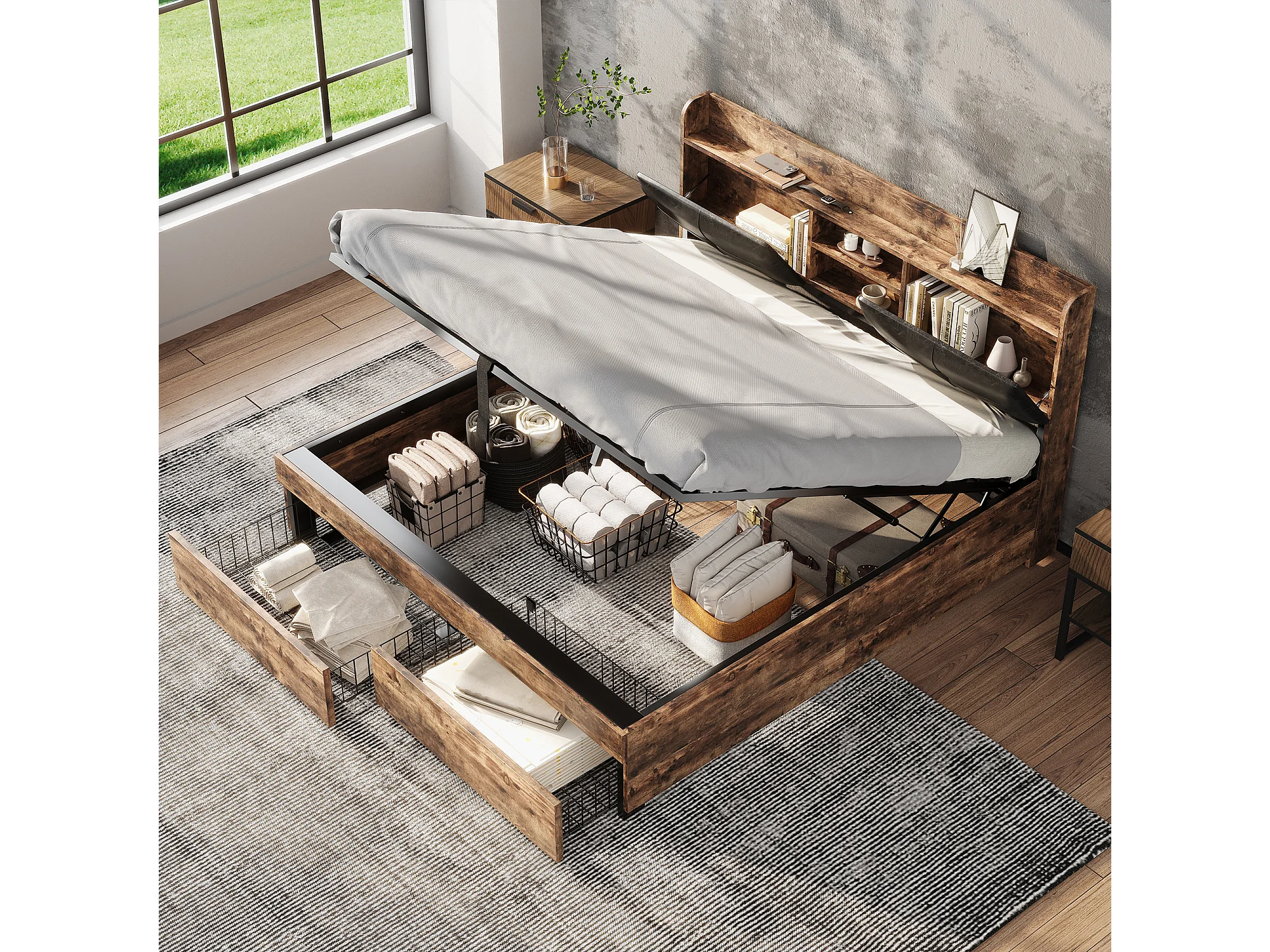 Lit en métal 140 x 200 cm avec tête de lit de rangement, 2 tiroirs et sommier à lattes en métal