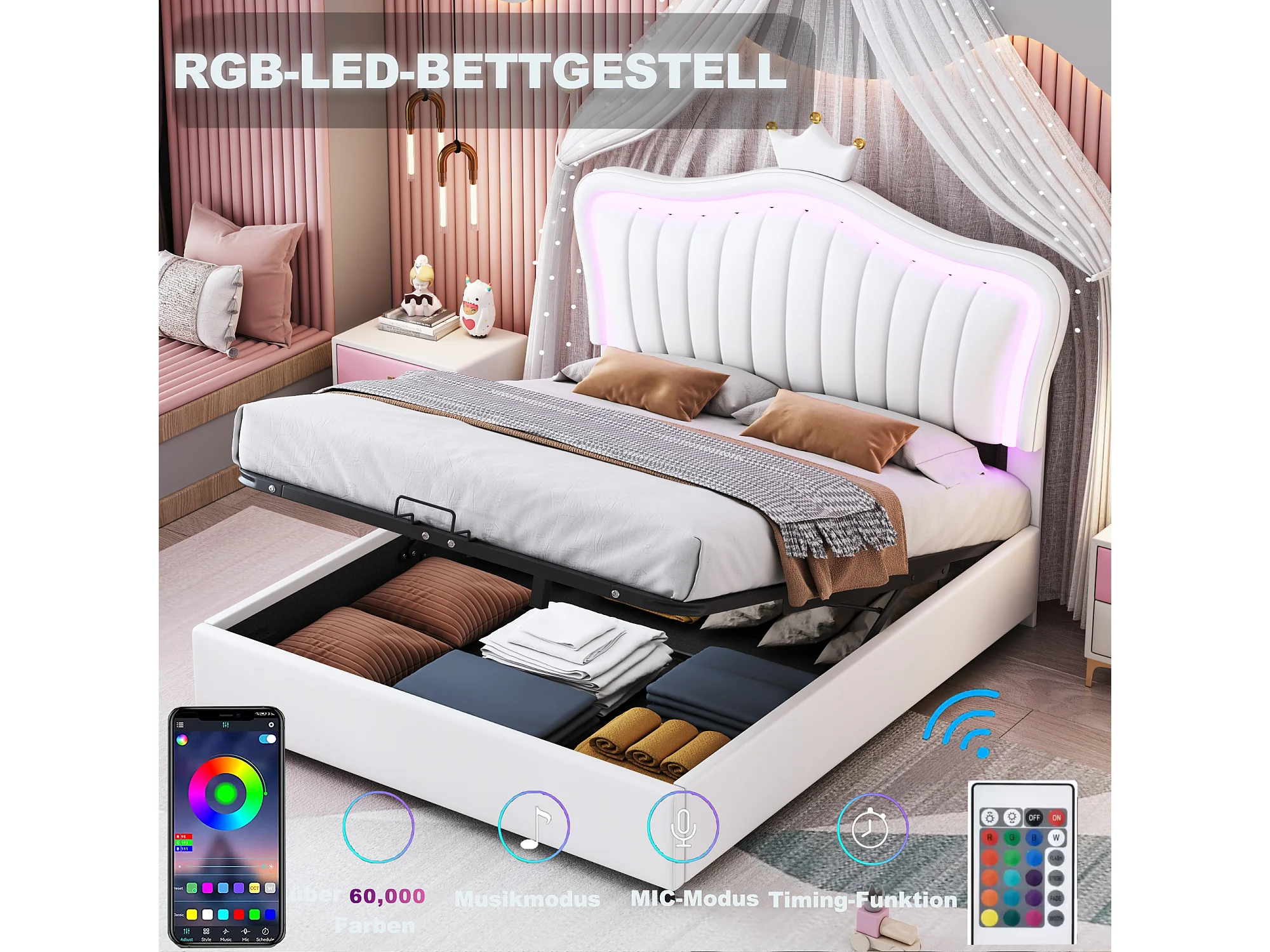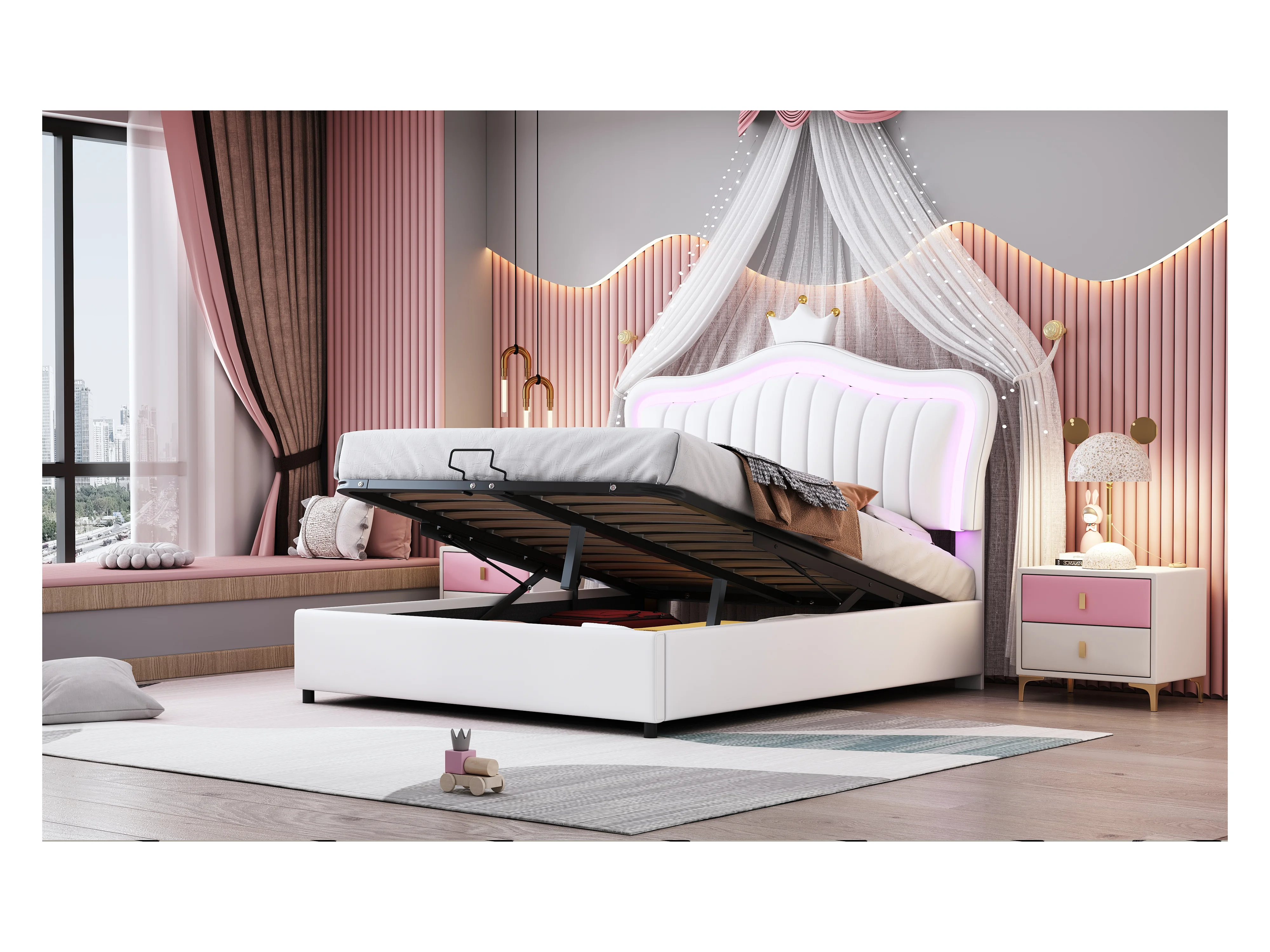 Lit enfant 140x200 cm avec coffre hydraulique, tête de lit couronnée, PU cuir blanc, LED intégrées, sommier à lattes (203.5x150x126.5 cm)