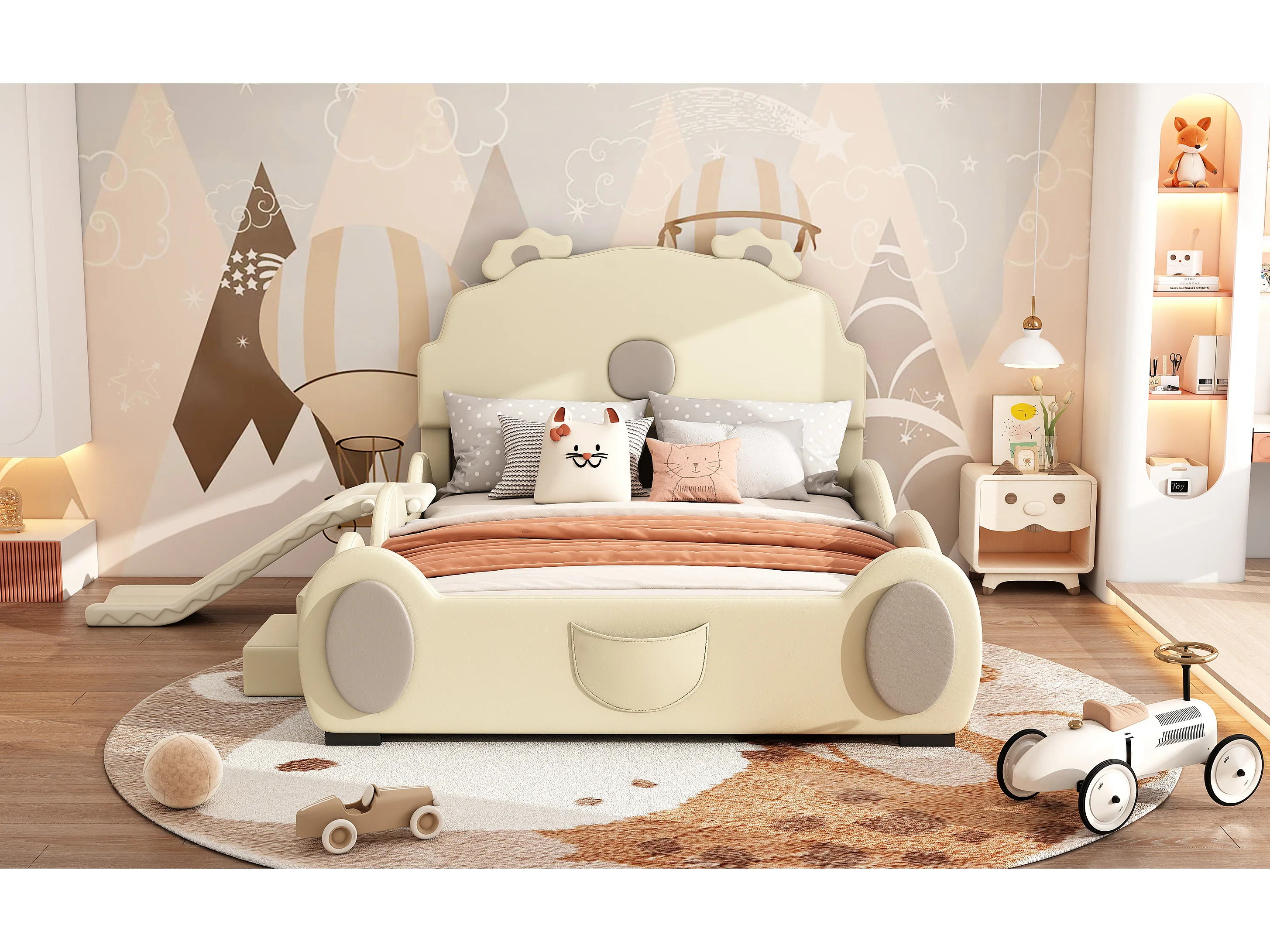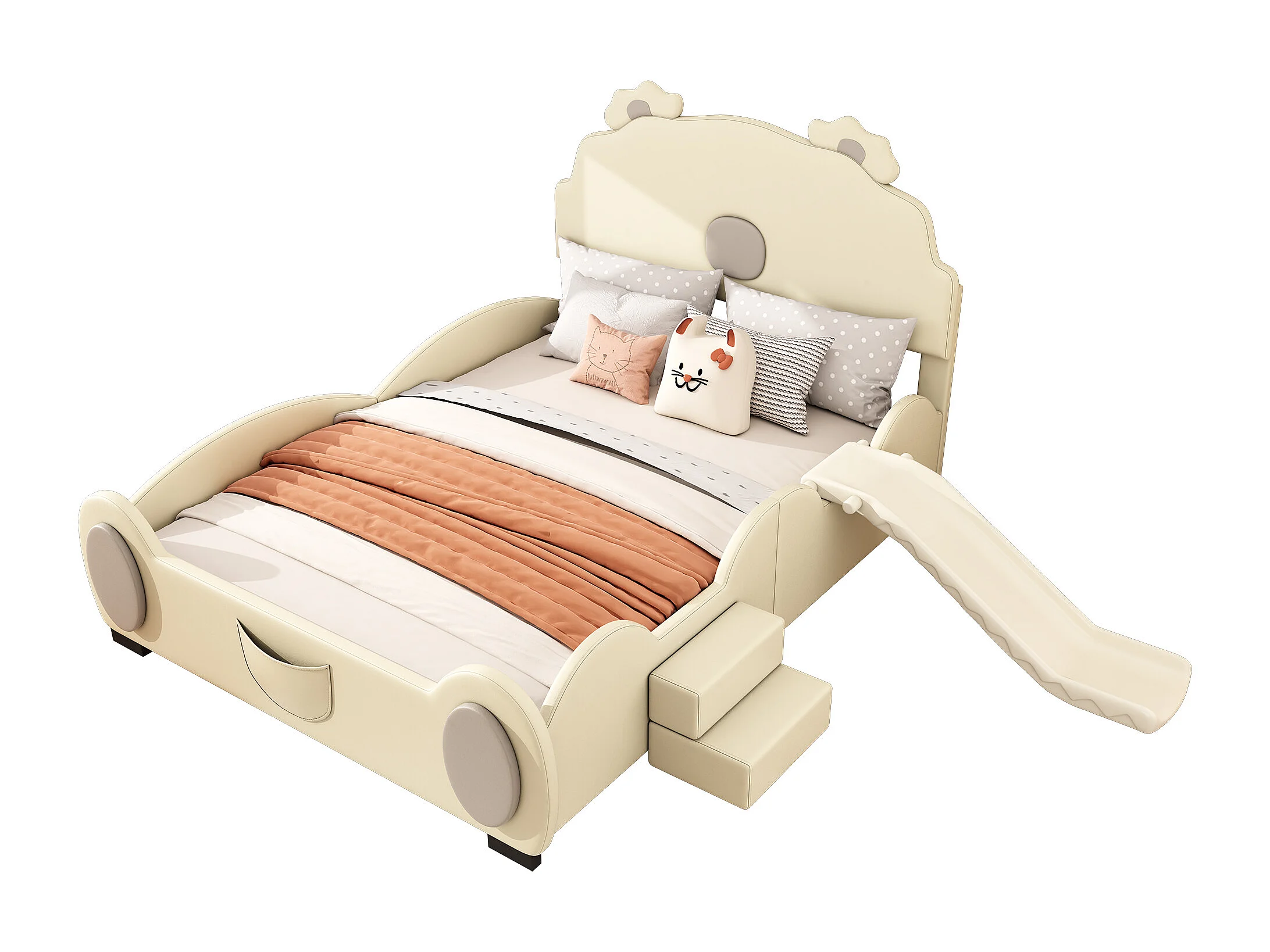 Lit enfant 140x200 cm ours beige, en PU facile à nettoyer, avec toboggan, échelle et forme mignonne, sans matelas