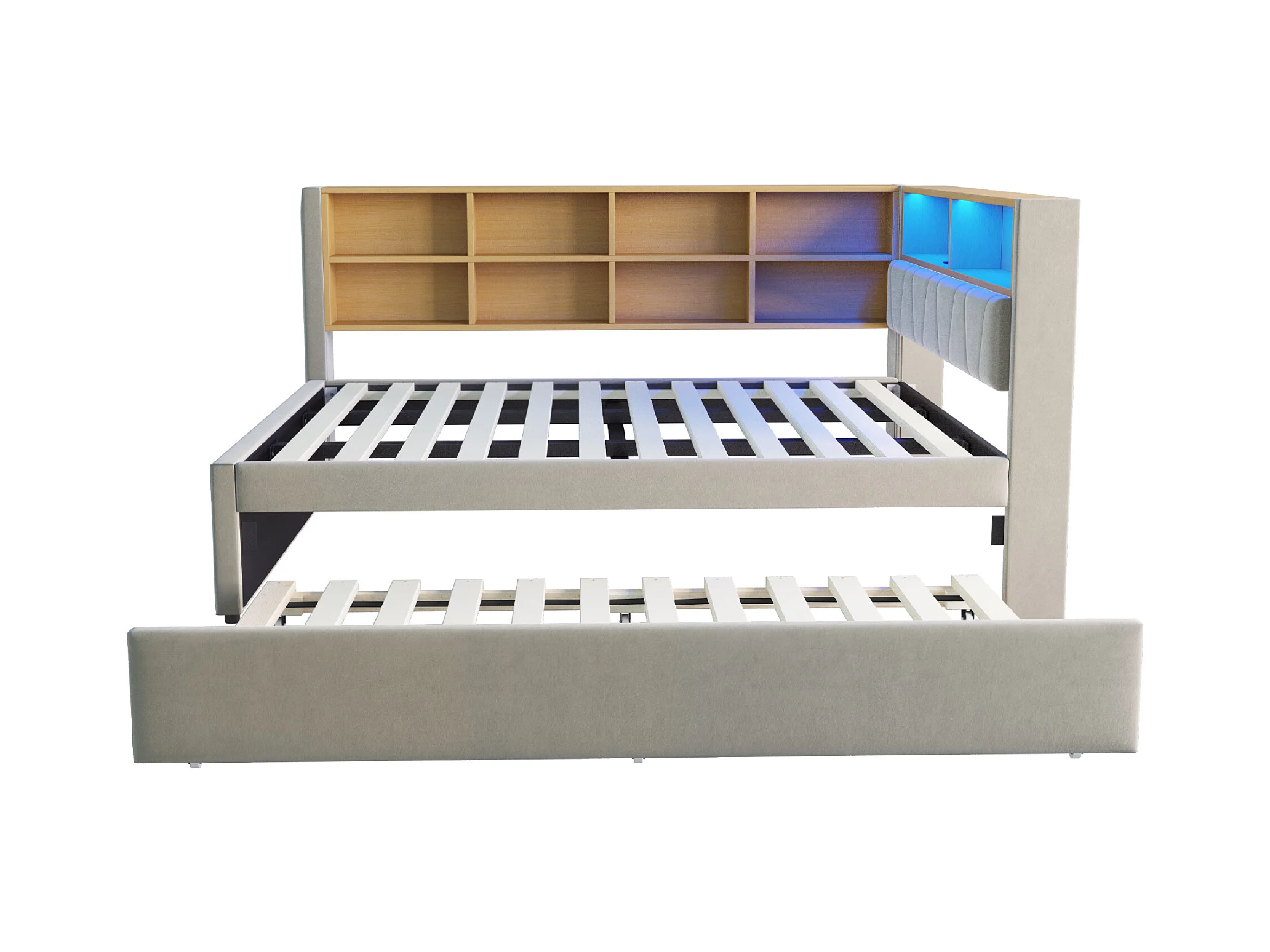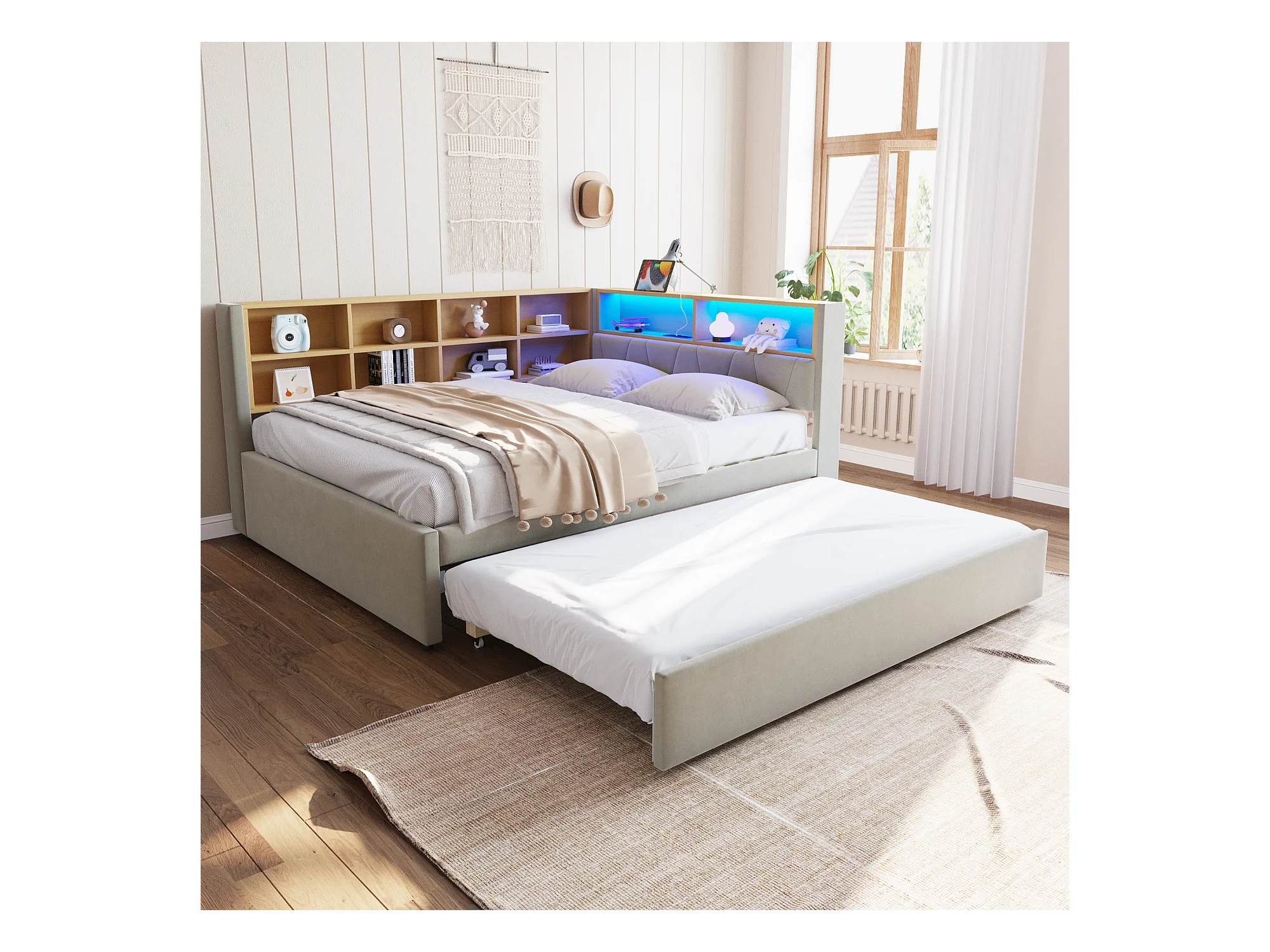 Lit enfant 140x200cm avec LED/USB et étagères de rangement, lit gigogne 90x190cm, en flanelle gris clair, sans matelas